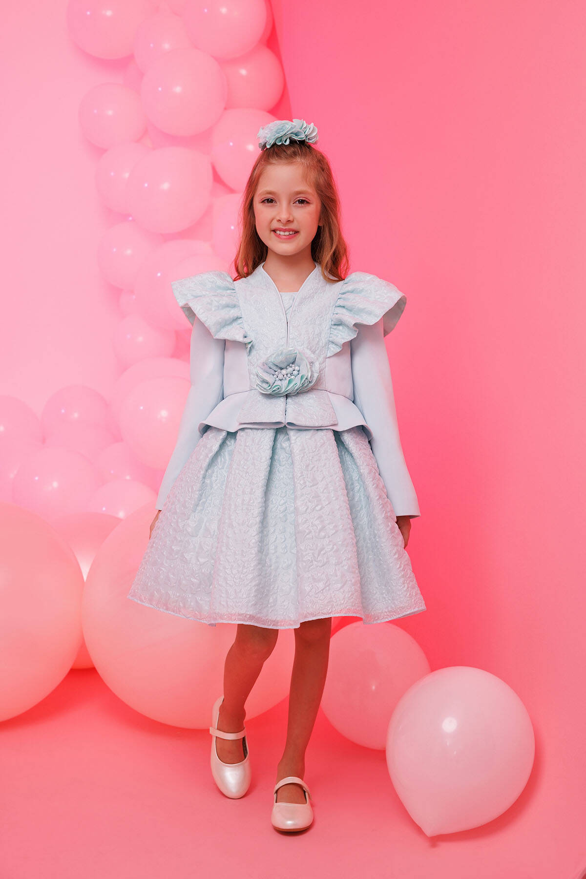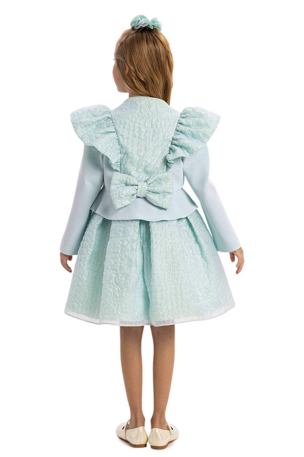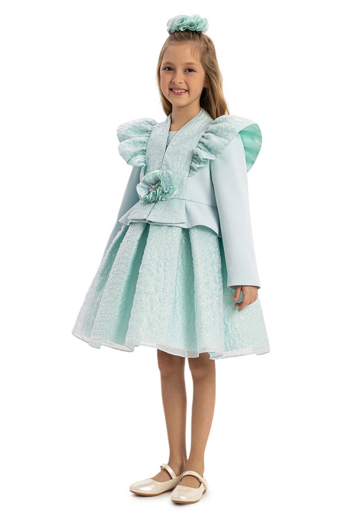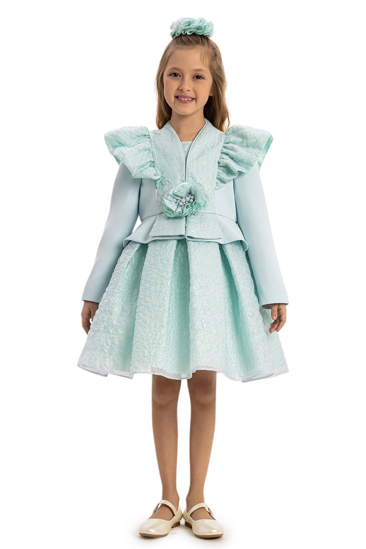 Elevate your little one's style with this enchanting three-piece set, perfect for special occasions. This set includes a sleeveless dress, a stylishly ruffled jacket, and a matching hair accessory. The pastel tones of ecru, powder, and blue add a touch of elegance, while the exquisite floral embellishments and bow accents complete the look. Designed with lightweight and comfortable fabrics, this set ensures your child feels and looks her best all day long, whether at weddings, birthdays, or celebrations.