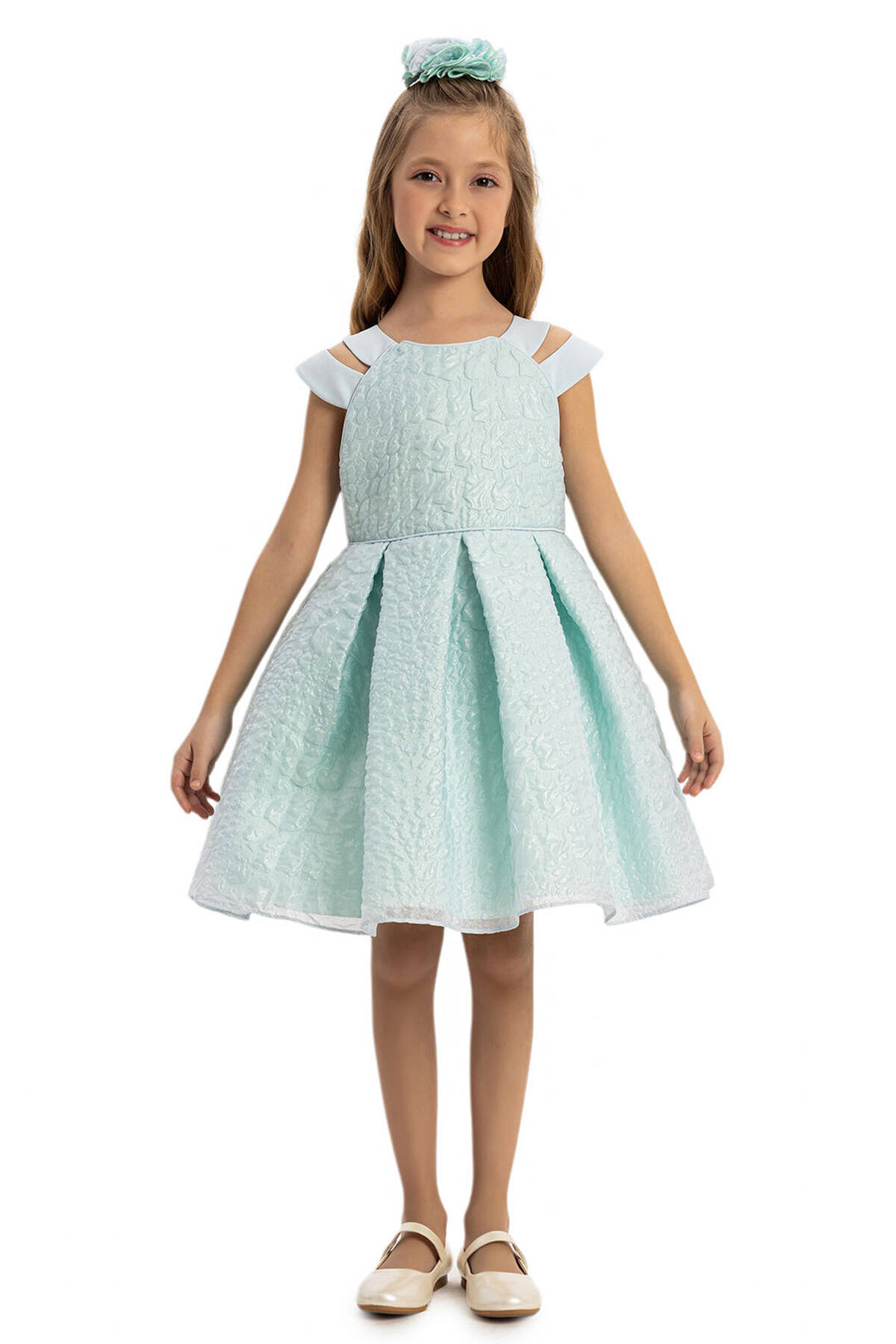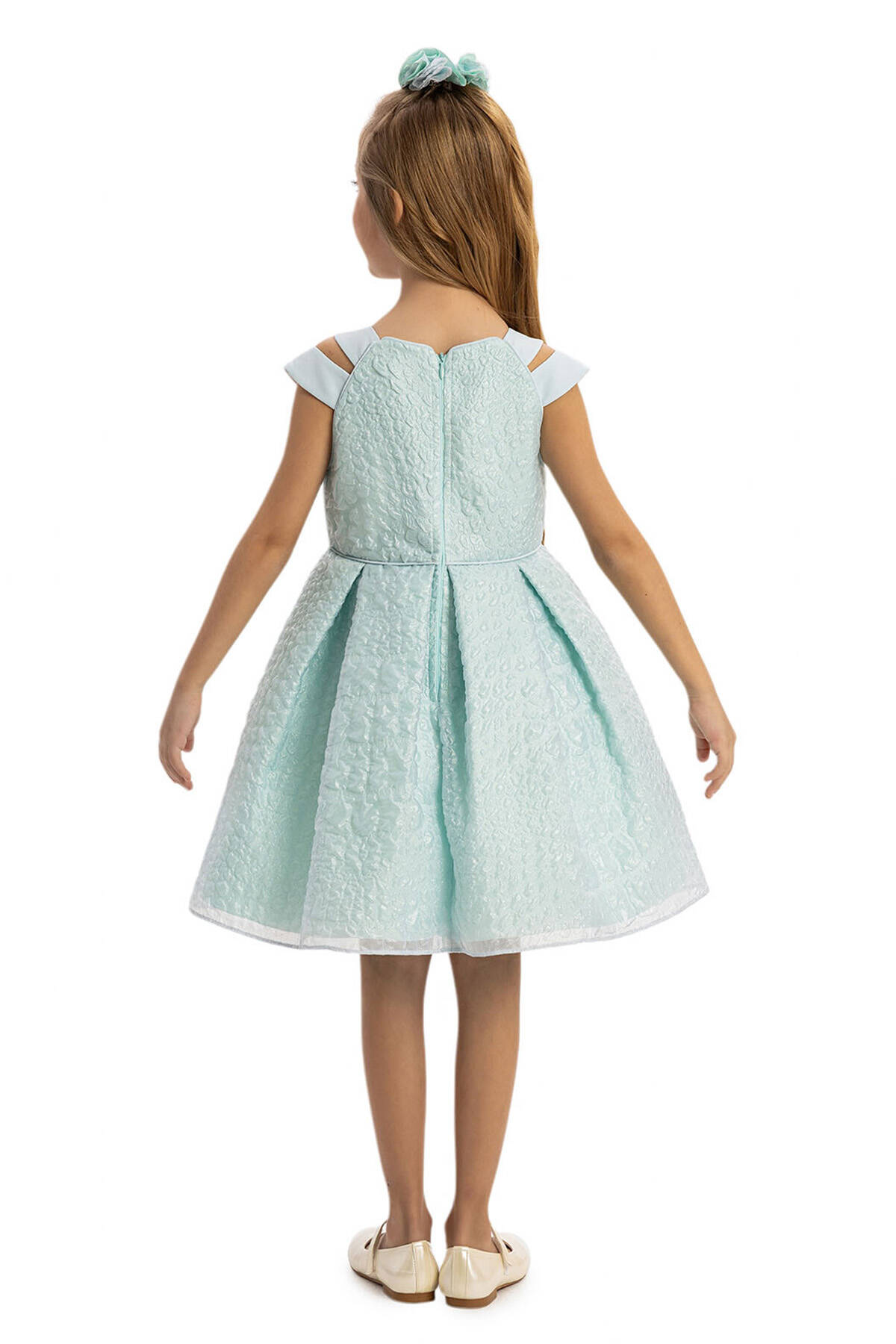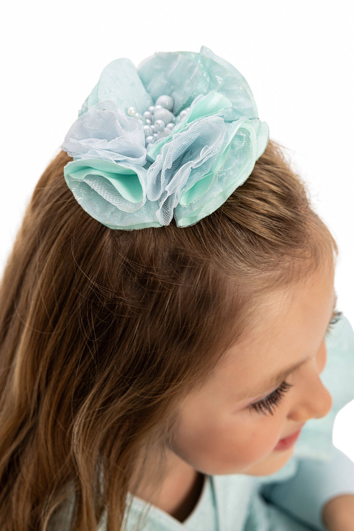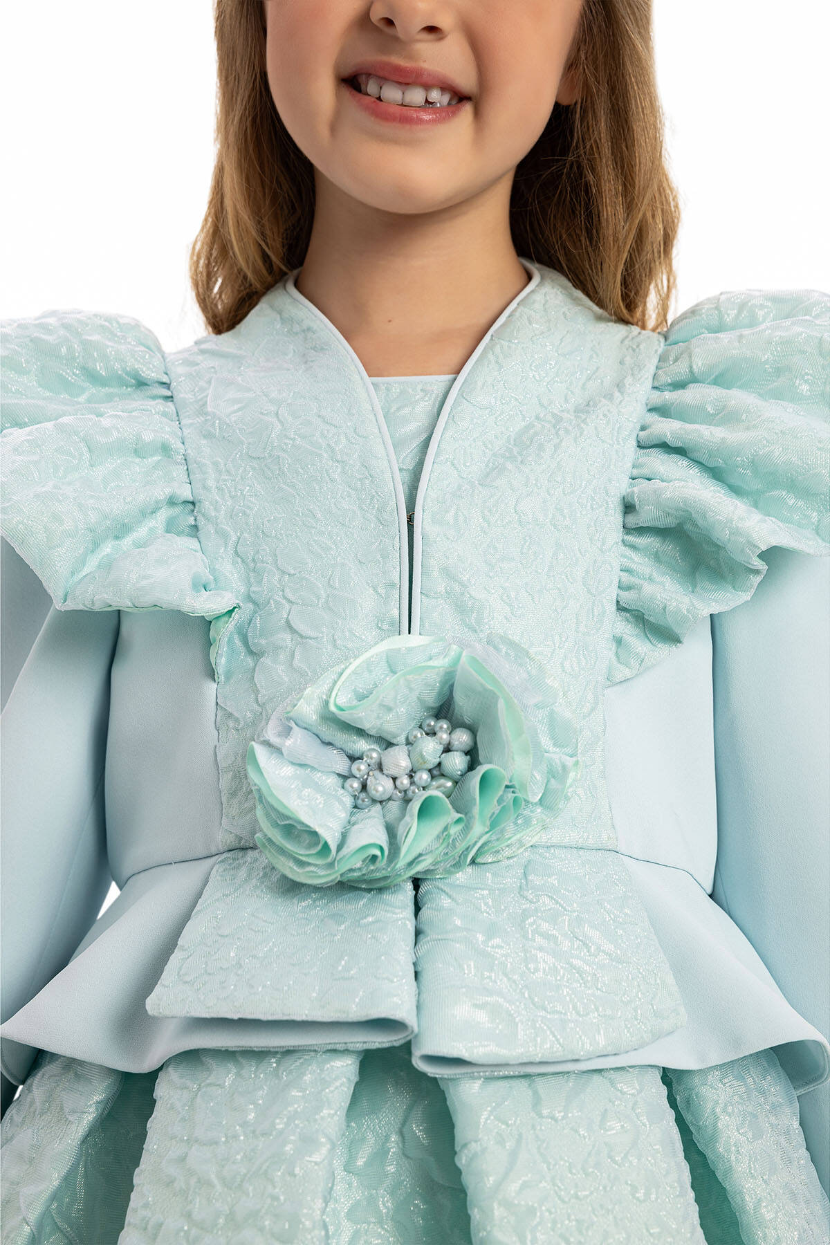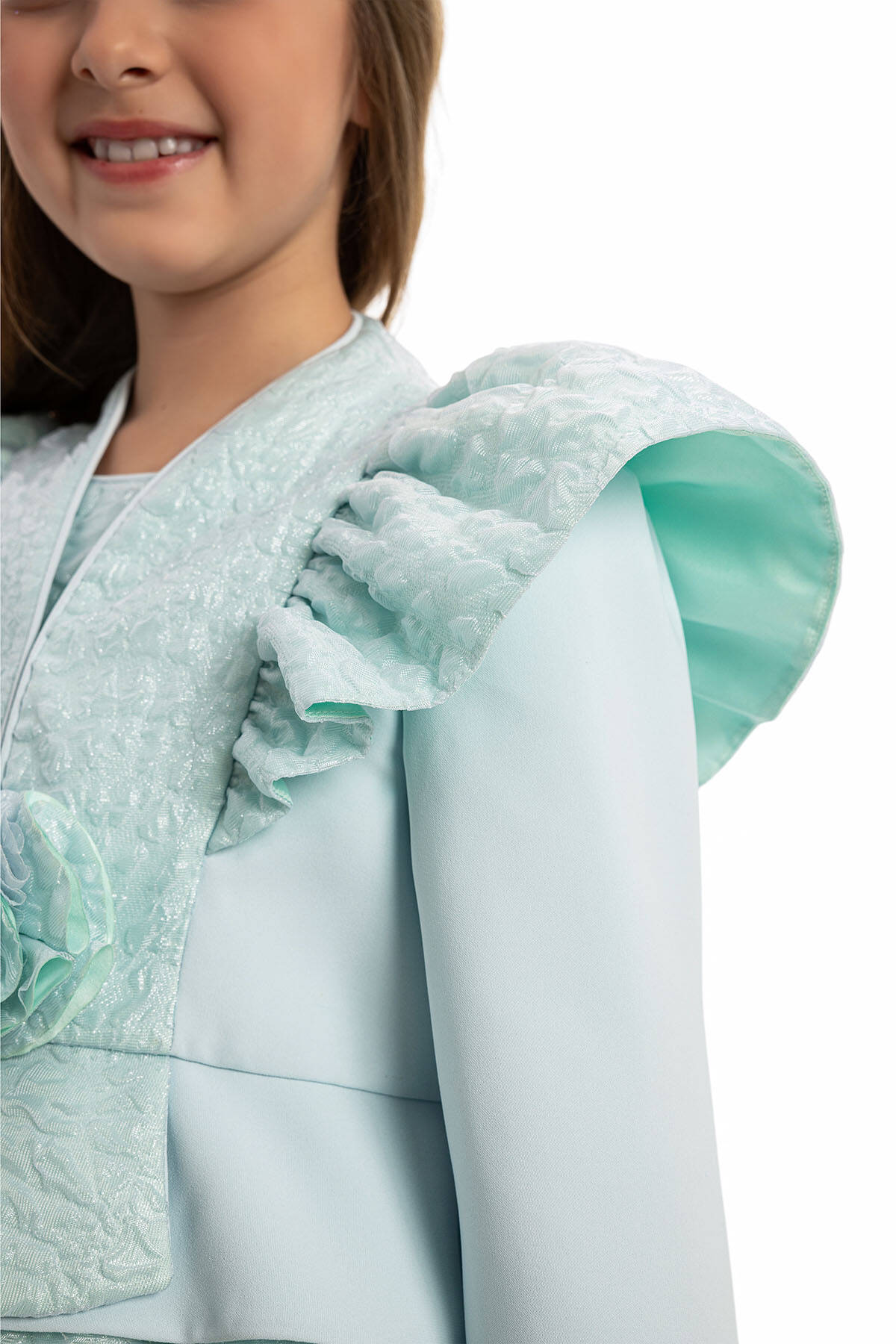 Elevate your little one's style with this enchanting three-piece set, perfect for special occasions. This set includes a sleeveless dress, a stylishly ruffled jacket, and a matching hair accessory. The pastel tones of ecru, powder, and blue add a touch of elegance, while the exquisite floral embellishments and bow accents complete the look. Designed with lightweight and comfortable fabrics, this set ensures your child feels and looks her best all day long, whether at weddings, birthdays, or celebrations.
