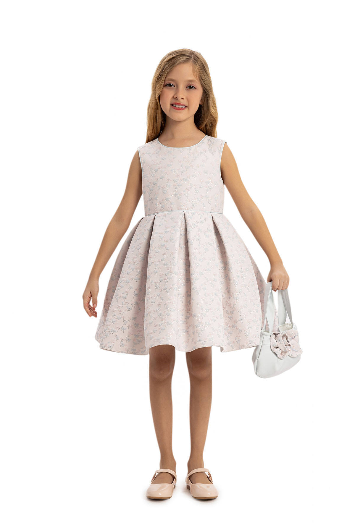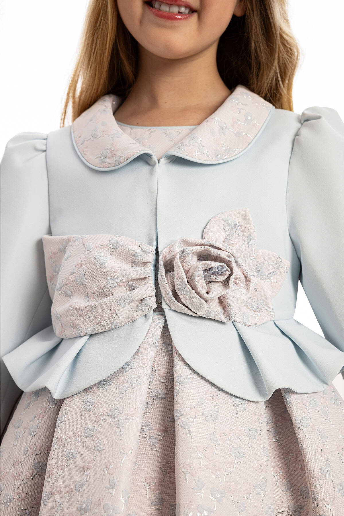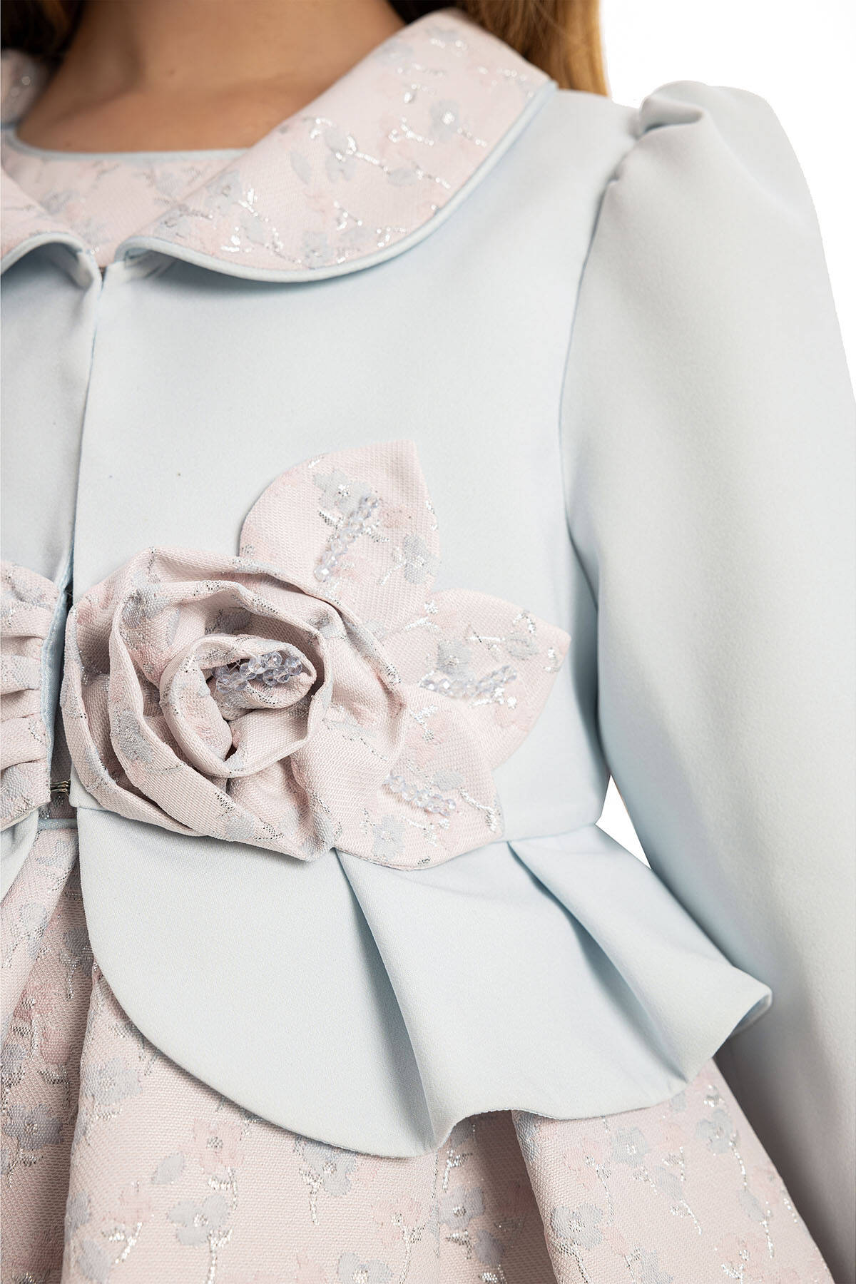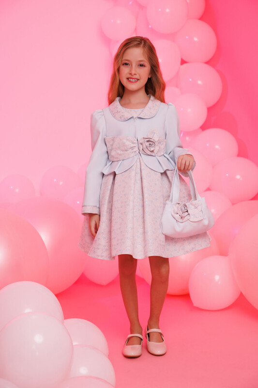 This elegant 3-piece set, including a dress, a chic jacket, and a delightful hair accessory, is perfect for adding a touch of grace to your little girl's wardrobe. Ideal for special occasions, this ensemble combines timeless design with superior craftsmanship. The dress is crafted from premium jacquard fabric featuring delicate floral patterns with subtle metallic accents, ensuring both style and durability.