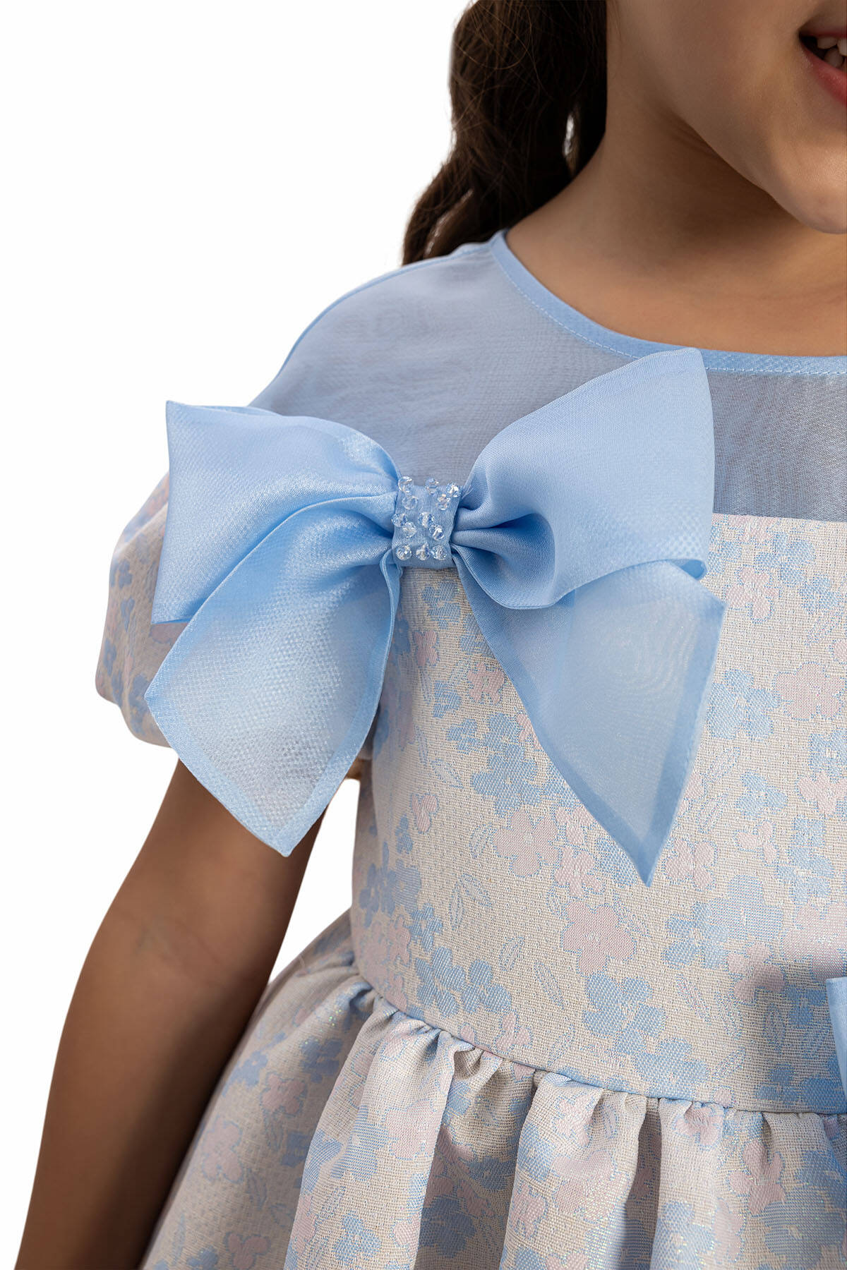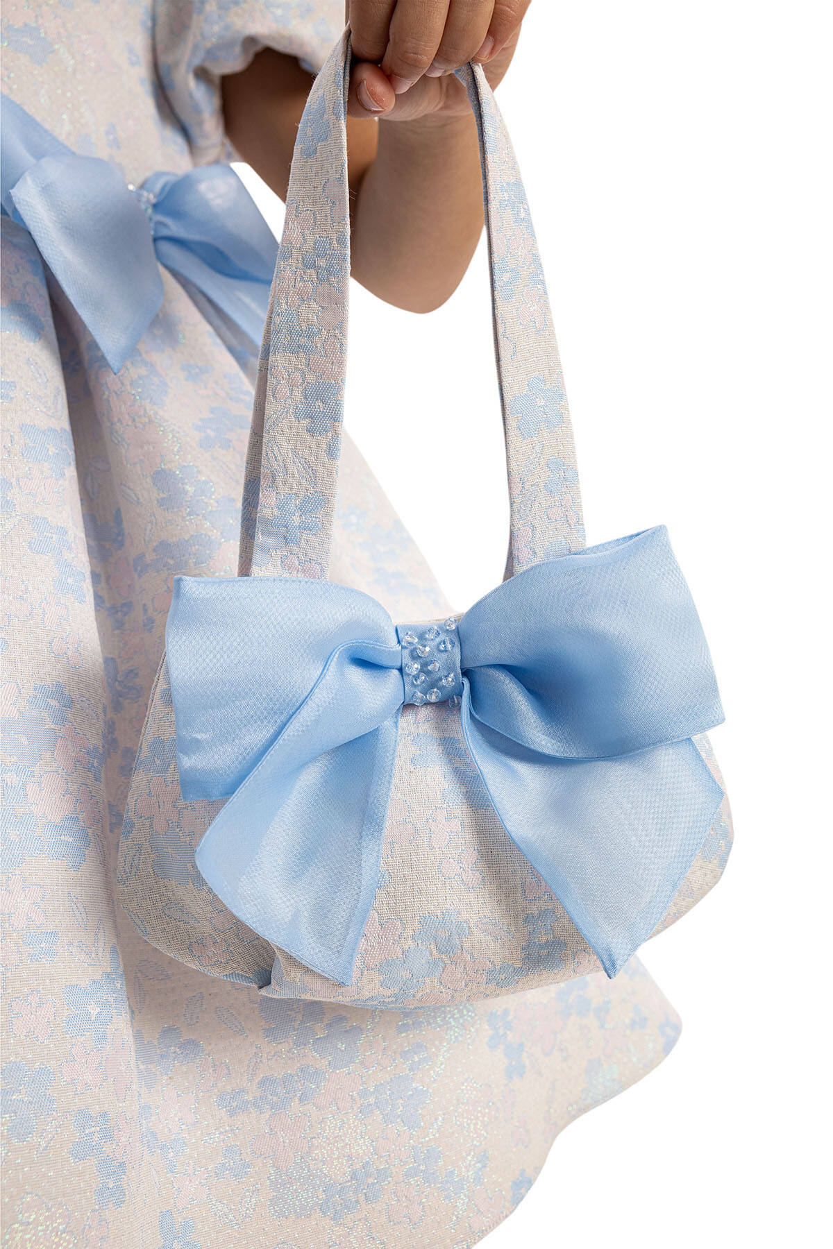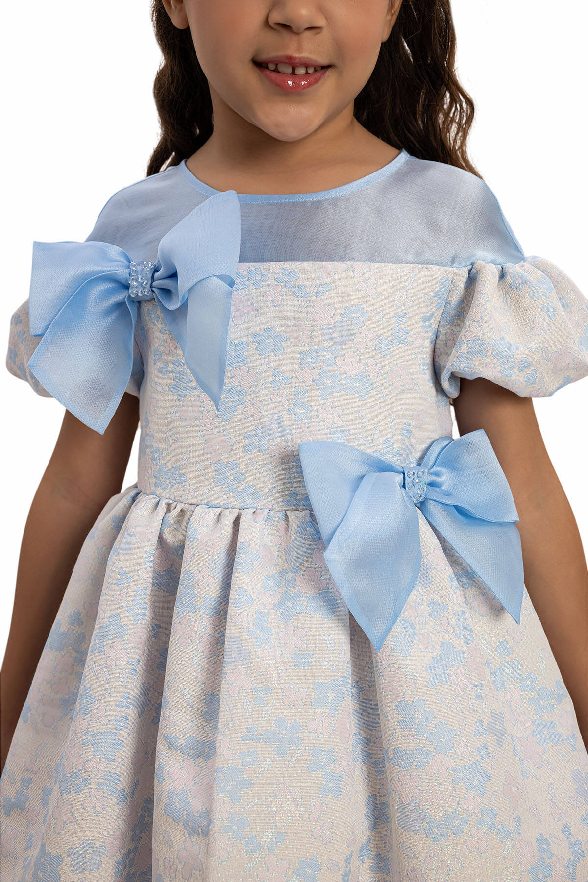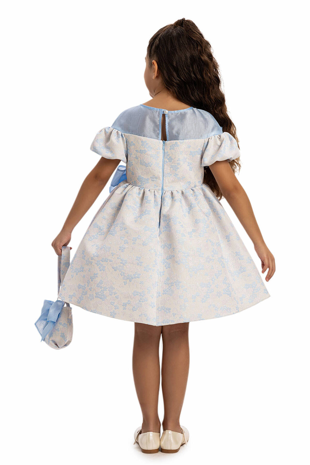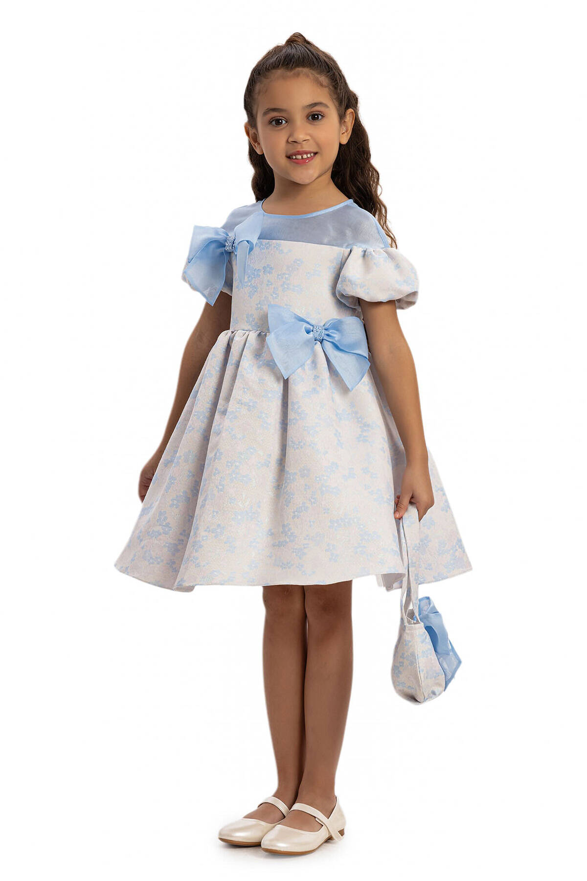 Brighten up your little girl's wardrobe with this delightful floral print dress, paired with a charming matching bag. Designed with pink/ blue floral pattern and elegant organza bows, this dress is perfect for special occasions or family gatherings. The sheer yoke detail and puff sleeves add a touch of sophistication, while the lightweight, comfortable fabric ensures ease of movement. The coordinating bag completes the set, making it a wonderful choice for birthdays, celebrations, or any event that calls for a little extra sparkle.