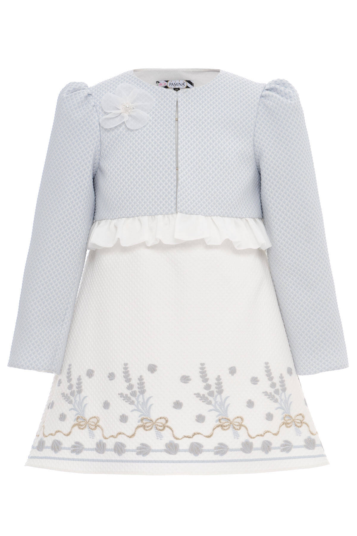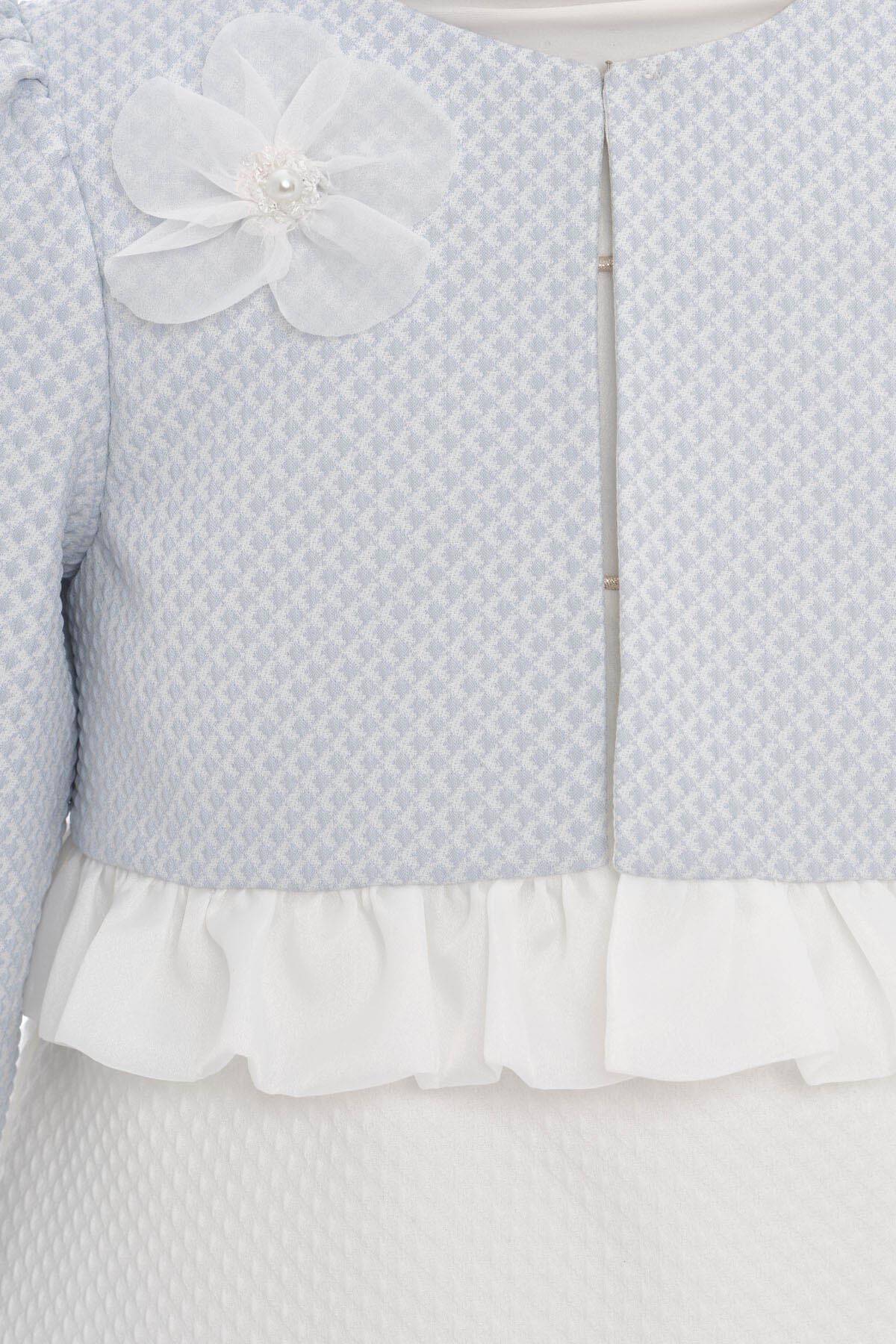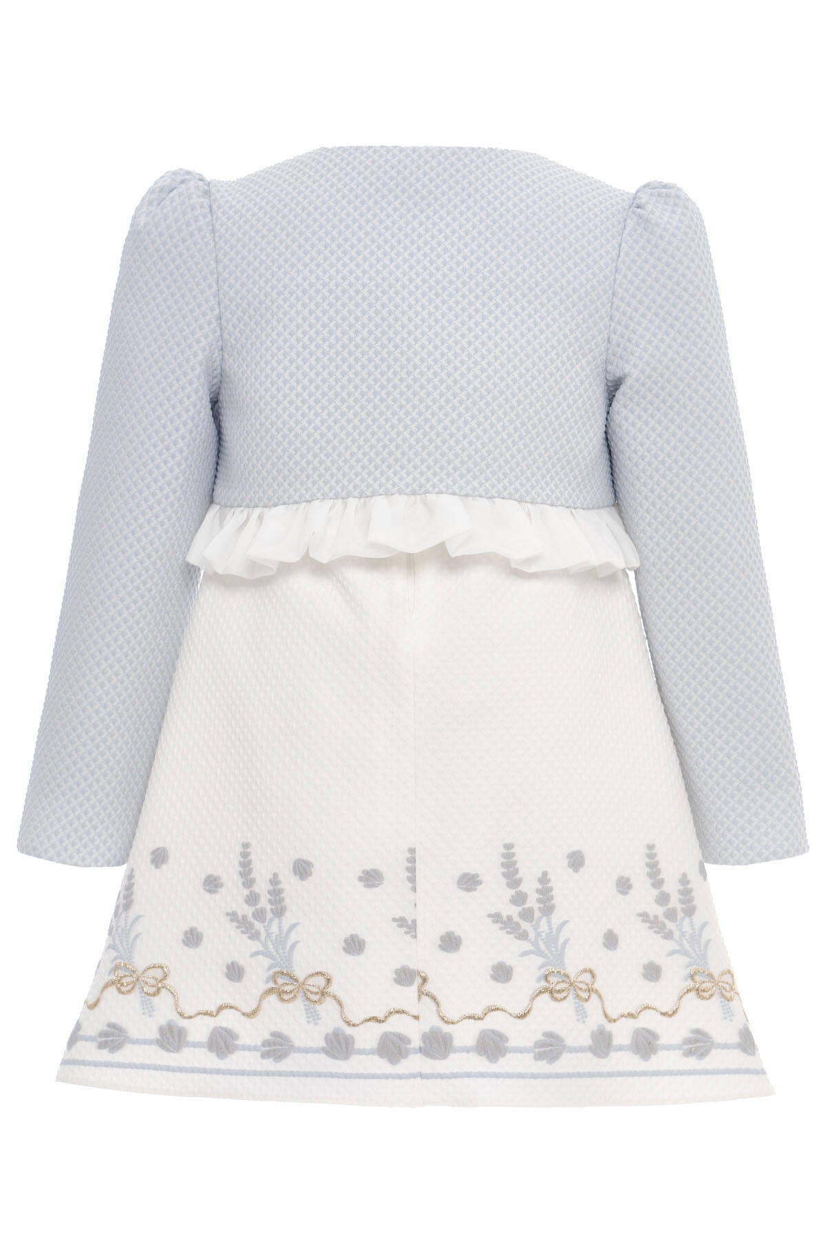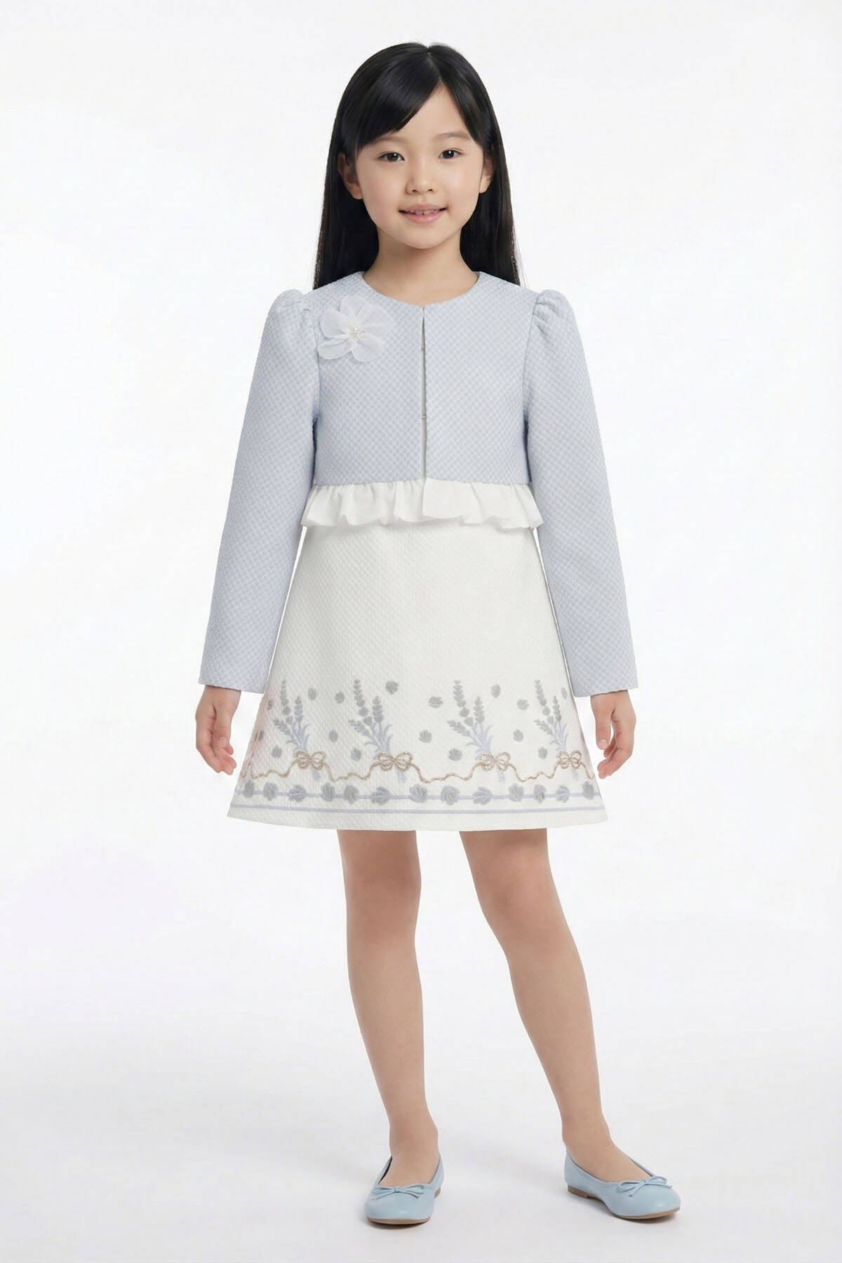 A fairy-tale ensemble for your little one’s most special moments ✨ This two-piece set features a textured A-line dress with a beautifully embroidered hemline of florals and bows, paired with a cropped long-sleeve jacket. The soft organza ruffle trim and delicate 3D flower on the jacket complete the look with grace and charm. Whether it's a spring party or a family celebration, this set delivers elegance, comfort, and timeless style.