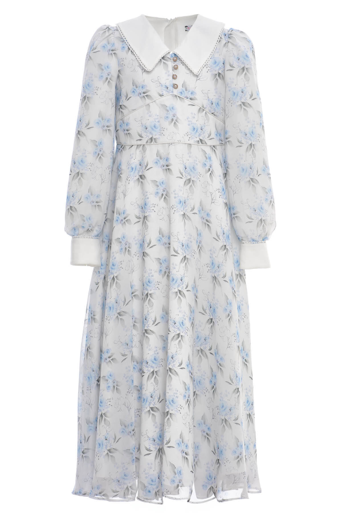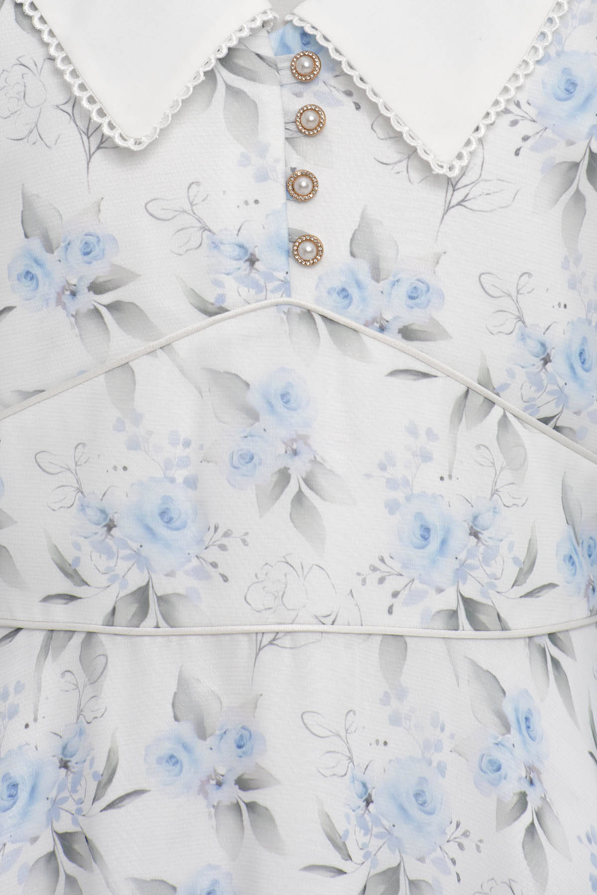 Charming and timeless, this long floral dress captures the elegance of a vintage silhouette with modern grace. Made from soft, printed chiffon, it features delicate pastel blooms and a flowing A-line cut for a dreamy, graceful look. The wide pointed collar is trimmed with lace, paired with pearl-embellished buttons for a refined finish. A corset-style lace-up back adds a unique twist while ensuring a comfortable and adjustable fit.