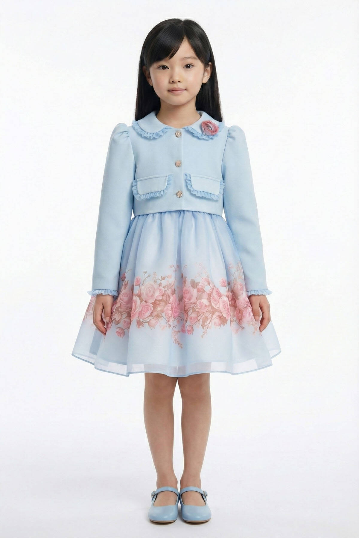 A dream in full bloom. This enchanting two-piece set includes a sleeveless satin dress with a voluminous organza overlay, beautifully printed with soft watercolor-effect florals. The look is completed with a tailored cropped jacket, detailed with gold-tone buttons, ruffle trims, and a removable flower brooch for an extra dash of charm. Perfect for garden parties, springtime celebrations, and every special occasion where she wants to feel like a little lady.