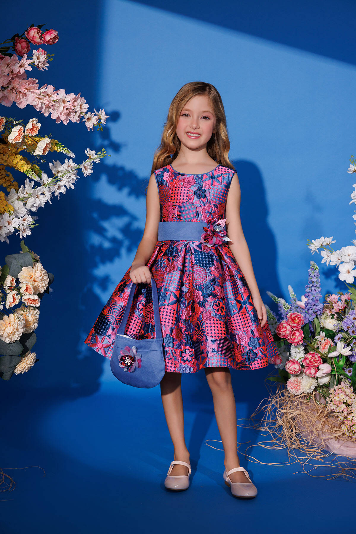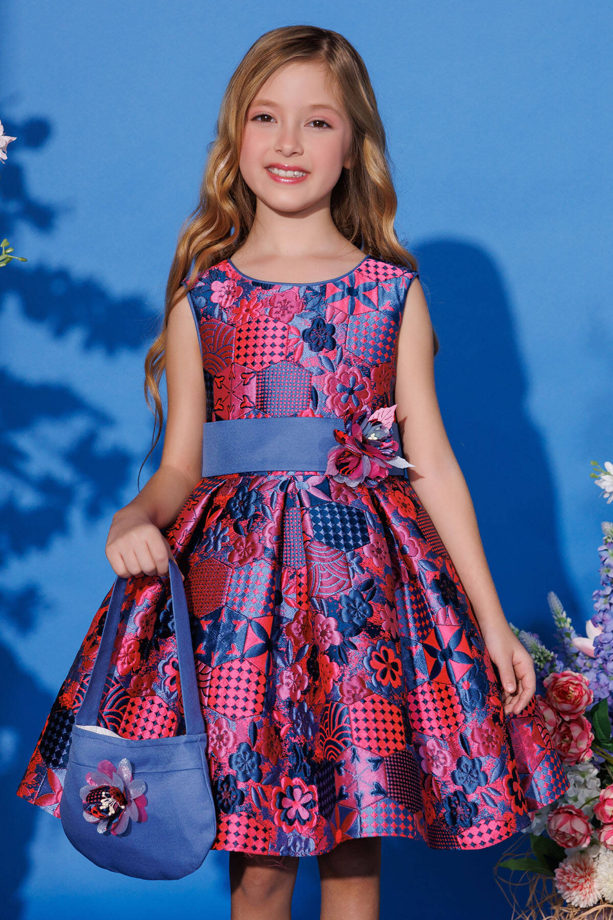 Let your little one shine with this beautiful patterned dress, complete with a matching bag for a coordinated and stylish look. Featuring a colorful patchwork floral design, this sleeveless dress is made from a soft and textured jacquard fabric for a luxurious feel. The fitted bodice flows into a flared skirt, enhanced with a waistband adorned with a delicate flower accent. The matching bag complements the outfit perfectly, making it ideal for birthdays, family events, or festive celebrations.
