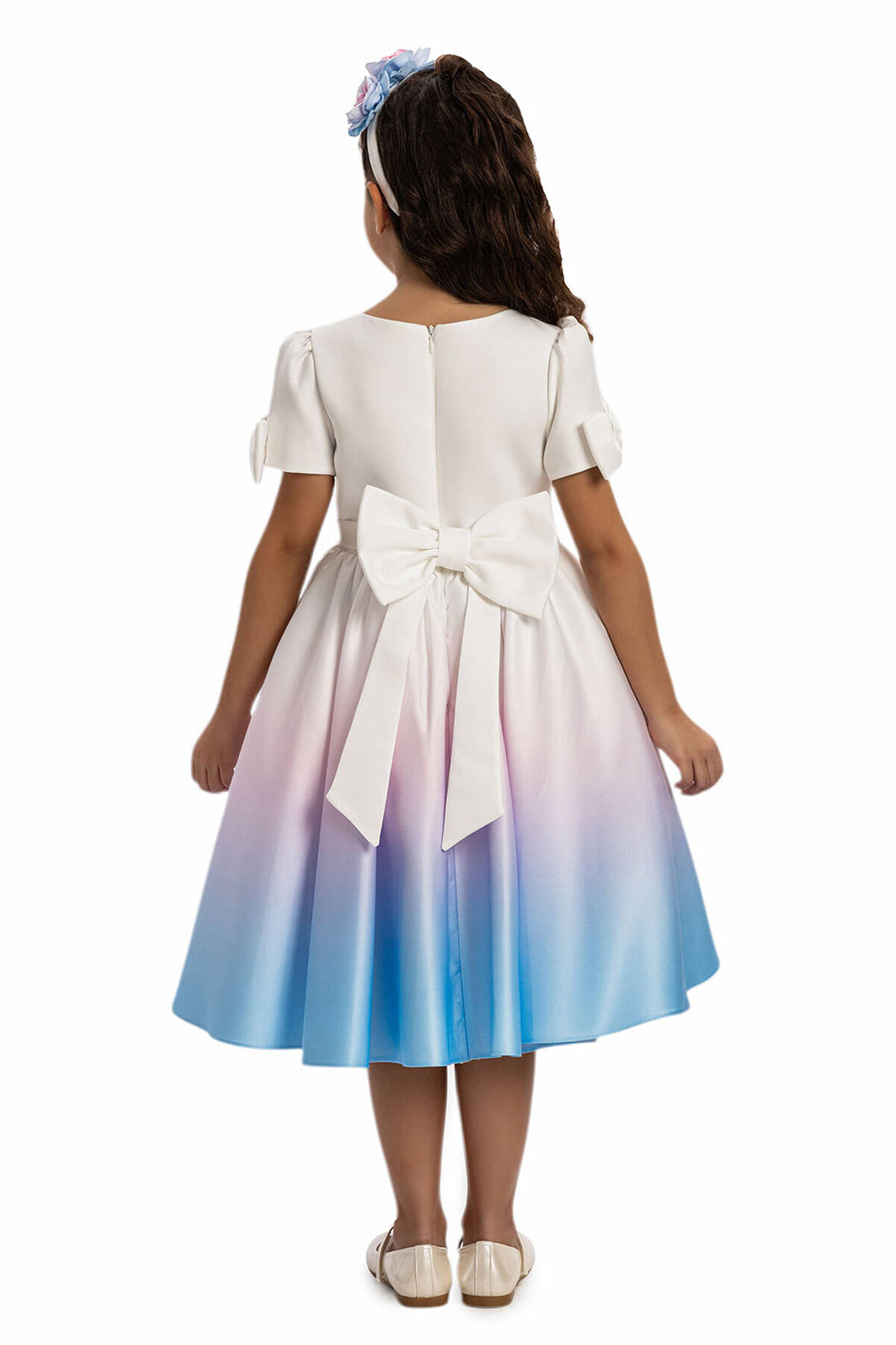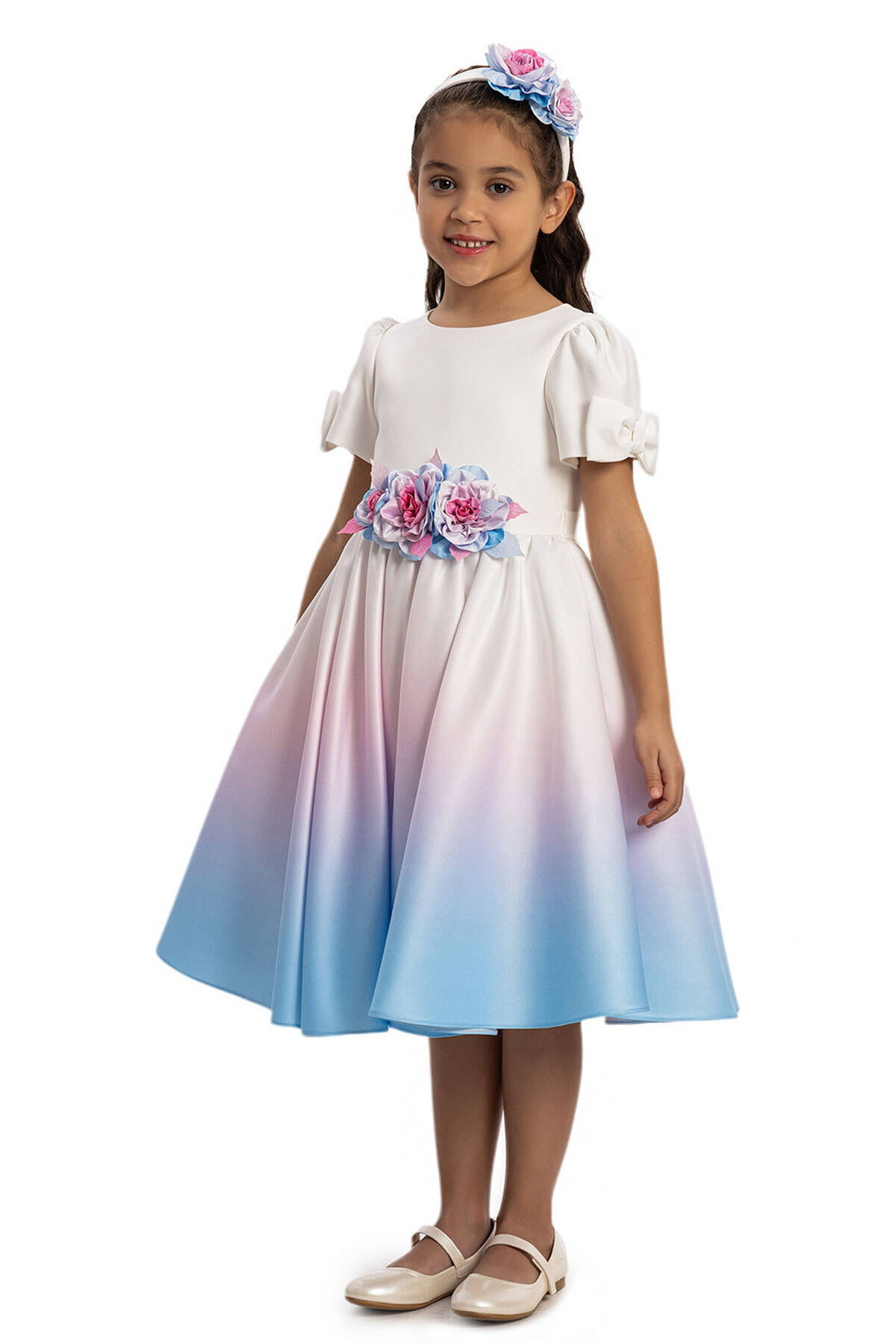 The dress features a beautifully crafted gradient design in blue and fuchsia tones, creating a striking visual appeal. Short puffed sleeves with bow details and a cluster of vibrant floral accents at the waist add charming details to this standout piece. The back is finished with a flowing satin bow, ensuring both adjustability and style. Perfect for birthdays, weddings, or any special occasion, this dress combines sophistication and playfulness in one timeless design.