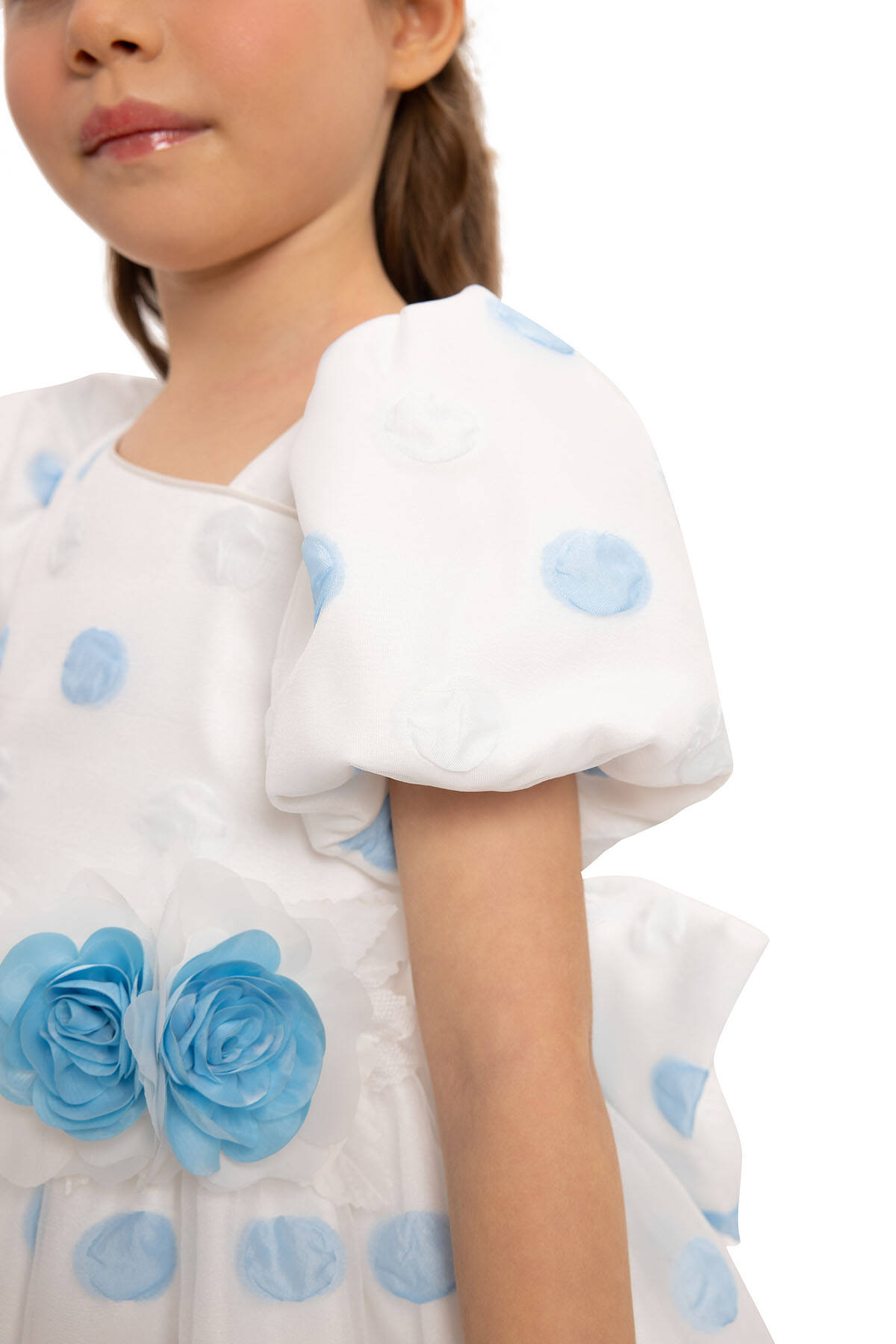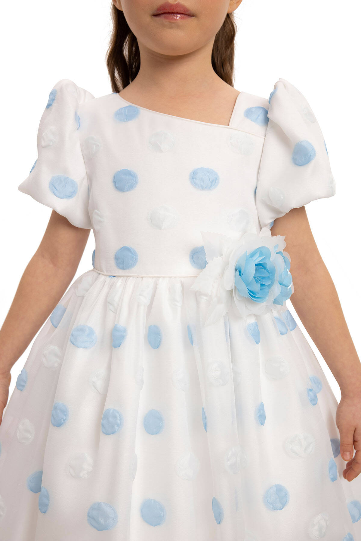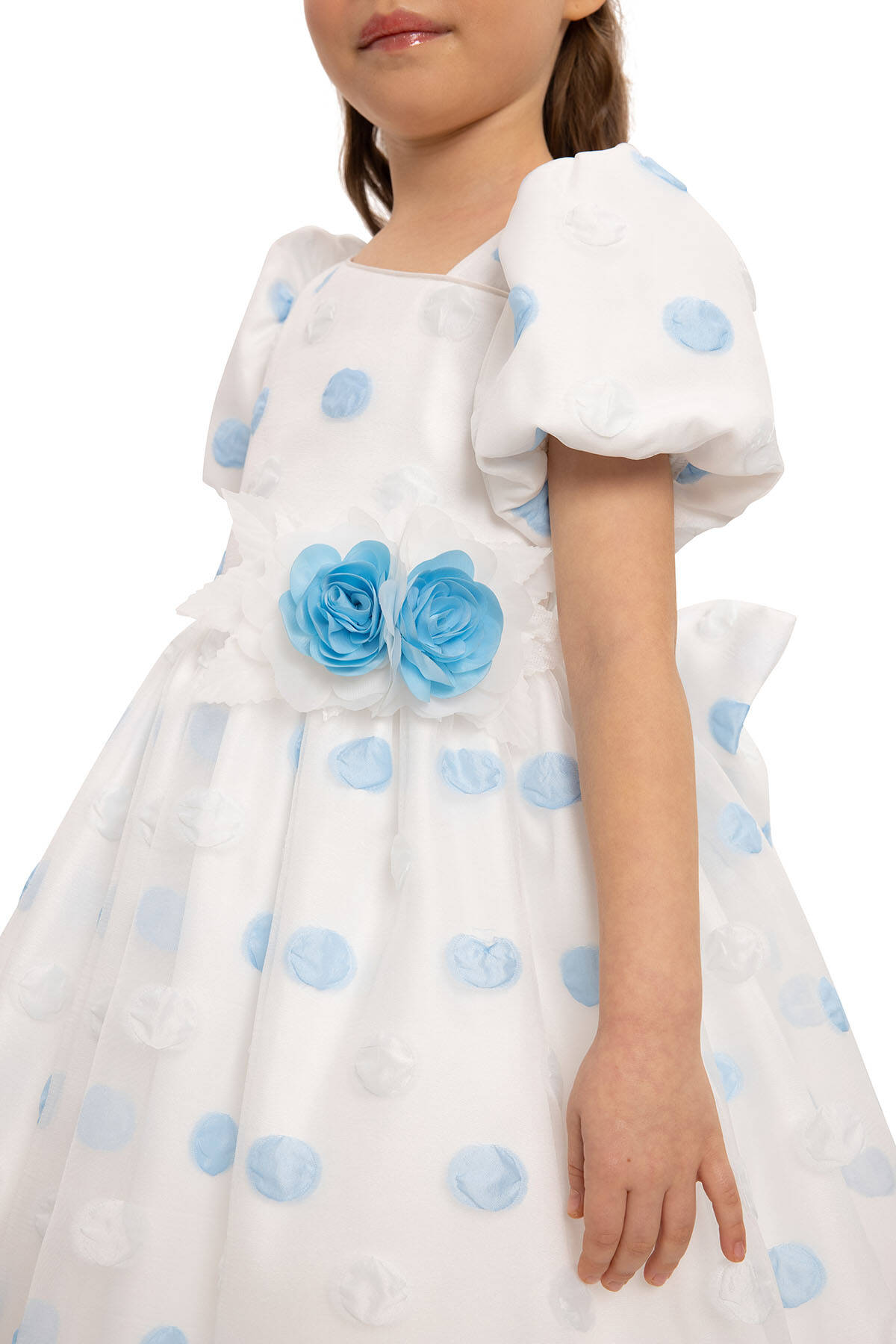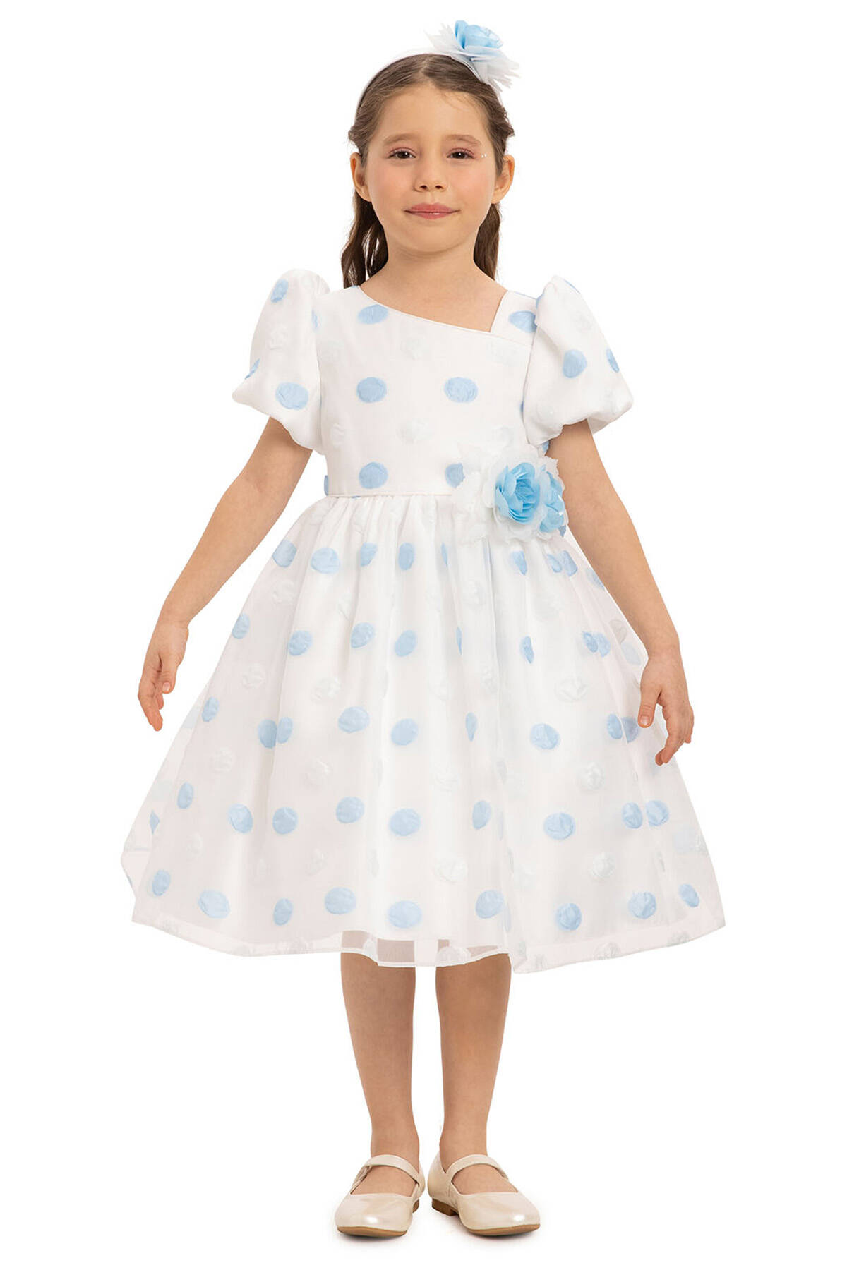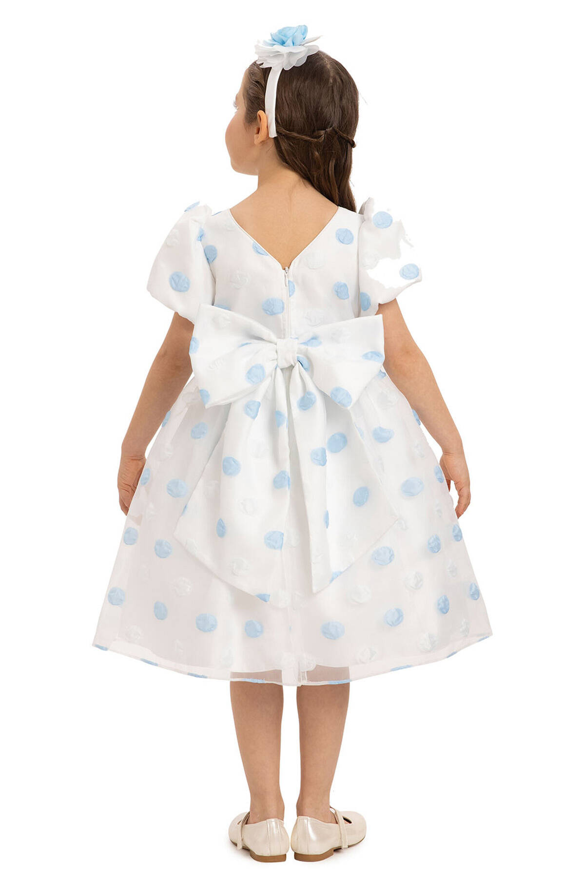 Let your little one dazzle with this adorable polka dot dress set, complete with a matching hair accessory. Made from high-quality fabric, this dress features playful design details and is perfect for special occasions or simply brightening any day. Features puffed short sleeves, adding a touch of vintage-inspired elegance. A-line silhouette with a full skirt, ideal for twirling and capturing magical moments. A charming floral embellishment at the waist brings an extra layer of sophistication. A large bow at the back enhances the dress’s whimsical appeal. Perfect for birthday parties, weddings, family gatherings, and other special events.