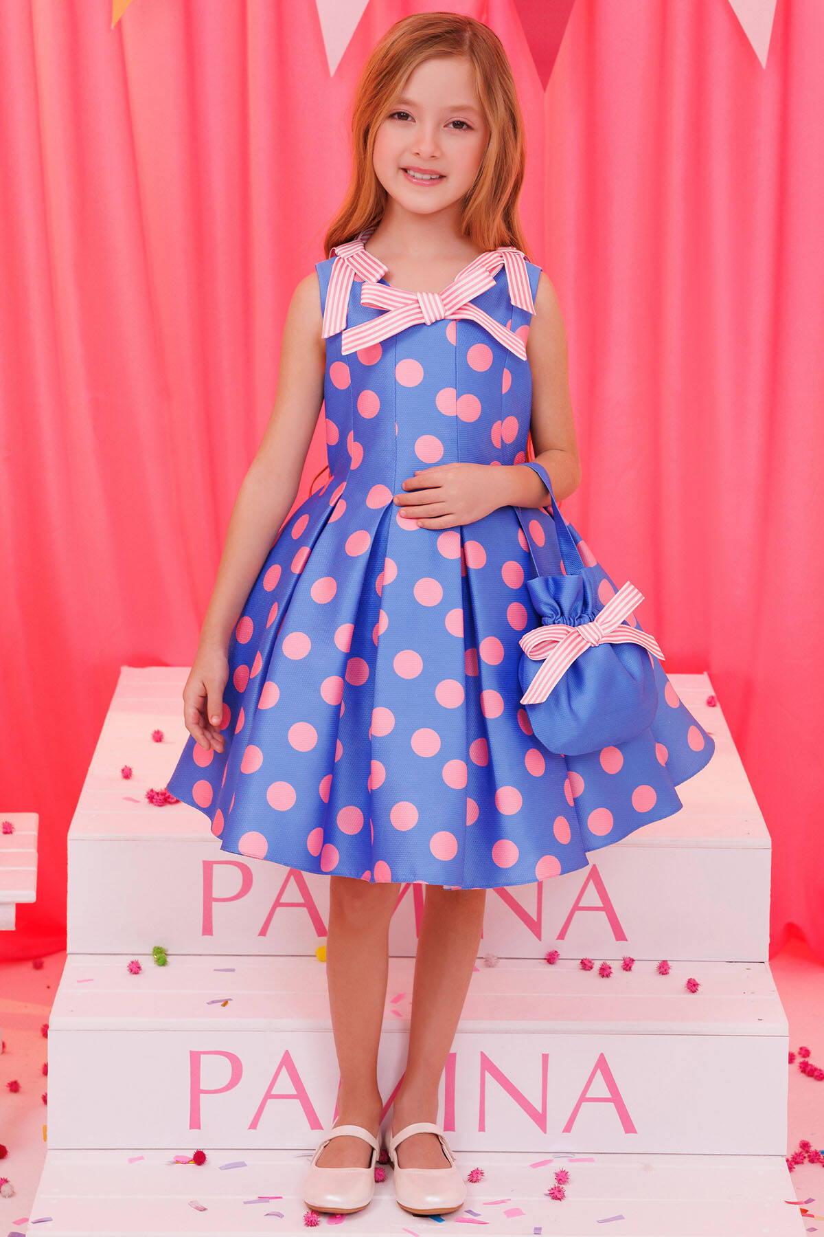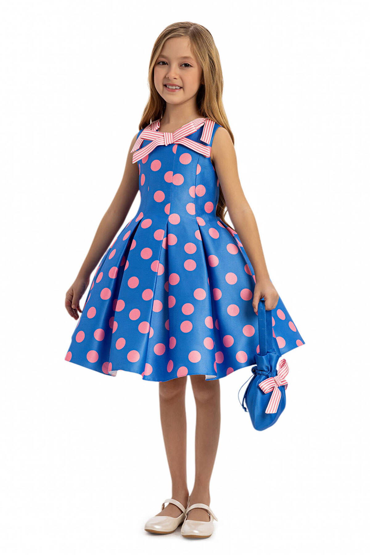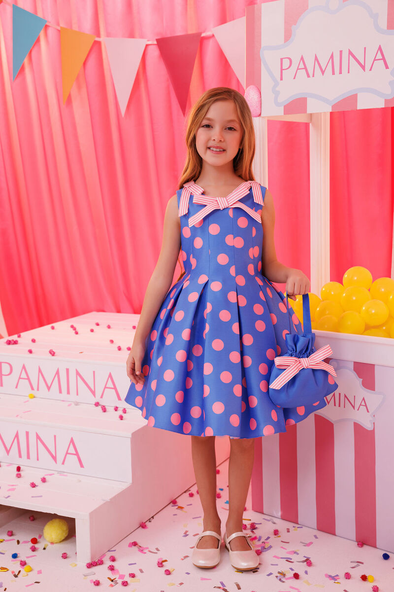 Add a burst of playful charm to your little girl’s wardrobe with this vibrant polka dot dress and matching bag set. Designed in bold colors, the sleeveless dress features delightful striped bow accents and a full flared skirt for twirling fun. The matching bag, complete with a coordinating bow, is the perfect accessory for carrying small treasures. This cheerful ensemble is ideal for birthday parties, family gatherings, or any occasion that calls for colorful style.