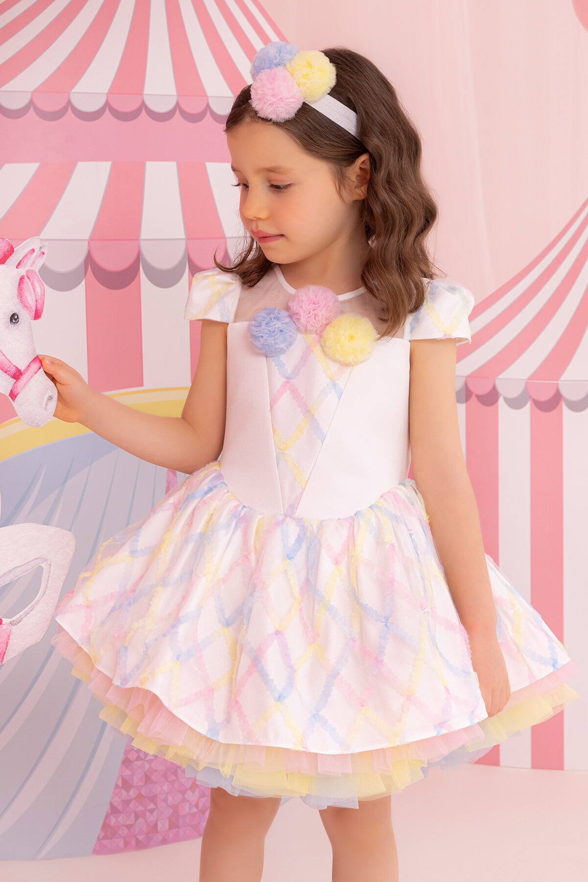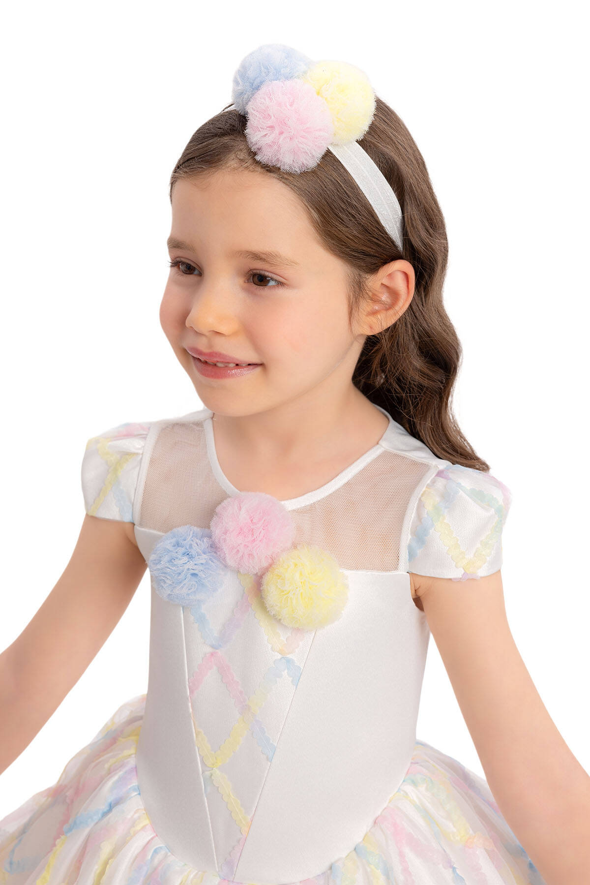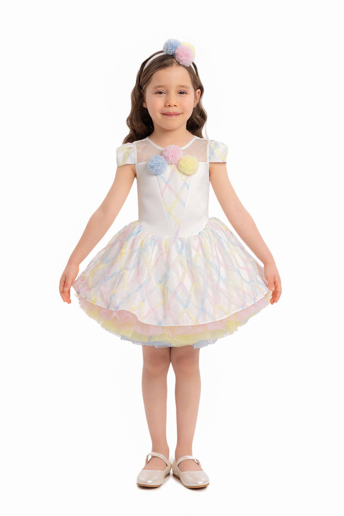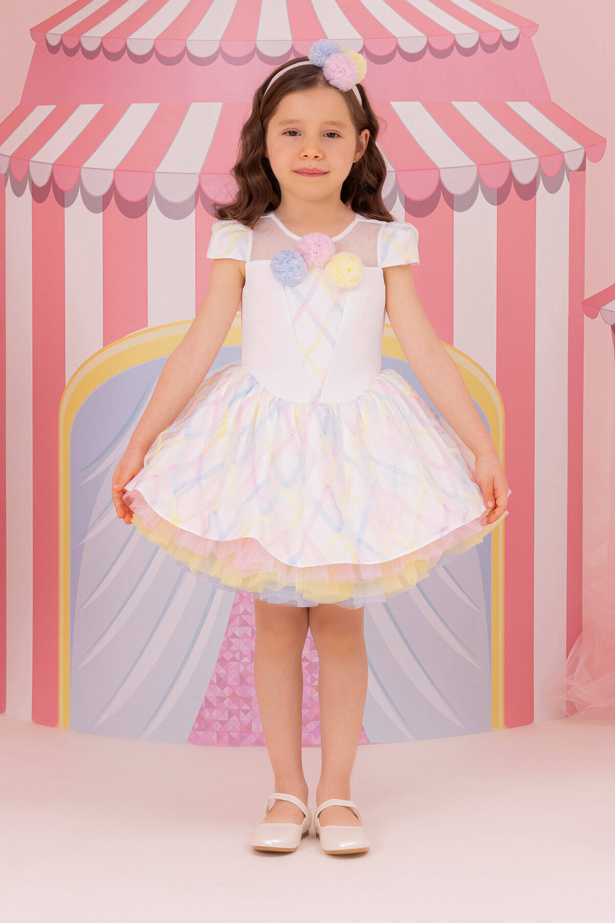Moon-sleeved girl's dress with a glamorous design featuring a tulle detail on the neckline. The large and Colorful ice cream detail on the bodice will be very appealing to girls. The top of the ice cream girl's dress is checkered, while the inside is voluminous and eye-catching with Colorful layered tulle. The most Colorful children's dresses of the summer are once again at Pamina this season. The cotton-lined dress is comfortable and healthy for children. The child's bandana, consisting of frilly pompoms, is a favorite among kids. A stylish choice for a birthday dress, party dress, or special occasion dress.