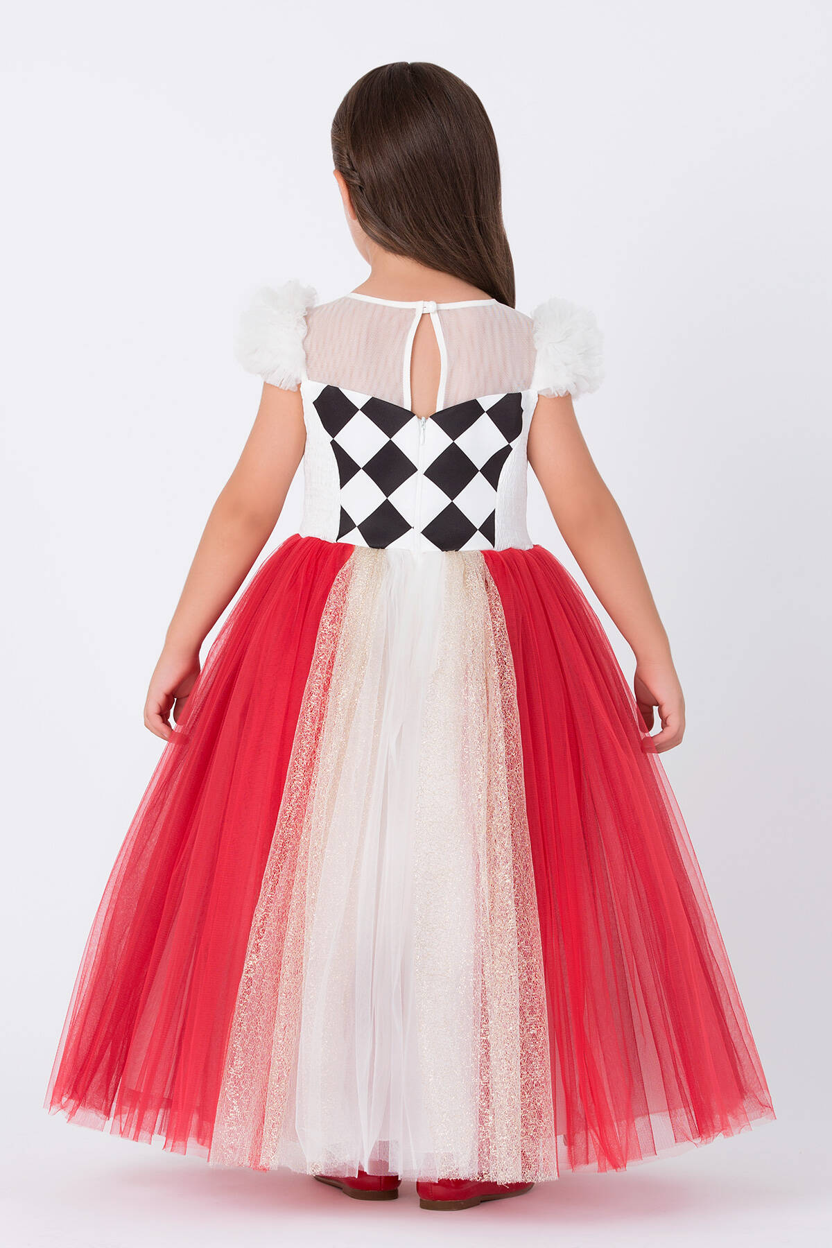 Our queen costume designed for little girls is full of stylish details. The dress features a transparent tulle neckline, and the sleeves are made of ruffled dream tulle. The bodice has a large red heart detail, sparkling with sequins. The bodice of our girls' costume is adorned with checkered patterns, taking children to a fairytale land they love. The skirt of our costume, which has a striped printed bow on its waist, draws attention with its cup and stripe details. The color-gradient tulle skirt, with its voluminous form, will become a favorite among girls. The back of the dress has a shirred design, providing comfort for children to wear. You can gift this dress to your daughter for a themed birthday party. Our dress is a great choice as a birthday dress or party dress gift. At Pamina, we care about children’s health as much as their style, and we choose healthy fabrics for our products.
