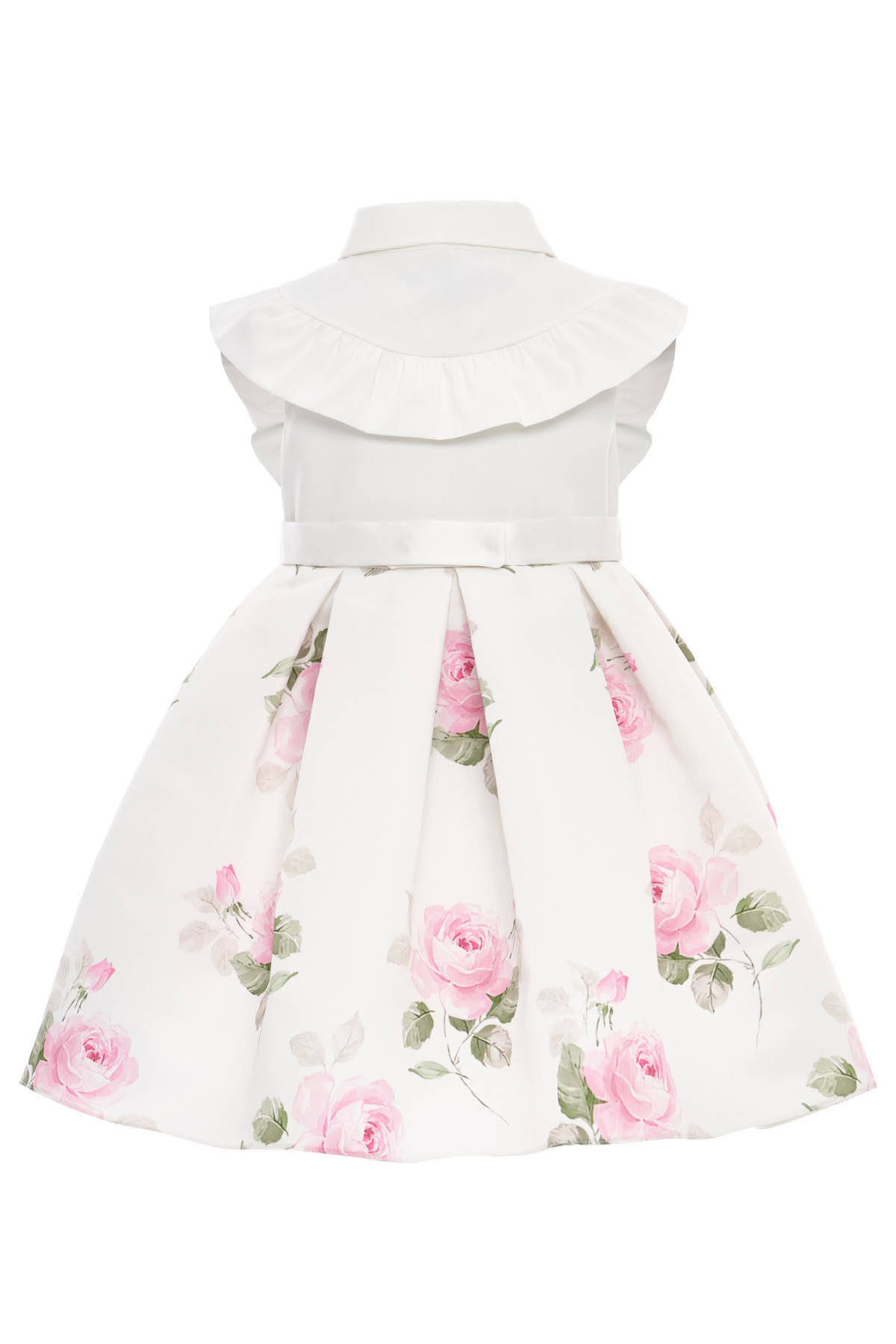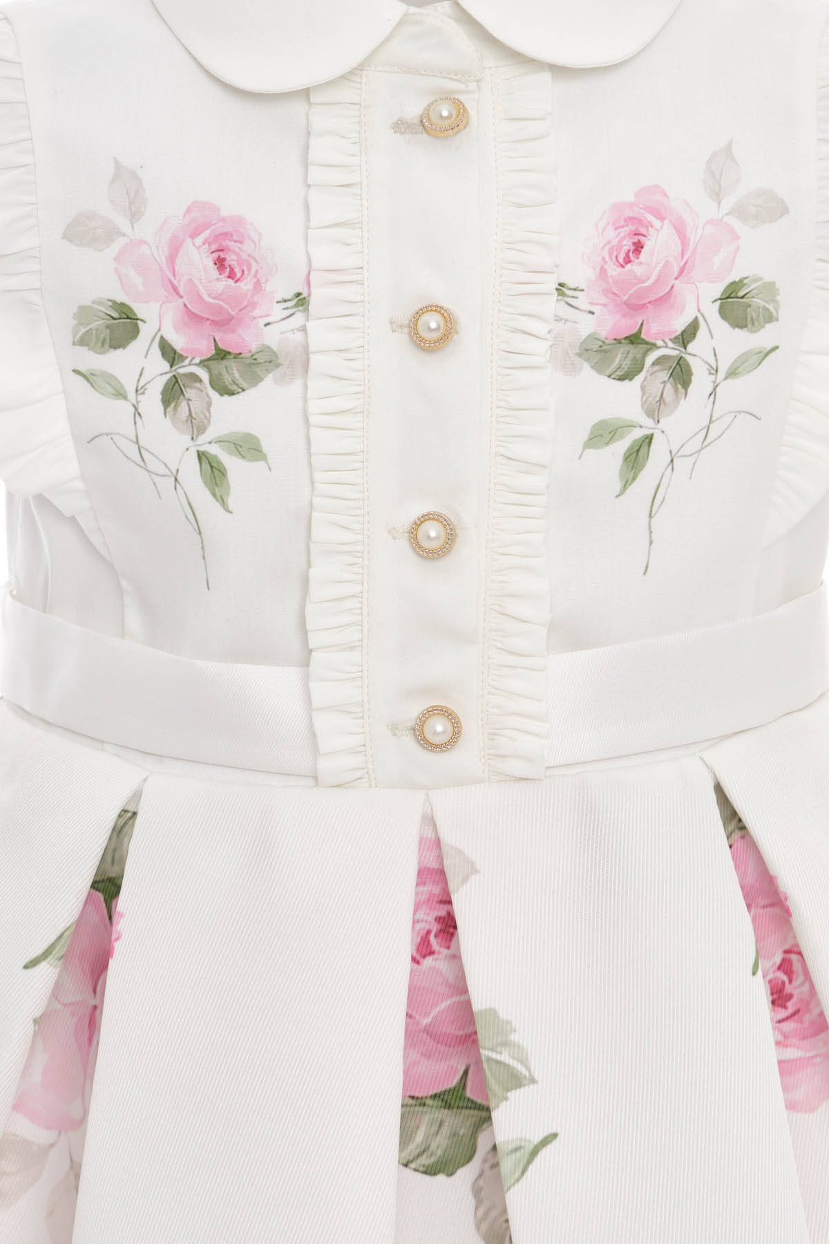 A picture-perfect garden party look! This elegant two-piece set features a sleeveless satin dress with romantic rose print, pearl-style button accents, and dainty ruffle trim along the bodice and sleeves. A classic Peter Pan collar and pleated skirt add timeless charm, while the coordinated floral shoulder bag completes the ensemble.