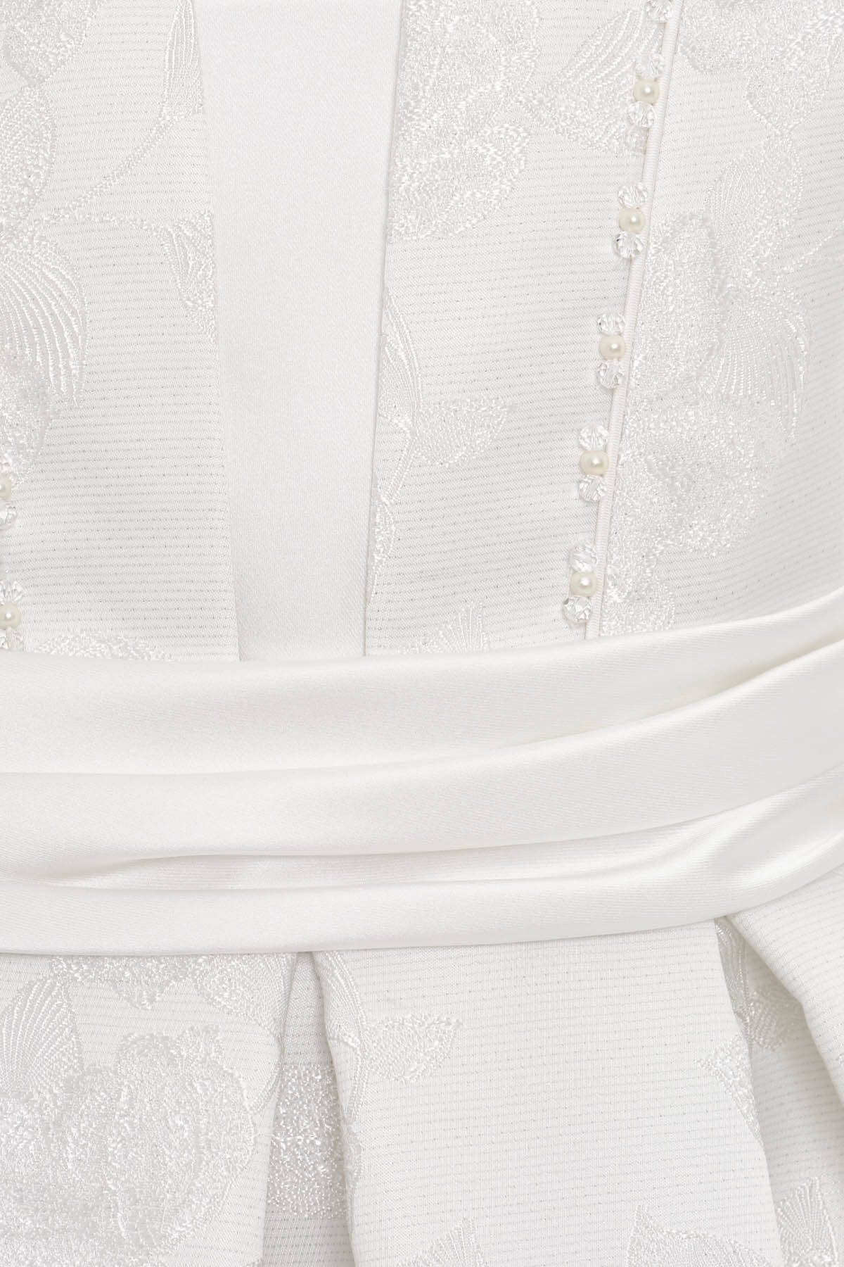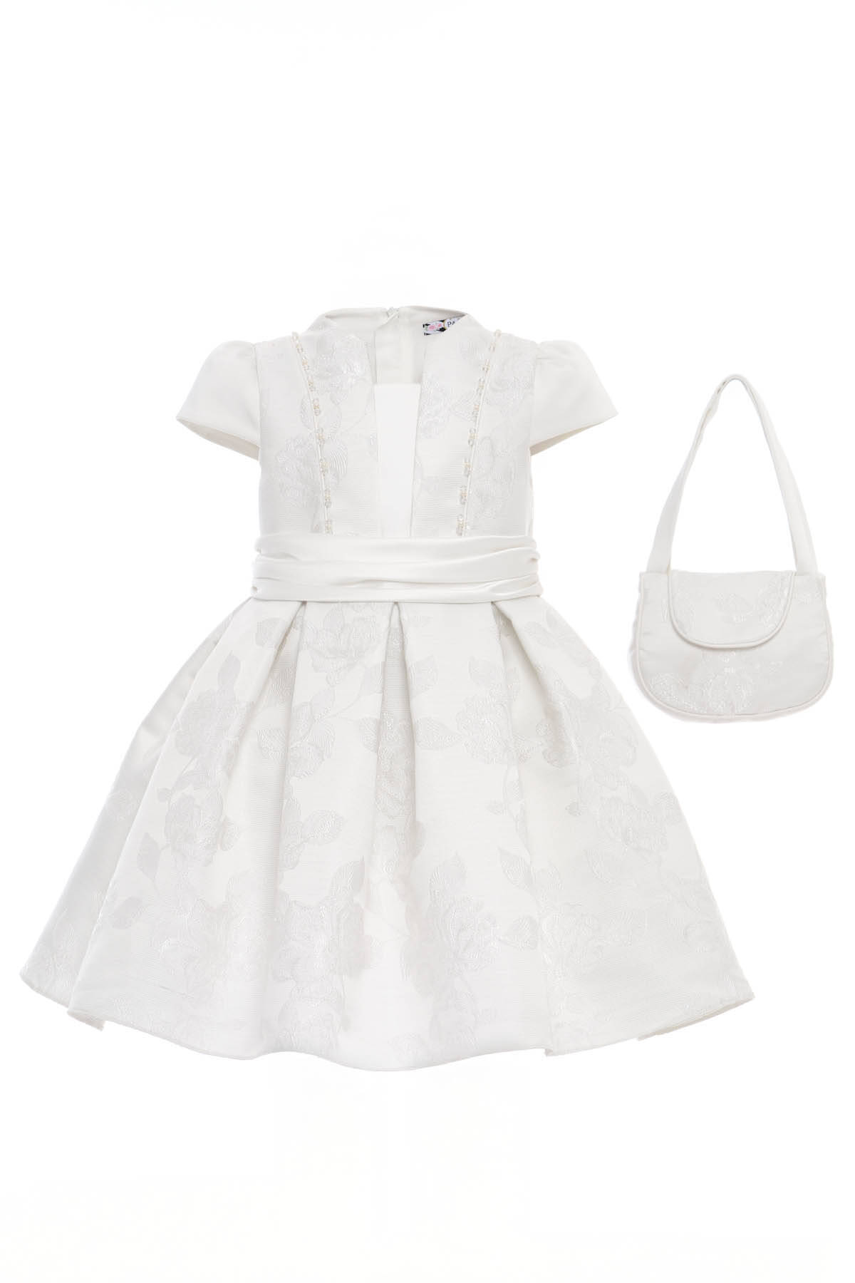 A beautifully tailored dress that blends modern sophistication with timeless grace. Crafted from luxurious floral jacquard fabric, it features a structured bodice with delicate pearl beading, cap sleeves, and a pleated skirt. The satin waistband ties into a charming bow at the back, and the set is completed with a coordinating mini purse—perfect for her tiny treasures. Ideal for weddings, parties, and special celebrations.
