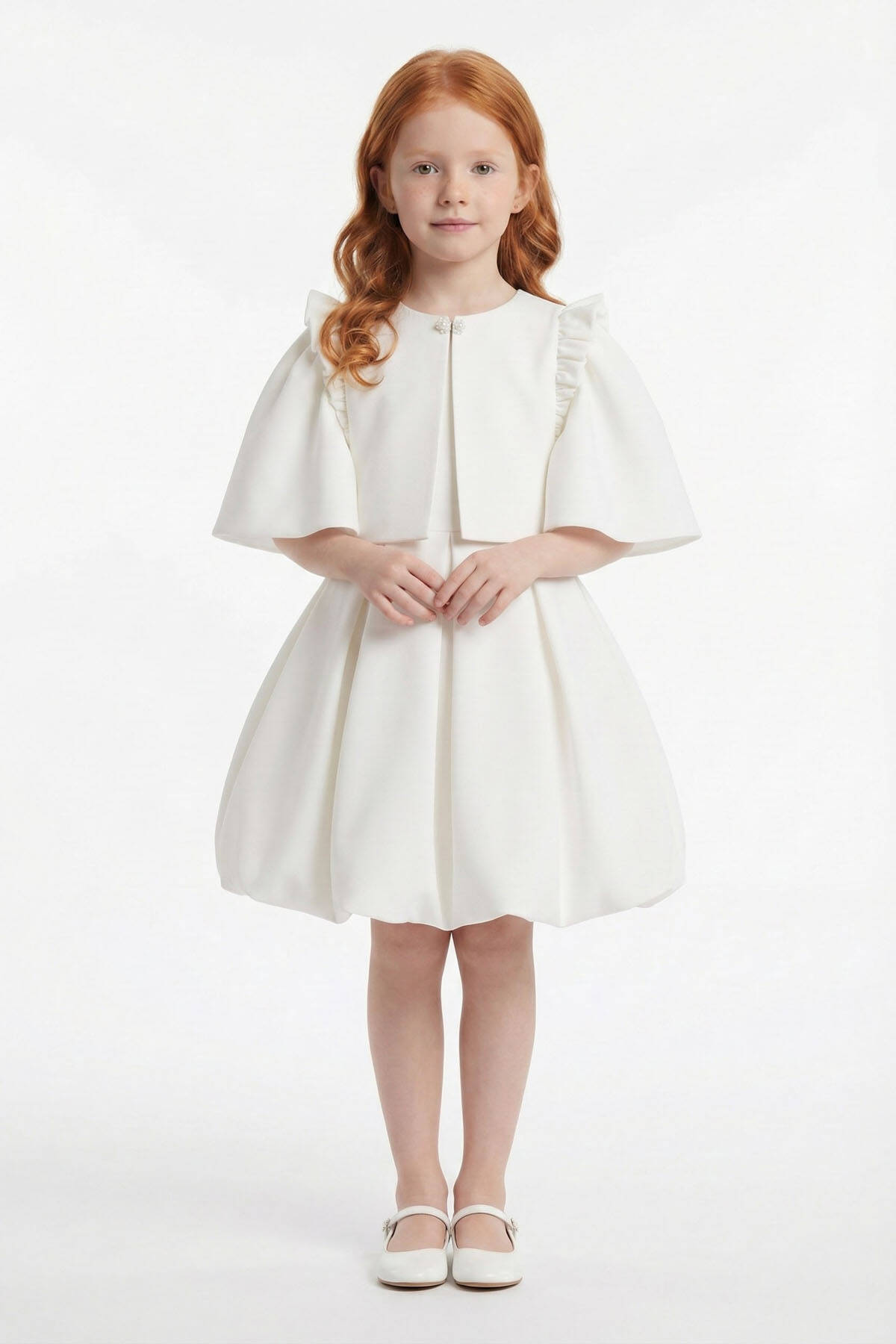 Sweet and stylish, this bolero is the perfect finishing touch for any formal outfit. Featuring elegant flutter sleeves and charming ruffle details on the shoulders, it closes at the neckline with delicate flower-shaped clasps adorned with pearl accents. Ideal for birthdays, weddings, or special events.