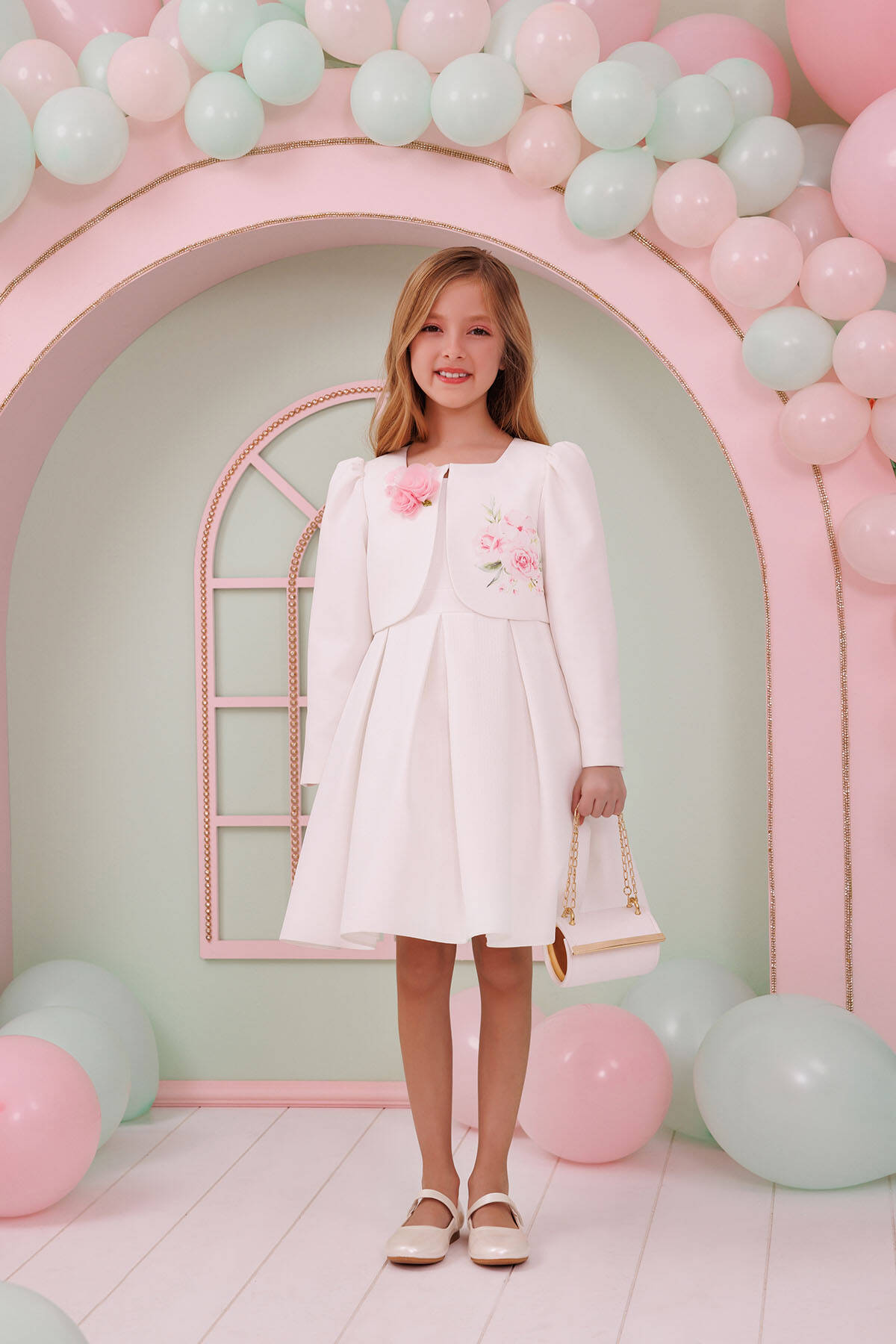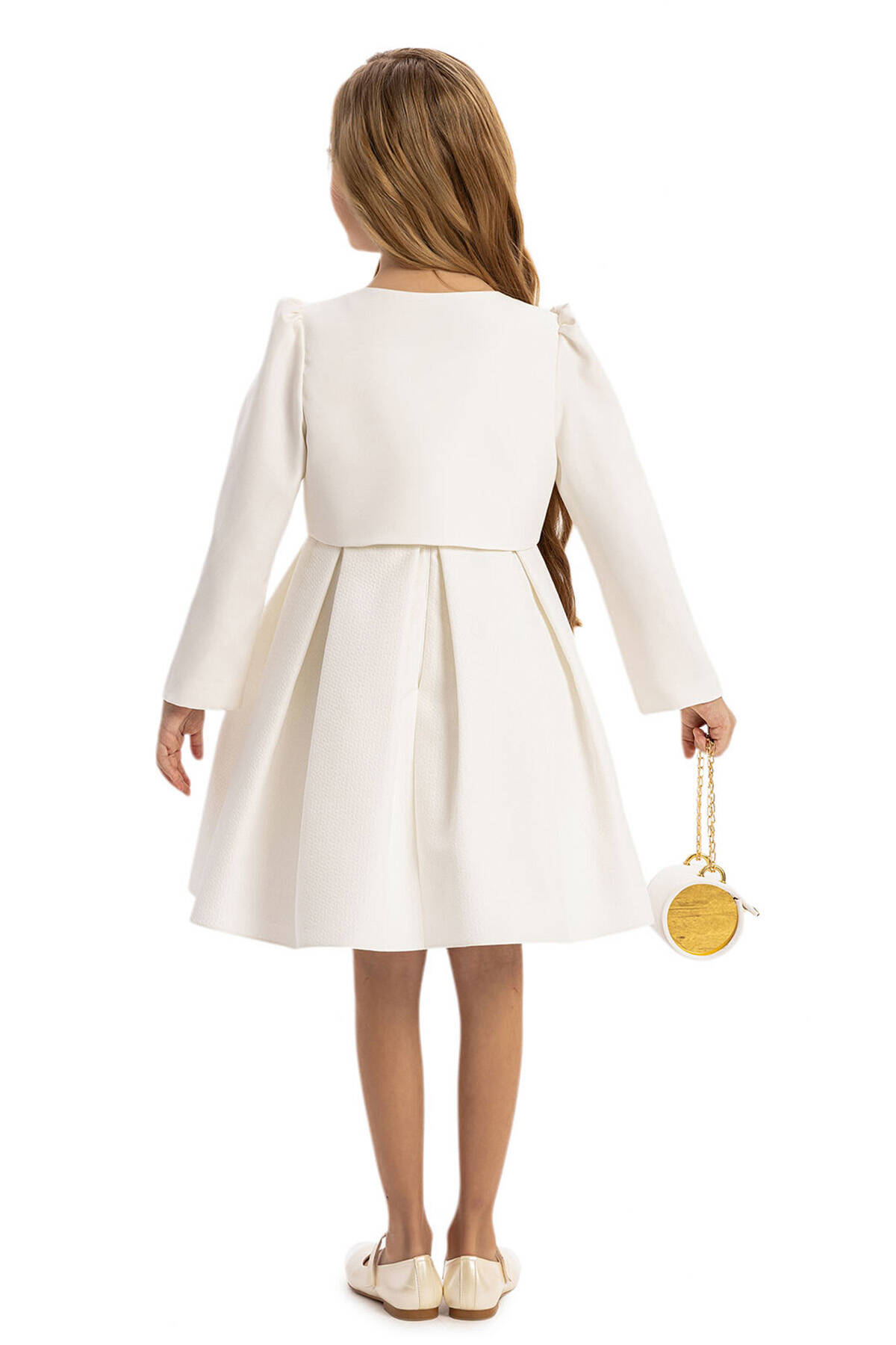 This sophisticated 3-piece set is perfect for your little one's special moments. The set includes a sleeveless dress, a stylish jacket, and a matching bag. Crafted from premium jacquard fabric, the dress features a textured finish and a pleated skirt that adds volume and elegance. The jacket is adorned with exquisite floral appliqués and 3D details, while the charming bag with a golden chain handle completes the look for a truly polished ensemble.