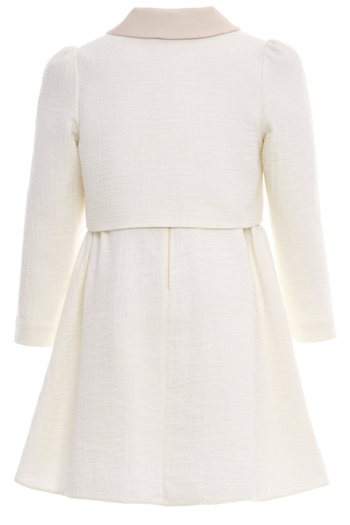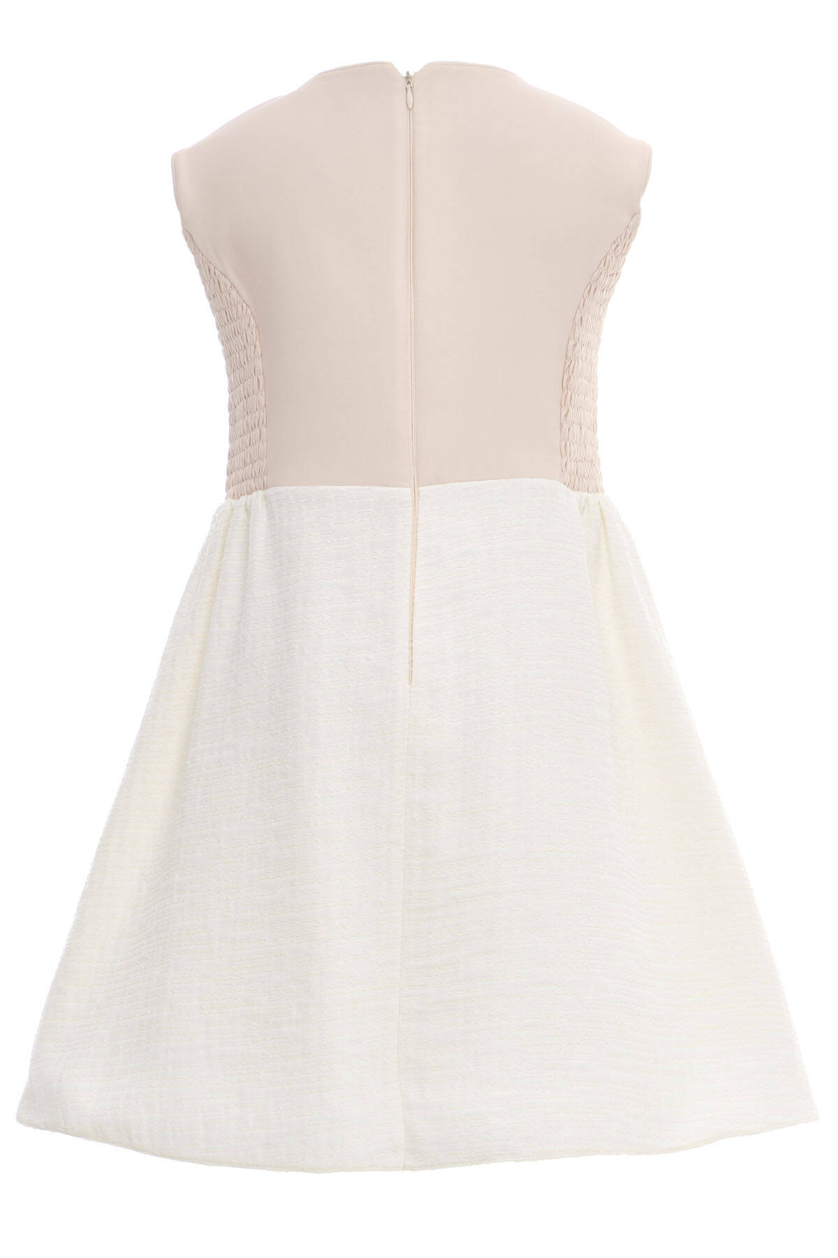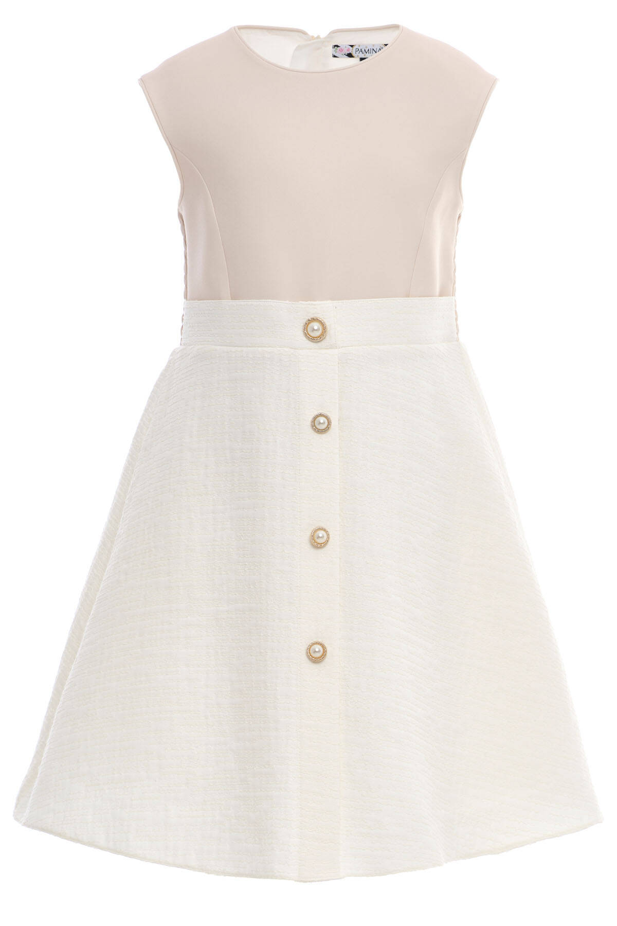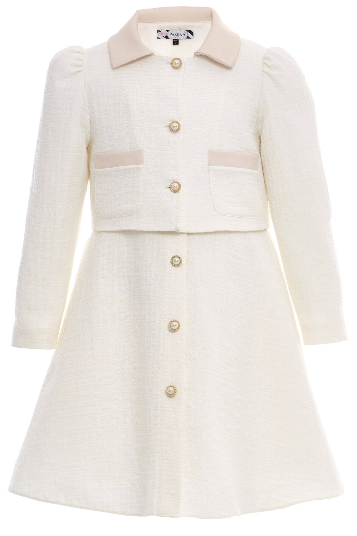 A chic and timeless two-piece set for young girls with classic taste. The sleeveless A-line dress features a textured woven skirt and a smooth ivory bodice with elastic shirring at the sides for a comfortable fit. The coordinating cropped jacket is crafted from the same textured fabric, accented with pearl-embellished buttons, white contrast pocket flaps, and a crisp collar for a polished finish. Soft structure, rich texture, and thoughtful tailoring come together in this elegant look—perfect for special events, ceremonies, or family gatherings.