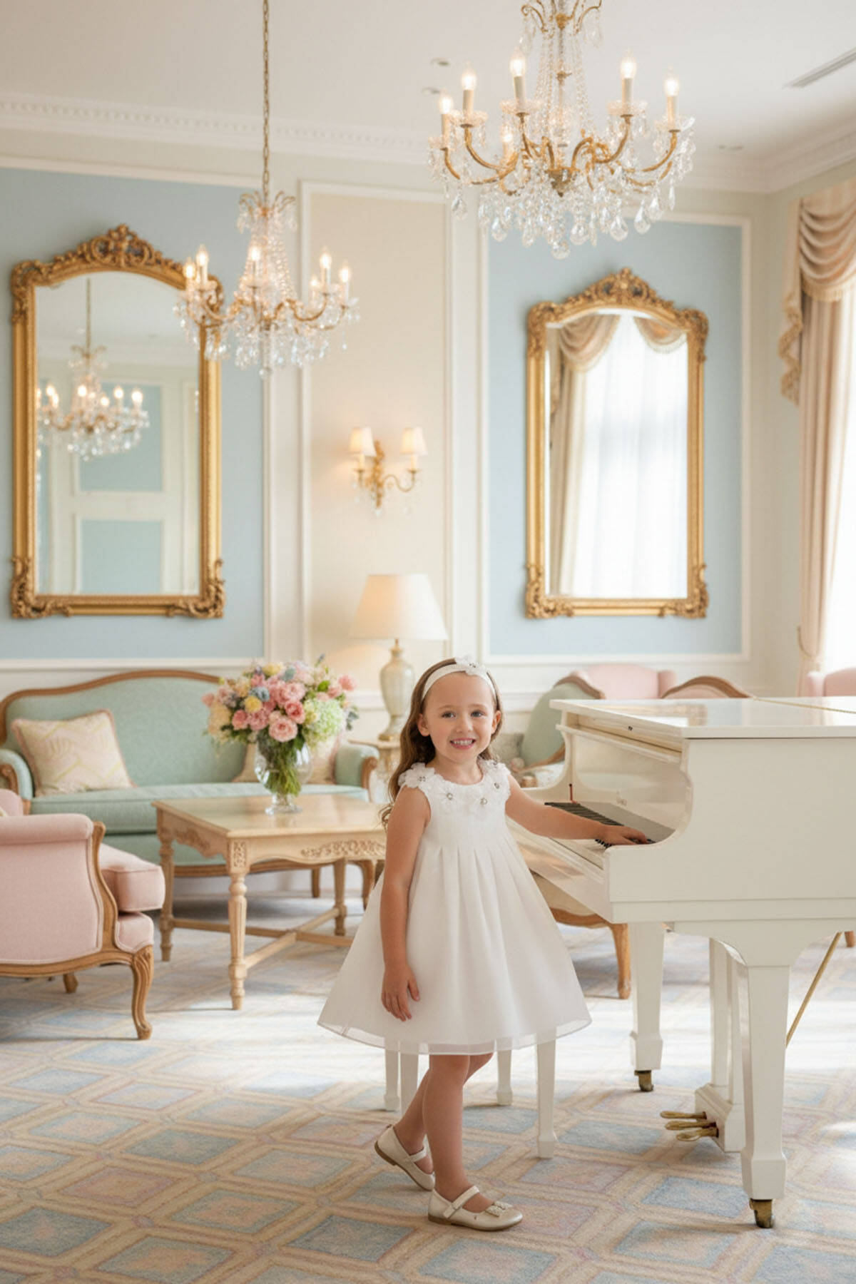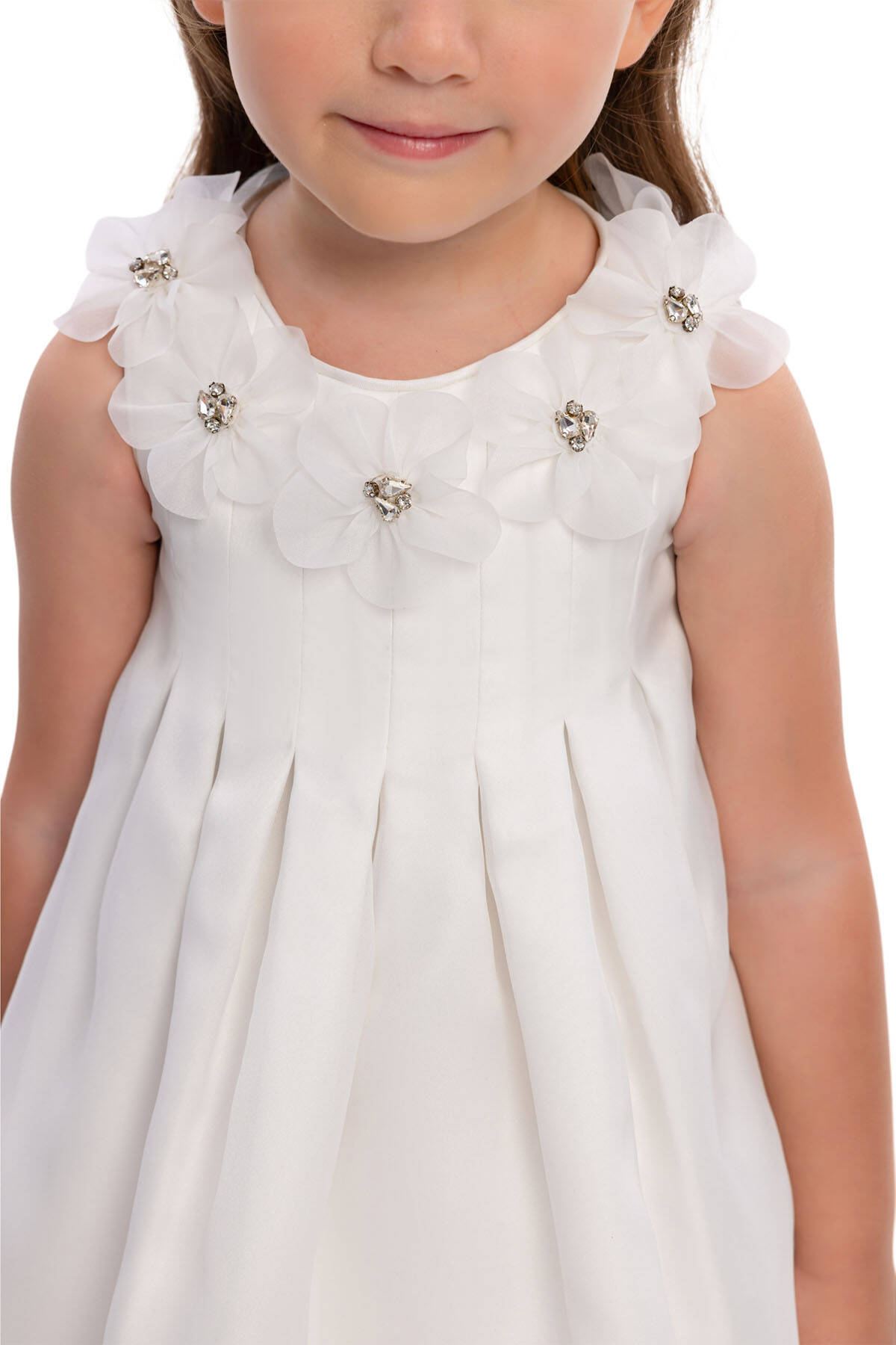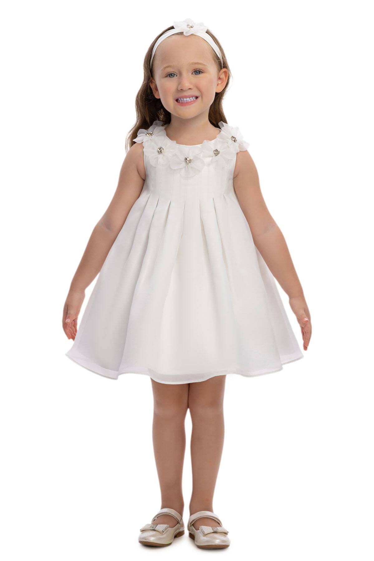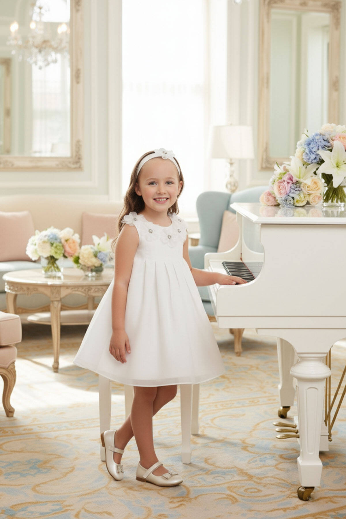 Delicate, dreamy, and designed for special little moments — this baby dress set is pure elegance. The sleeveless A-line silhouette is adorned with soft pleats, creating a graceful flow that allows both style and comfort.The neckline is beautifully decorated with 3D chiffon flowers, each embellished with sparkling crystal stones at the center, adding a touch of sophistication to the playful design. A matching floral headband completes the look, making it perfectly coordinated for photographs and celebrations.Lightweight and lined for comfort, this dress is ideal for birthdays, christenings, and festive gatherings a timeless choice that blends charm and luxury.