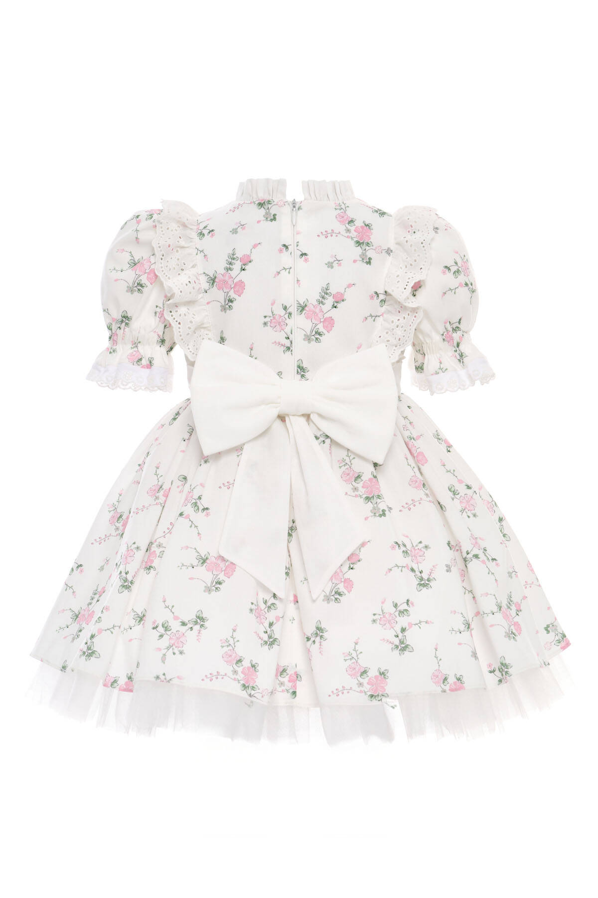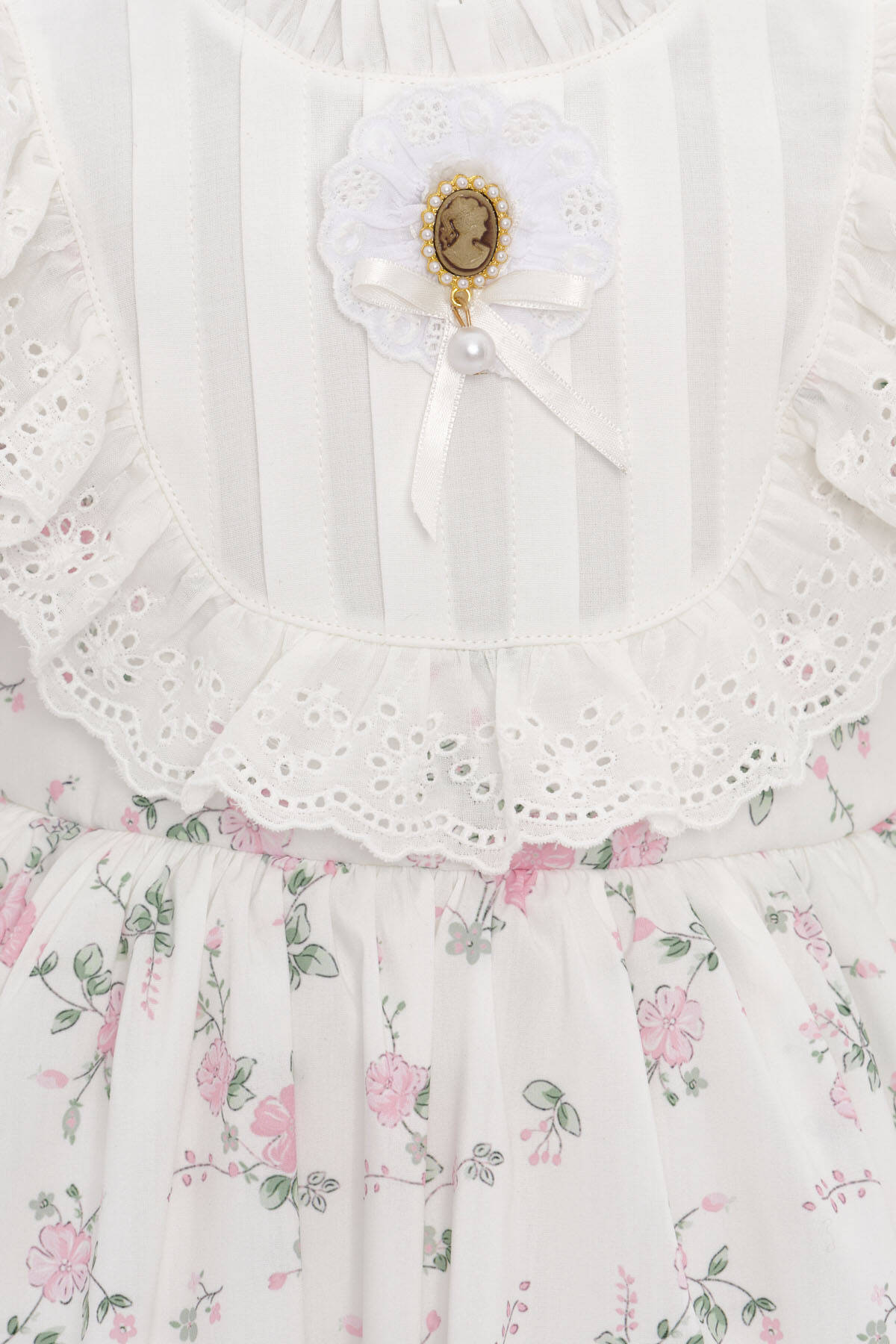 Bring timeless charm to your baby girl's wardrobe with this two-piece vintage-inspired dress set. Featuring a soft floral pattern, elegant lace-trimmed bib front, and puffed sleeves, this dress is beautifully finished with a cameo brooch and a voluminous bow at the back. The matching floral headband completes the adorable look—perfect for birthdays, garden parties, and special photos.