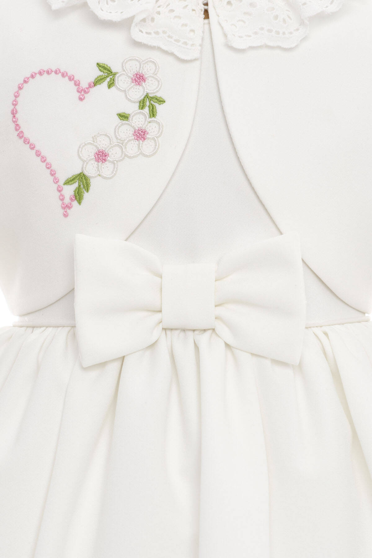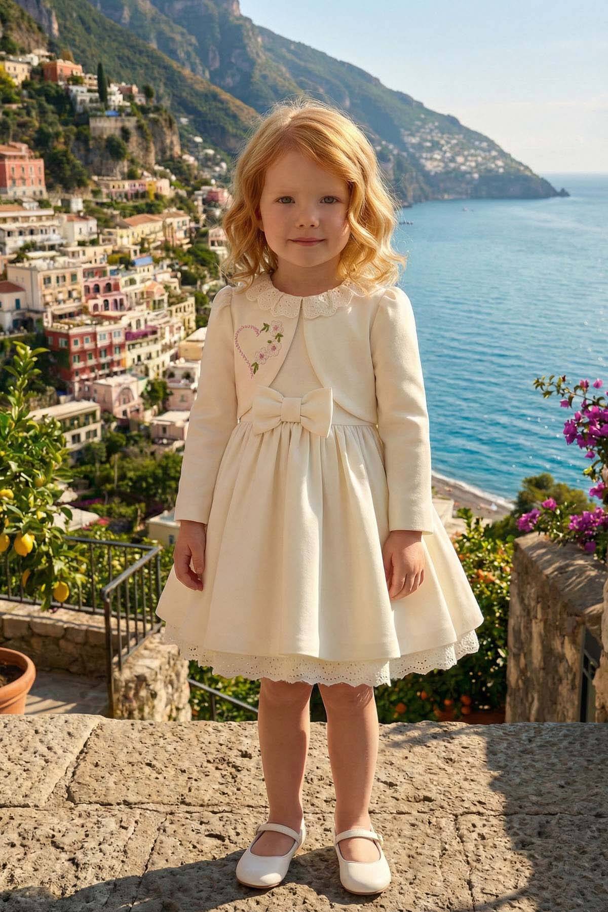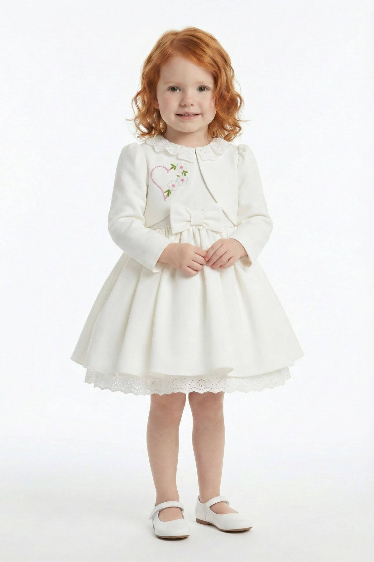 Delicate, dreamy, and designed for special memories. This two-piece set brings together timeless charm and baby-soft comfort. The look features a classic sleeveless dress with a full skirt, accented by a sweet oversized bow and scalloped lace hem. Layered with the matching long-sleeve jacket, it becomes a picture-perfect outfit for all your little one’s most cherished occasions. The jacket is detailed with floral embroidery, a heart motif made of pearls, and a dainty lace-trimmed collar.