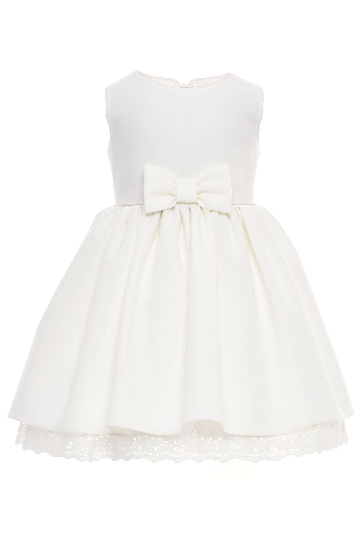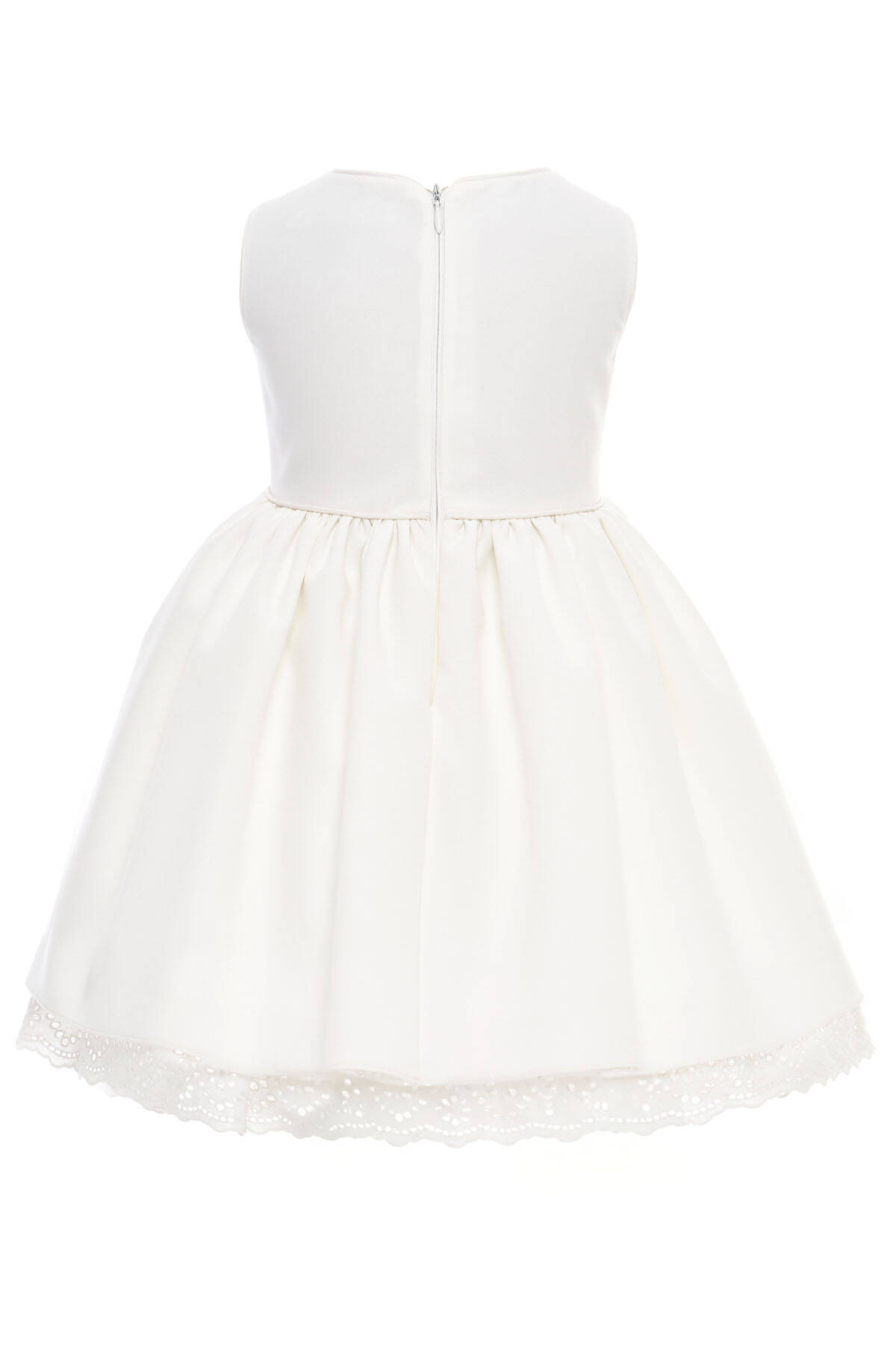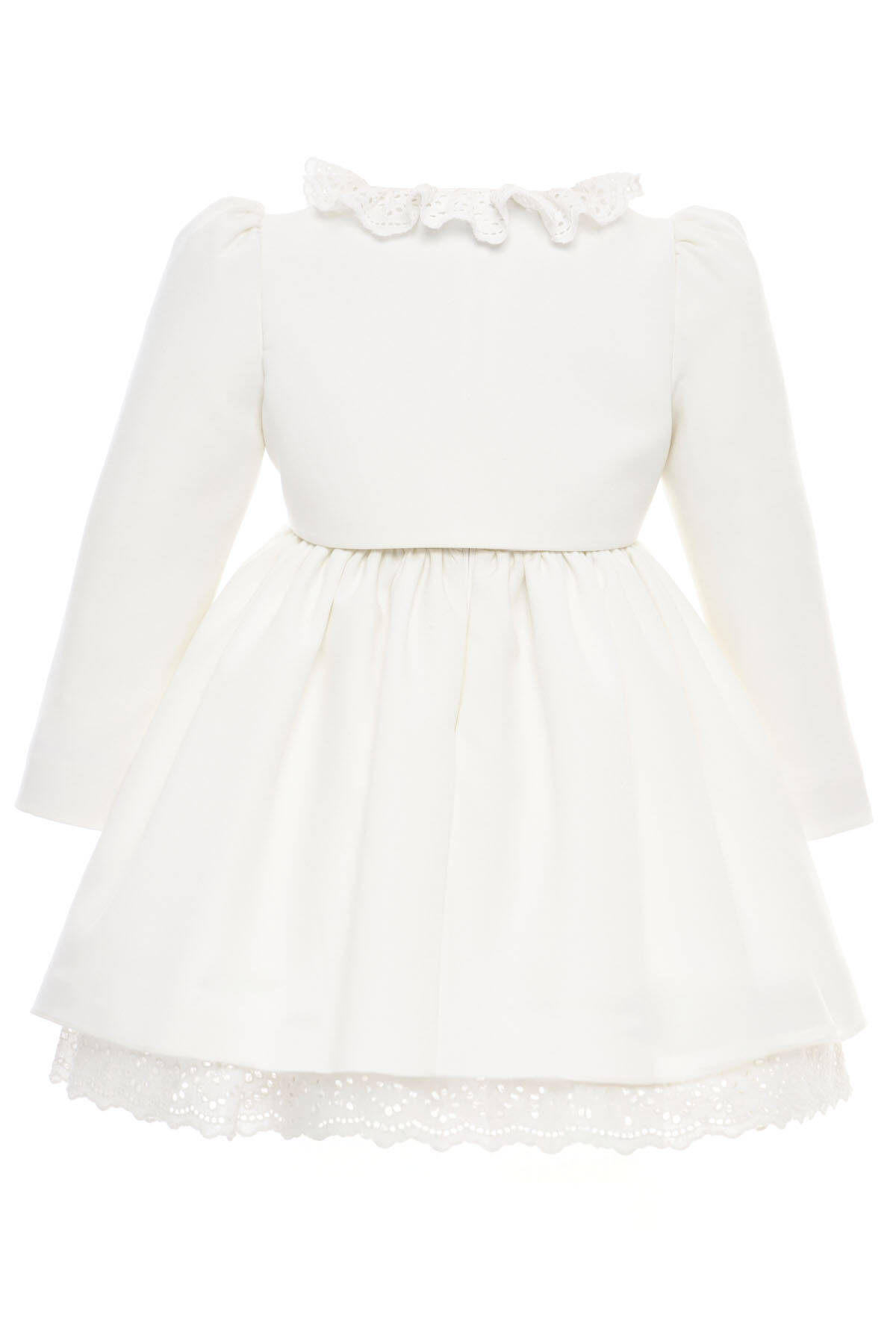 Delicate, dreamy, and designed for special memories. This two-piece set brings together timeless charm and baby-soft comfort. The look features a classic sleeveless dress with a full skirt, accented by a sweet oversized bow and scalloped lace hem. Layered with the matching long-sleeve jacket, it becomes a picture-perfect outfit for all your little one’s most cherished occasions. The jacket is detailed with floral embroidery, a heart motif made of pearls, and a dainty lace-trimmed collar.
