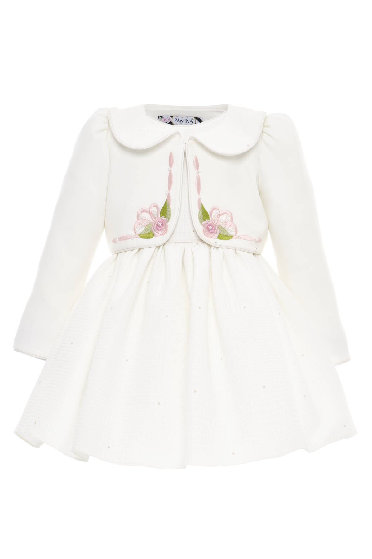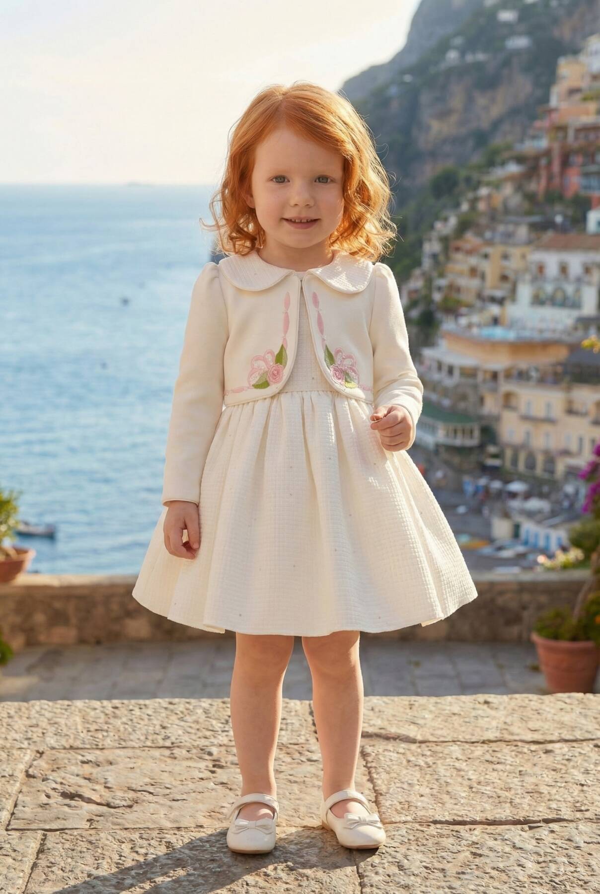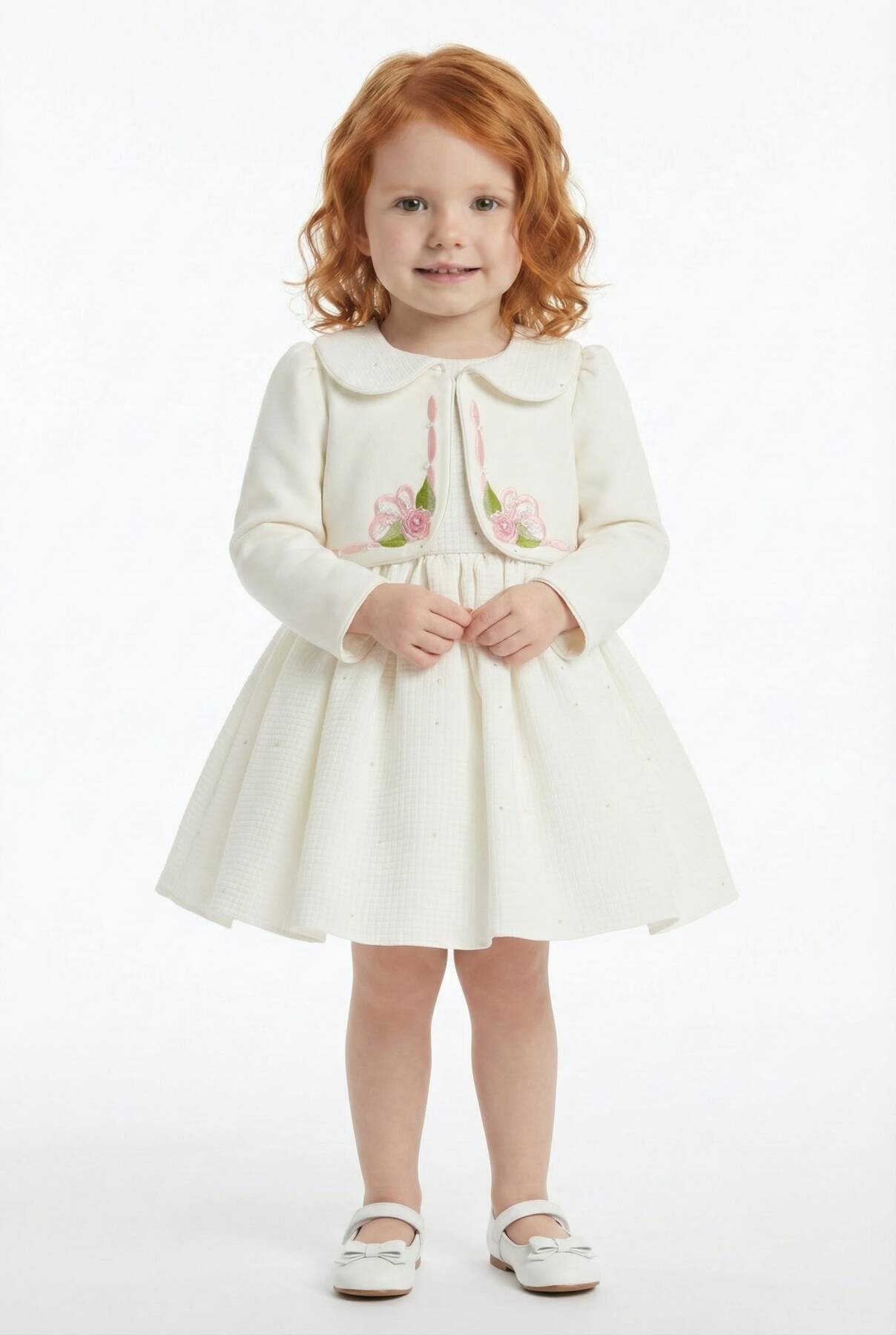 A graceful ensemble designed to capture the innocence and beauty of babyhood. This charming two-piece set includes a sleeveless dress crafted from soft textured fabric with subtle daisy-like embroidery, paired with a beautifully tailored long-sleeve jacket.The jacket features floral embroidery in soft pastels, complete with sequin accents and a rounded Peter Pan collar for a touch of timeless charm. Whether worn together for special occasions or separately for everyday elegance, this outfit is as versatile as it is beautiful.