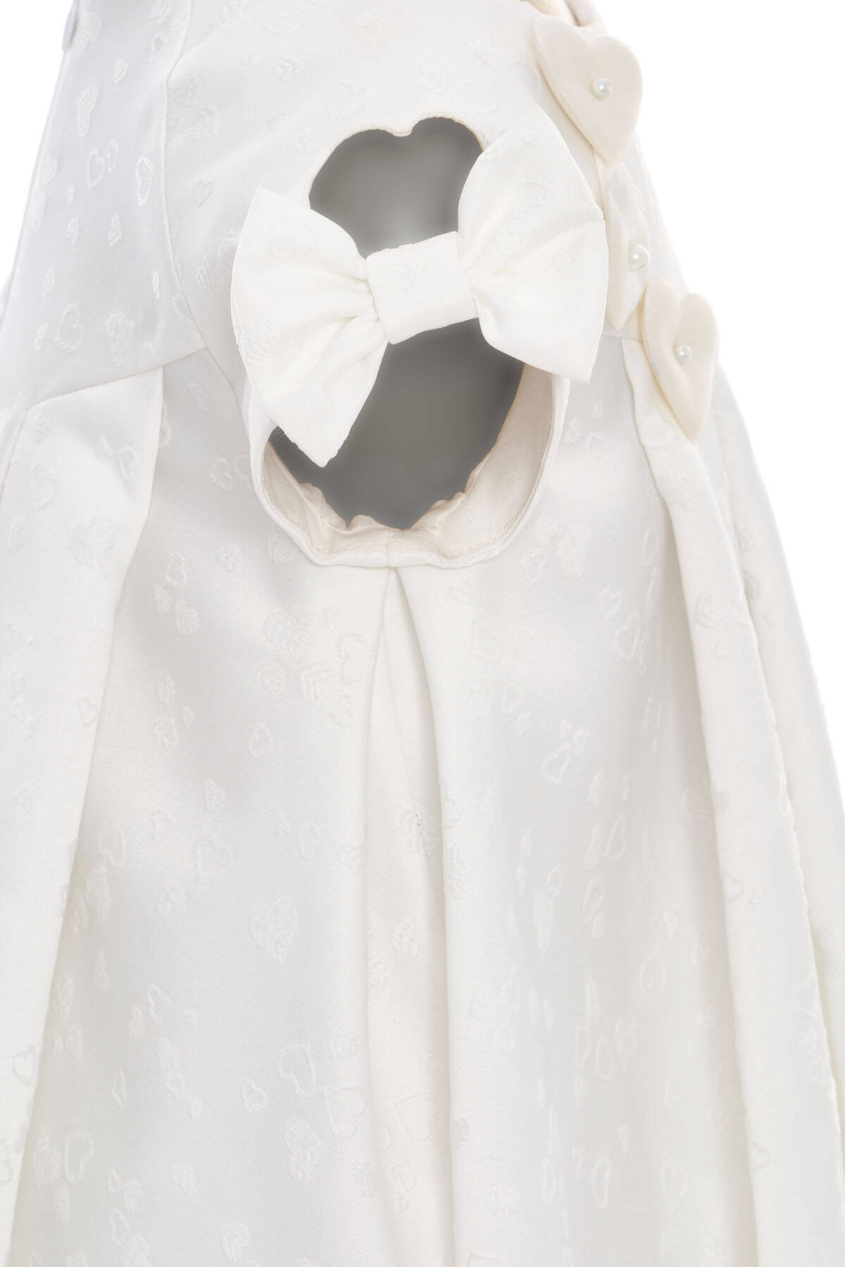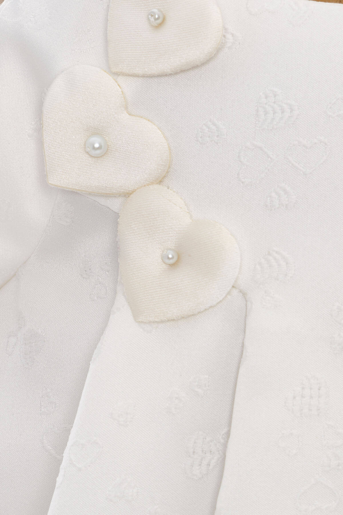 Sweet, playful, and full of charm! This delightful baby dress features a soft heart pattern on a flared silhouette with pleated details. Satin heart appliqués with pearl accents cascade down the shoulders and sleeves, adding texture and cuteness to every angle. At the back, a heart-shaped cutout and matching bow create a surprise detail that’s perfect for special moments. Paired with a matching satin heart headband, this set is ideal for birthdays, family gatherings, or memorable photo sessions.