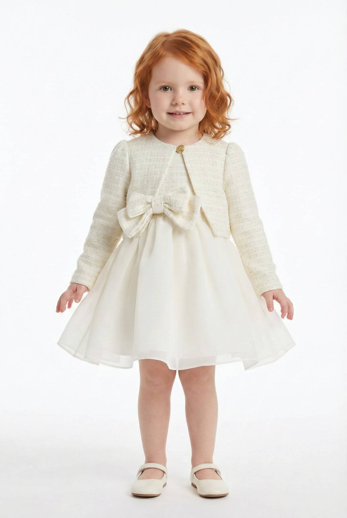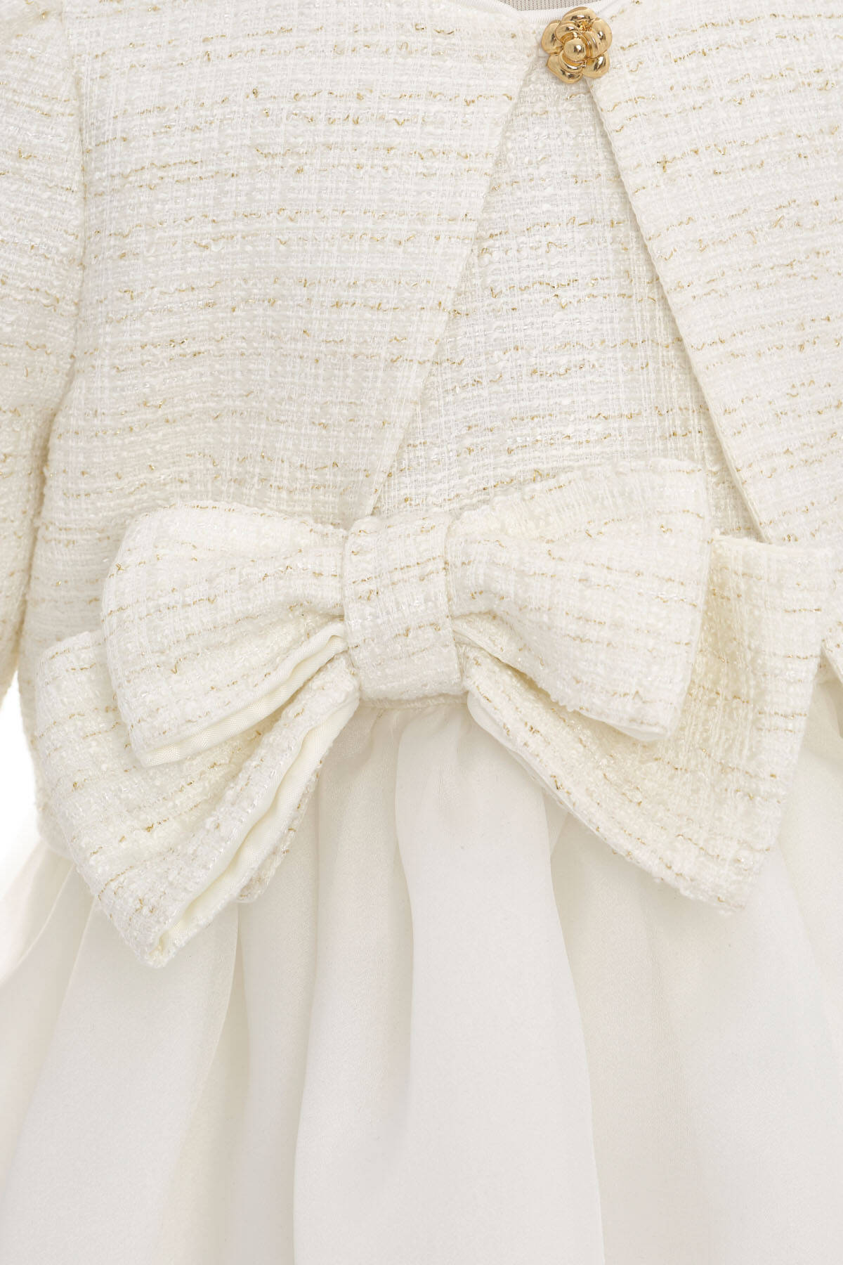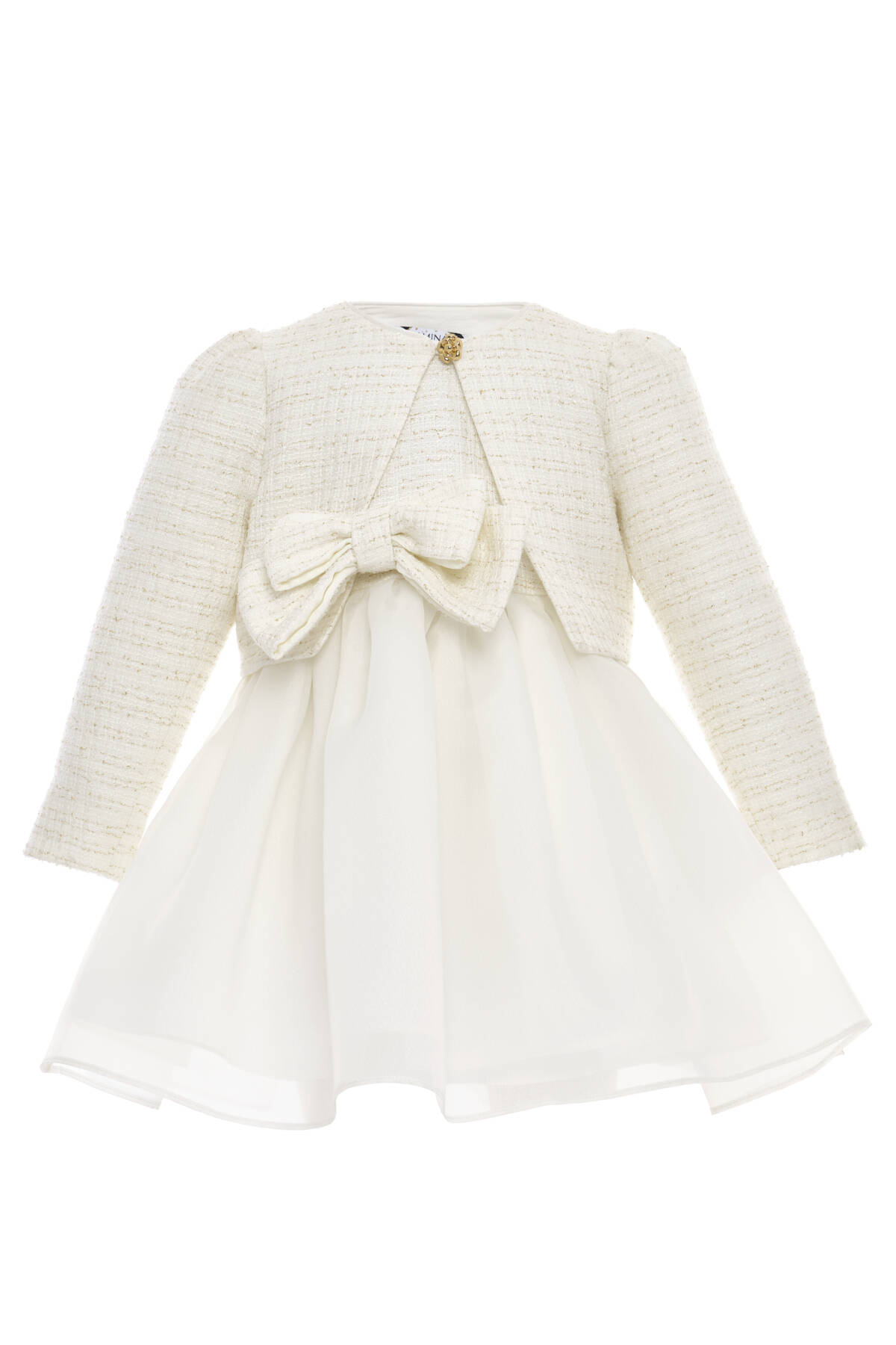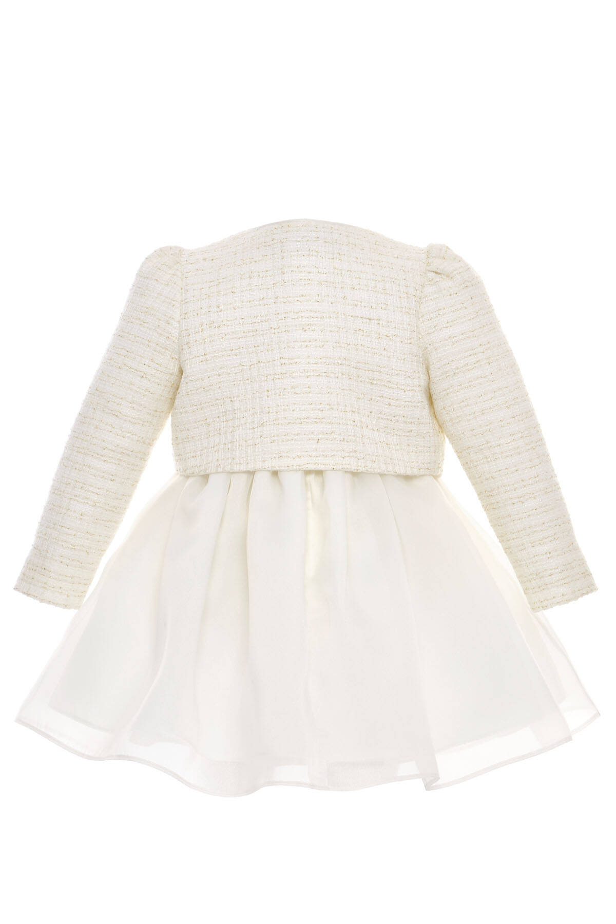 A darling set made for your baby girl's most memorable moments! This charming two-piece ensemble includes a soft tulle-lined satin dress and a matching textured tweed jacket, both adorned with an oversized signature bow. The jacket is elegantly finished with a single gold button and subtle shimmer in the fabric, adding a refined sparkle to her look. Together, the dress and jacket make a standout outfit for birthdays, family events, or formal celebrations. Each piece is also perfect on its own—versatile, comfortable, and beautifully designed for your little one’s wardrobe.