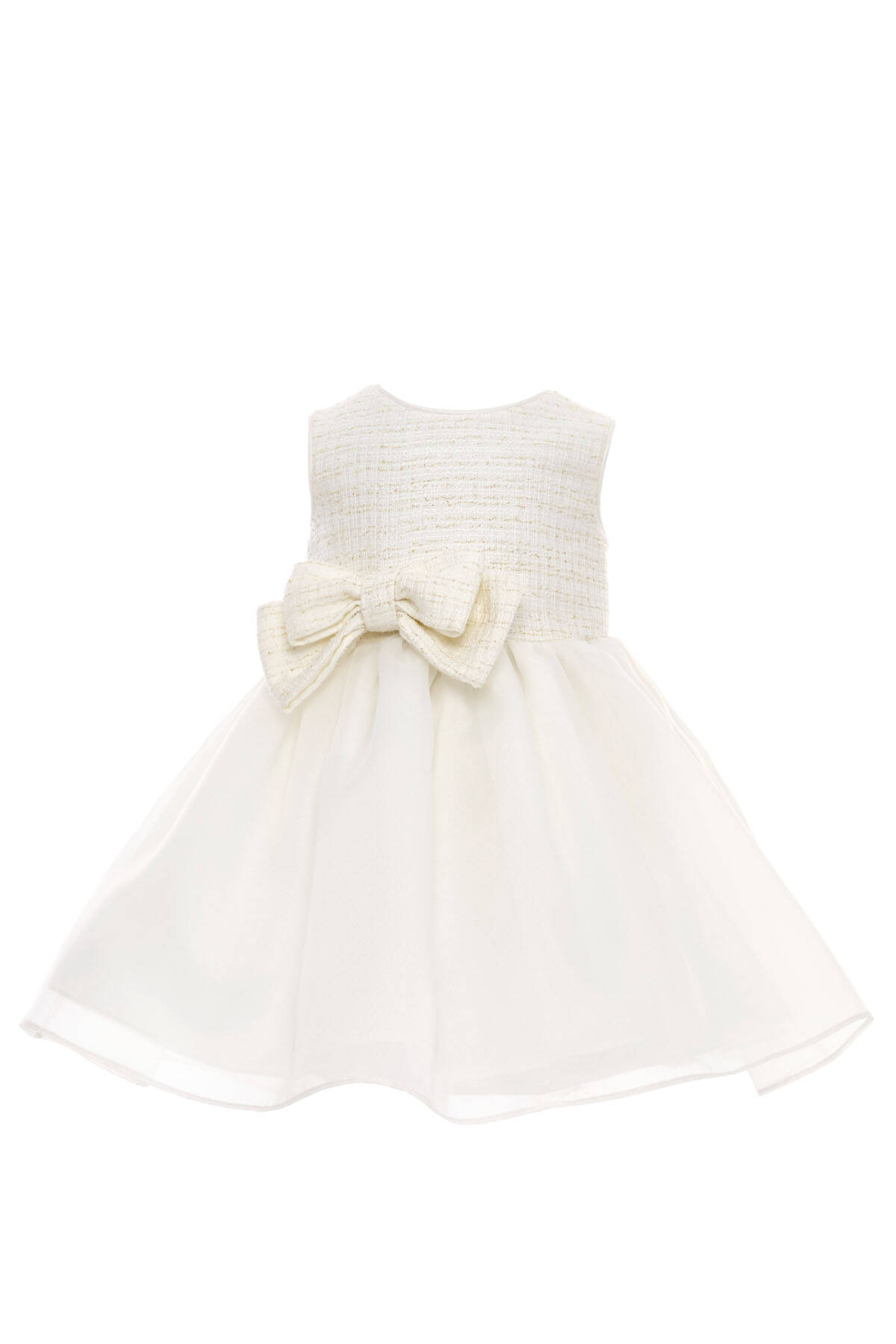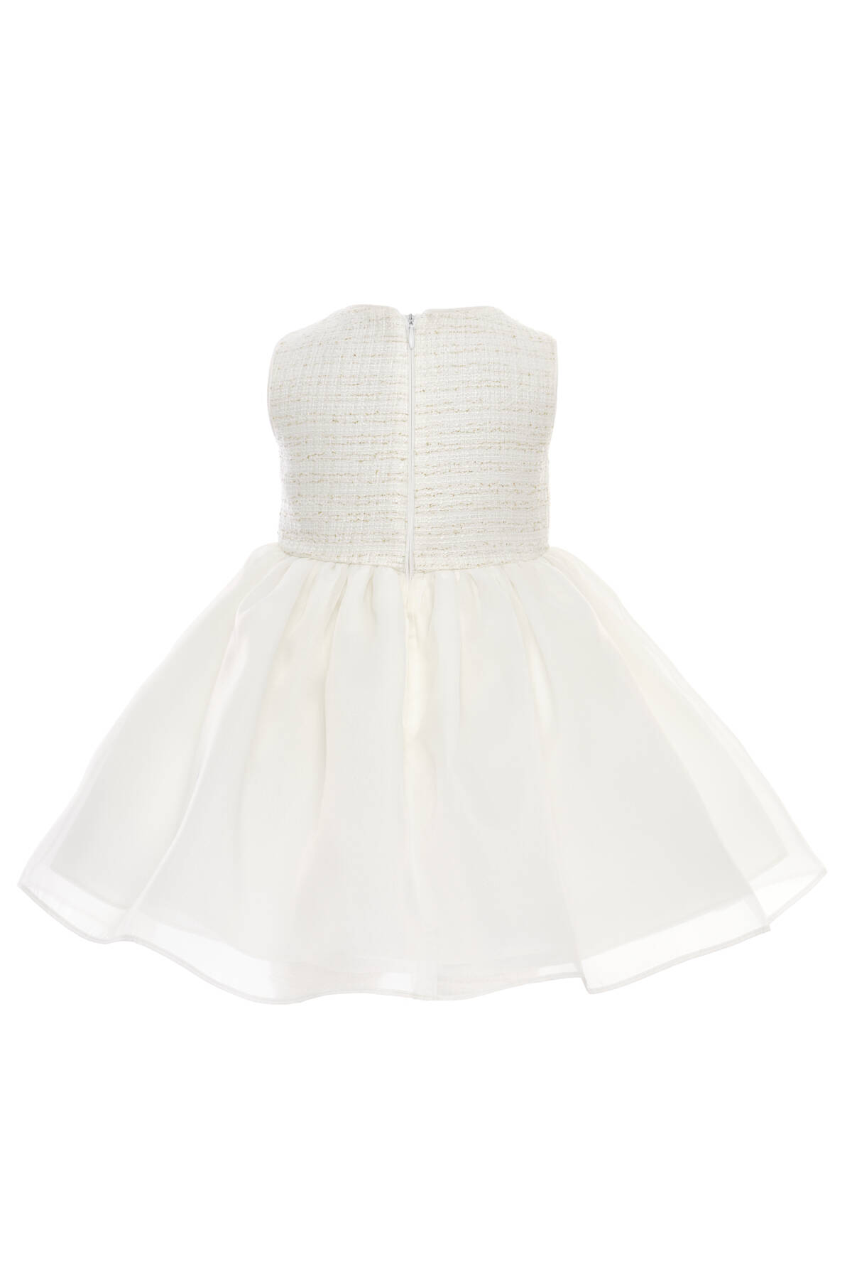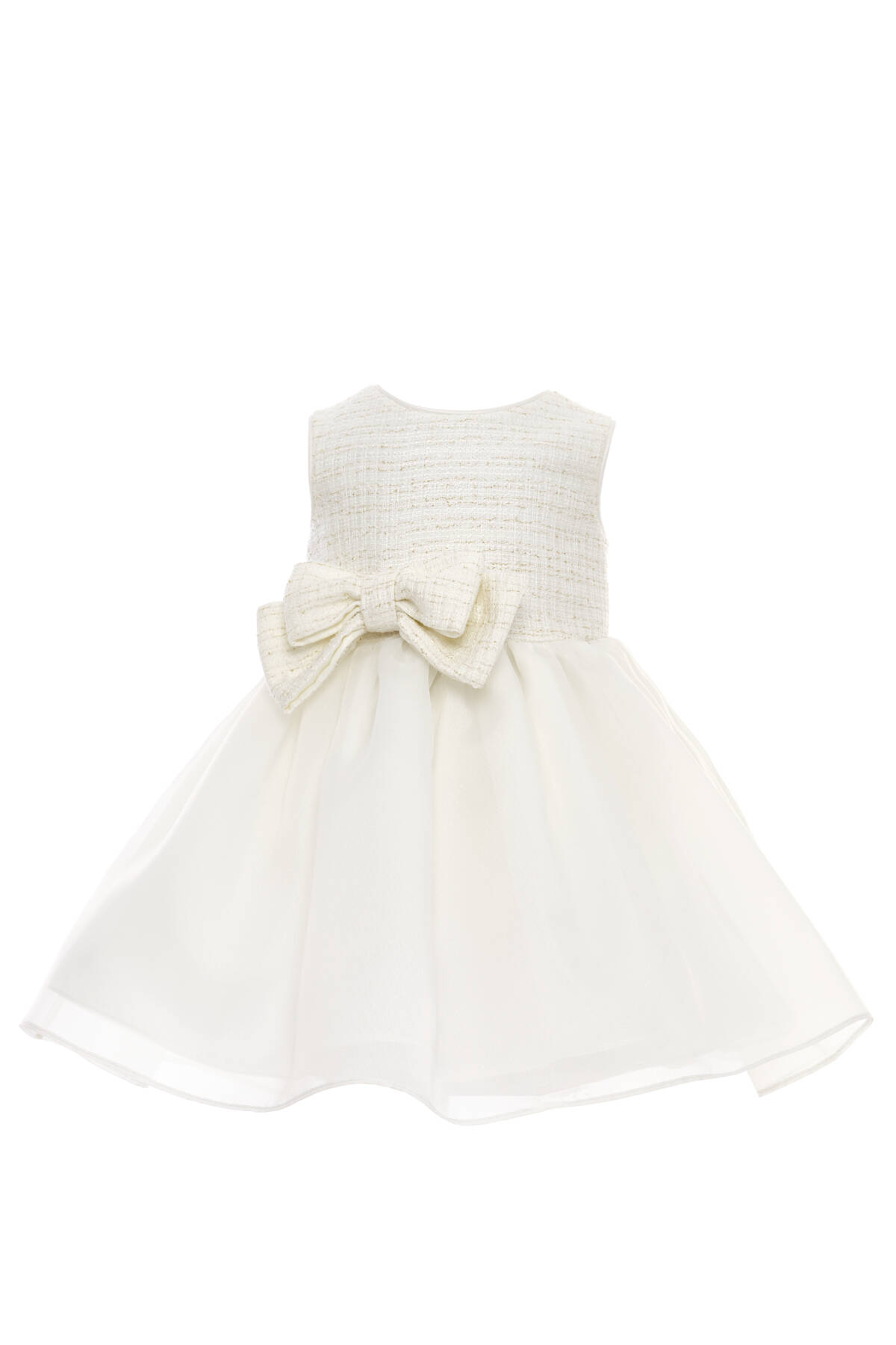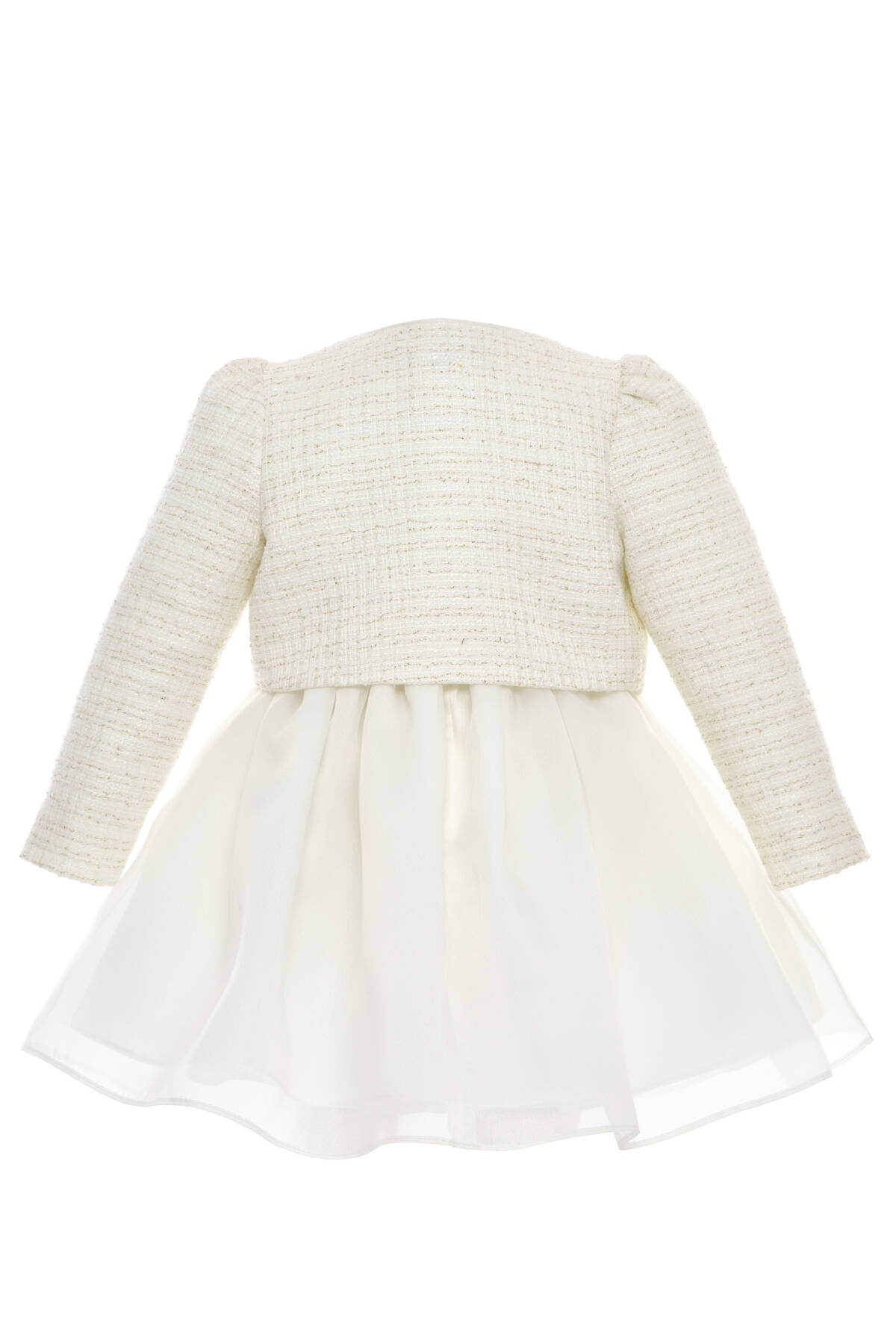 A darling set made for your baby girl's most memorable moments! This charming two-piece ensemble includes a soft tulle-lined satin dress and a matching textured tweed jacket, both adorned with an oversized signature bow. The jacket is elegantly finished with a single gold button and subtle shimmer in the fabric, adding a refined sparkle to her look. Together, the dress and jacket make a standout outfit for birthdays, family events, or formal celebrations. Each piece is also perfect on its own—versatile, comfortable, and beautifully designed for your little one’s wardrobe.