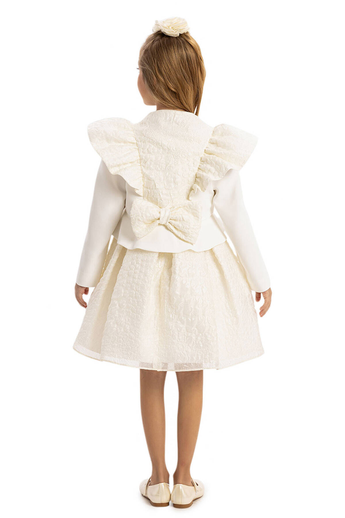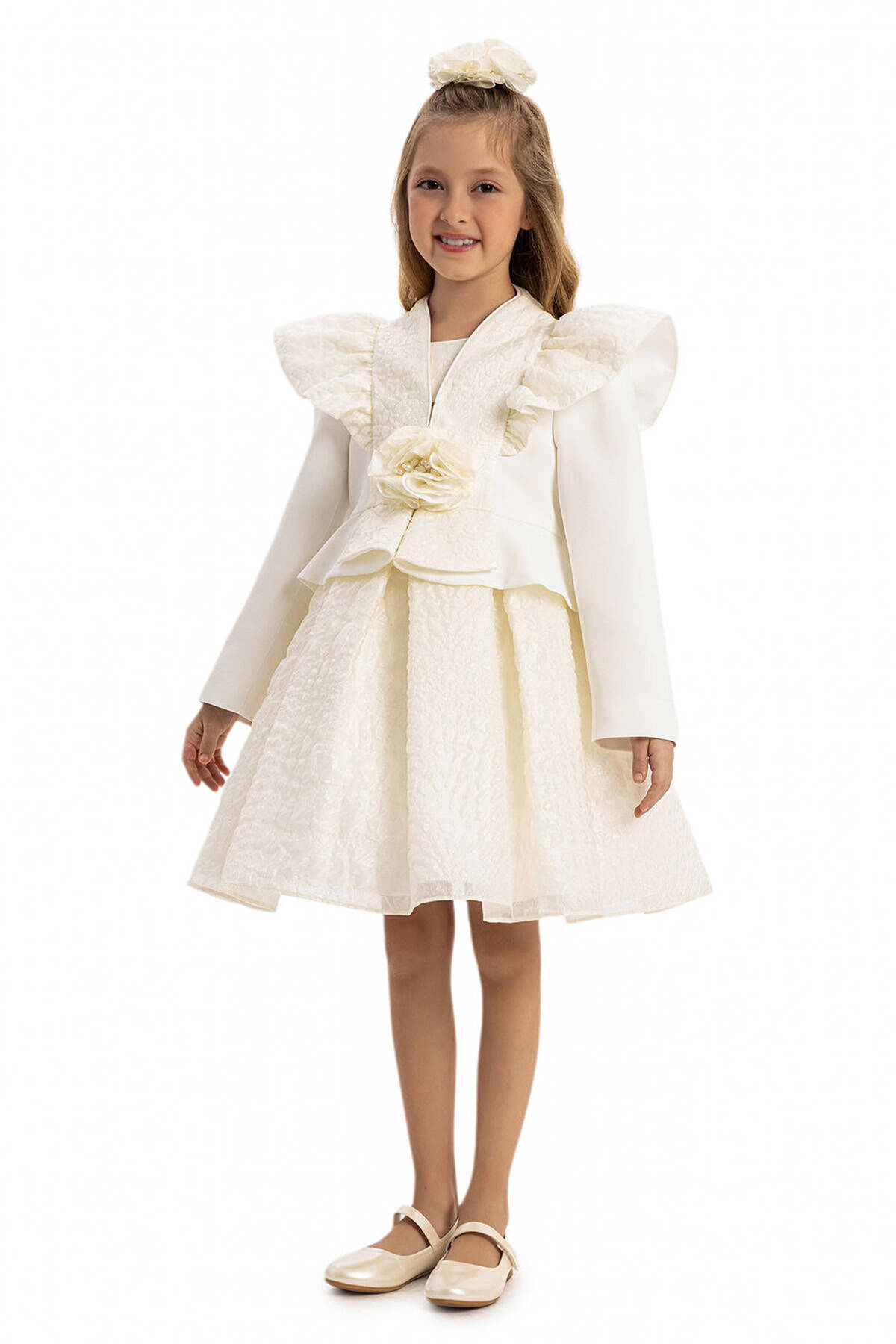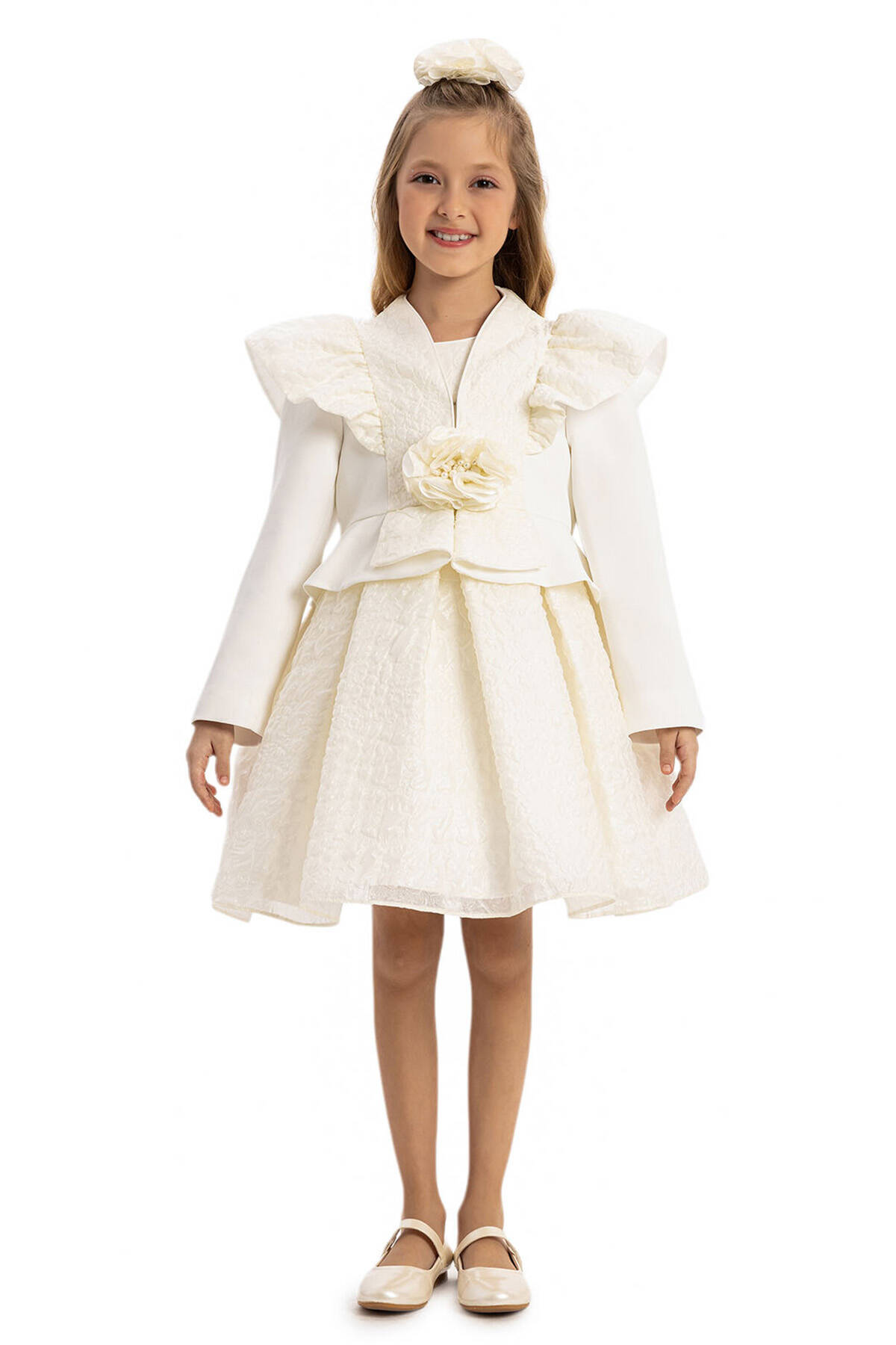 Elevate your little one's style with this enchanting three-piece set, perfect for special occasions. This set includes a sleeveless dress, a stylishly ruffled jacket, and a matching hair accessory. The pastel tones of ecru, powder, and blue add a touch of elegance, while the exquisite floral embellishments and bow accents complete the look. Designed with lightweight and comfortable fabrics, this set ensures your child feels and looks her best all day long, whether at weddings, birthdays, or celebrations.