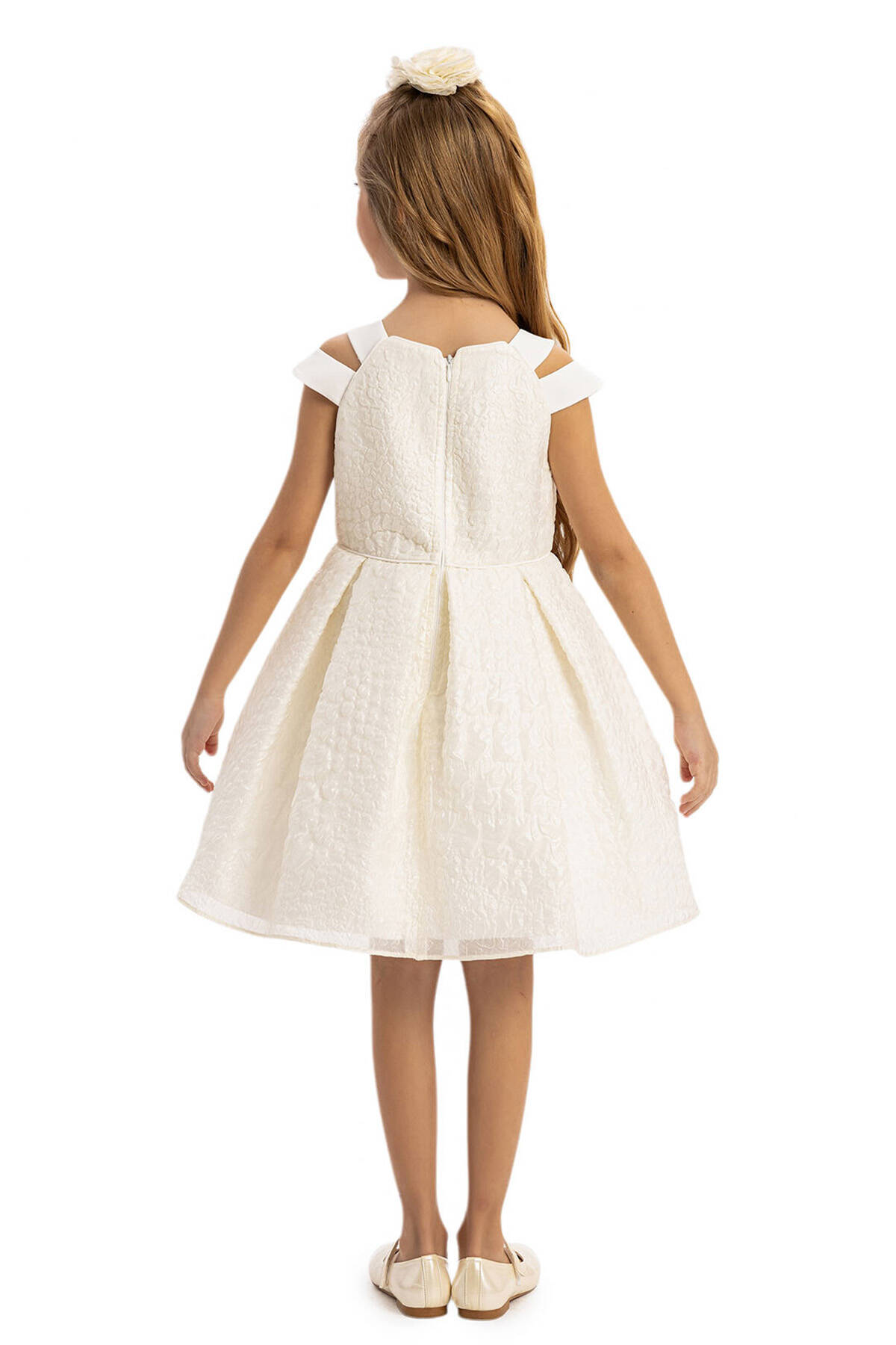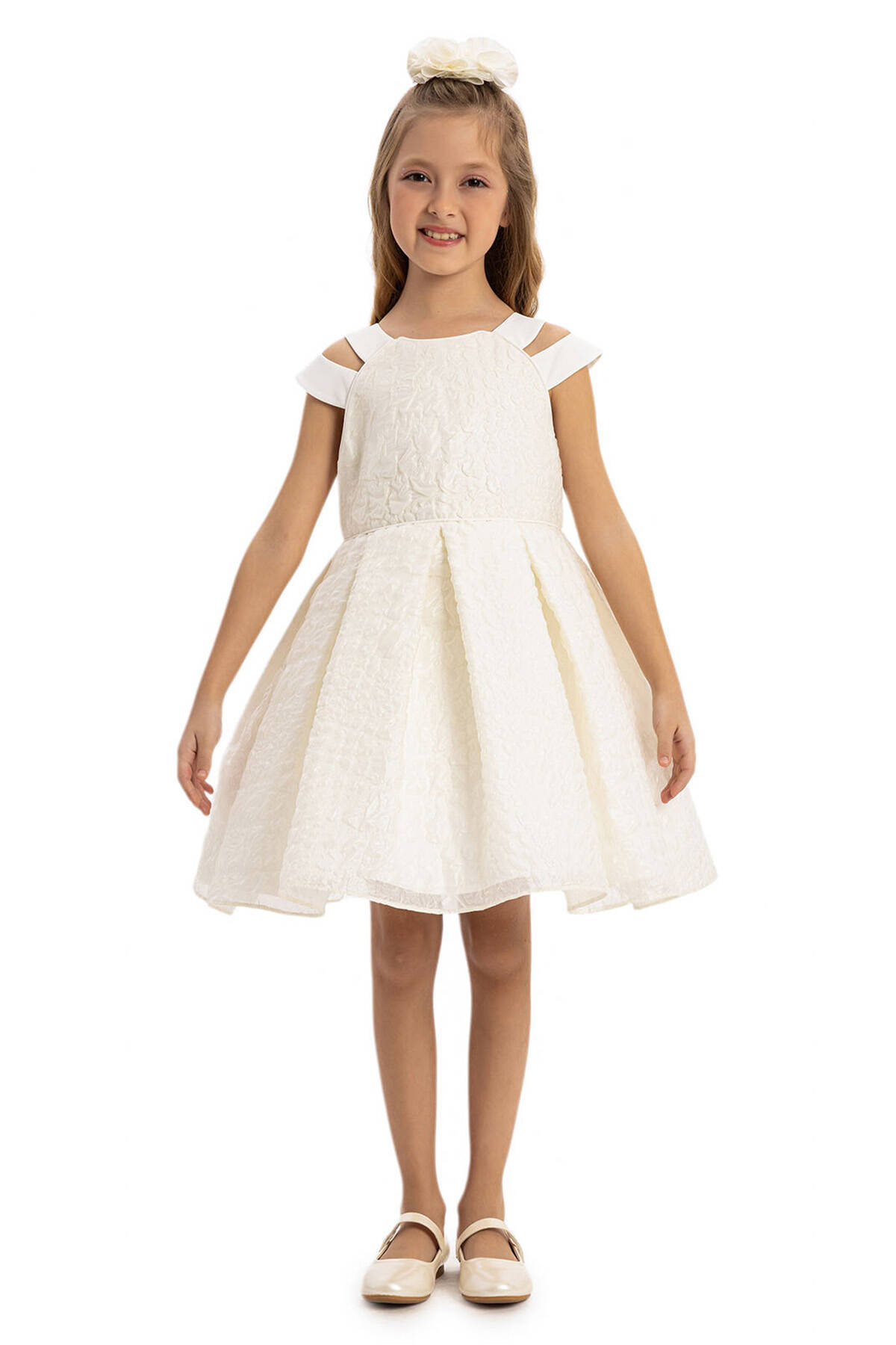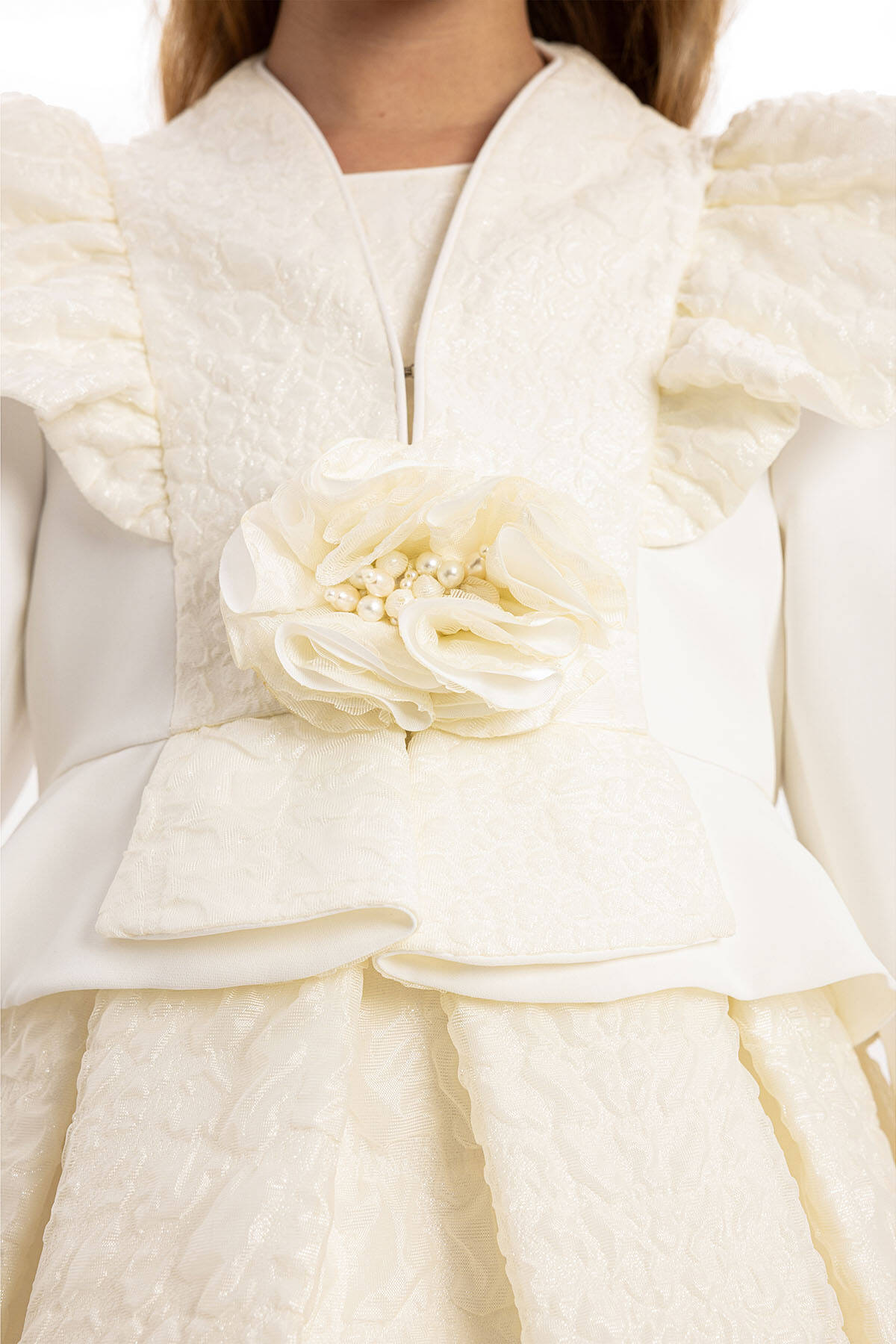 Elevate your little one's style with this enchanting three-piece set, perfect for special occasions. This set includes a sleeveless dress, a stylishly ruffled jacket, and a matching hair accessory. The pastel tones of ecru, powder, and blue add a touch of elegance, while the exquisite floral embellishments and bow accents complete the look. Designed with lightweight and comfortable fabrics, this set ensures your child feels and looks her best all day long, whether at weddings, birthdays, or celebrations.