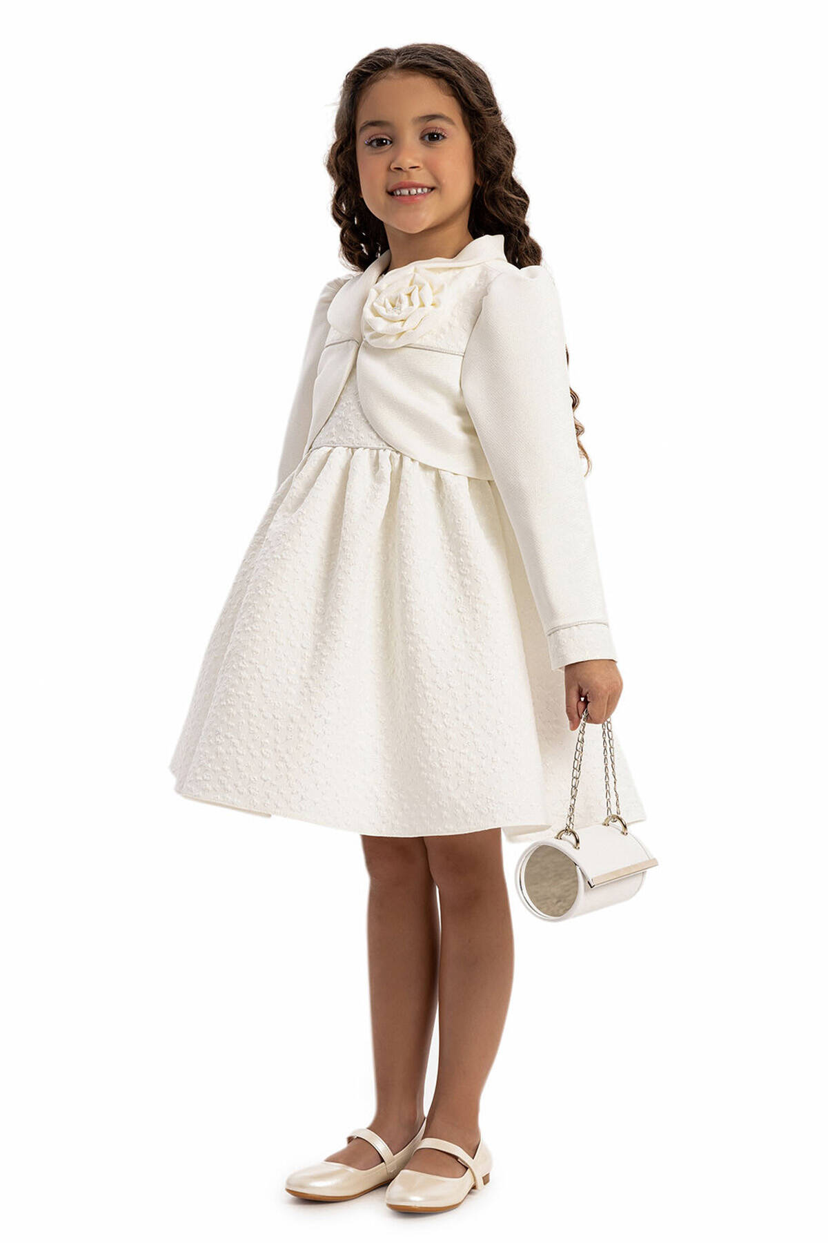 his set combines timeless design with contemporary details to create a sophisticated look. Crafted from high-quality textured fabric with subtle shimmer, ensuring elegance and comfort. Sleeveless design with a classic silhouette, perfect for both casual and formal events. A cropped jacket with long sleeves, featuring a beautifully crafted flower embellishment for added charm. A coordinated bag with a chain strap to complete the look.