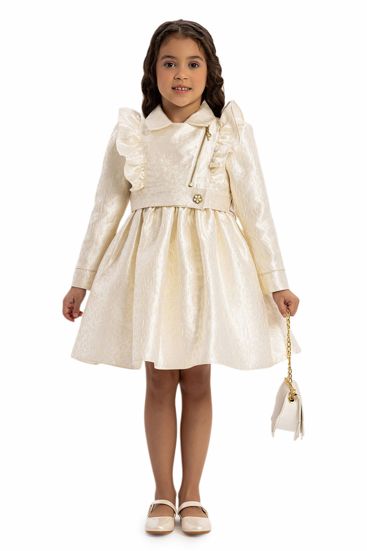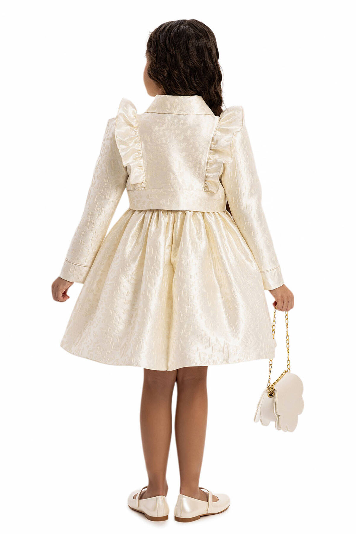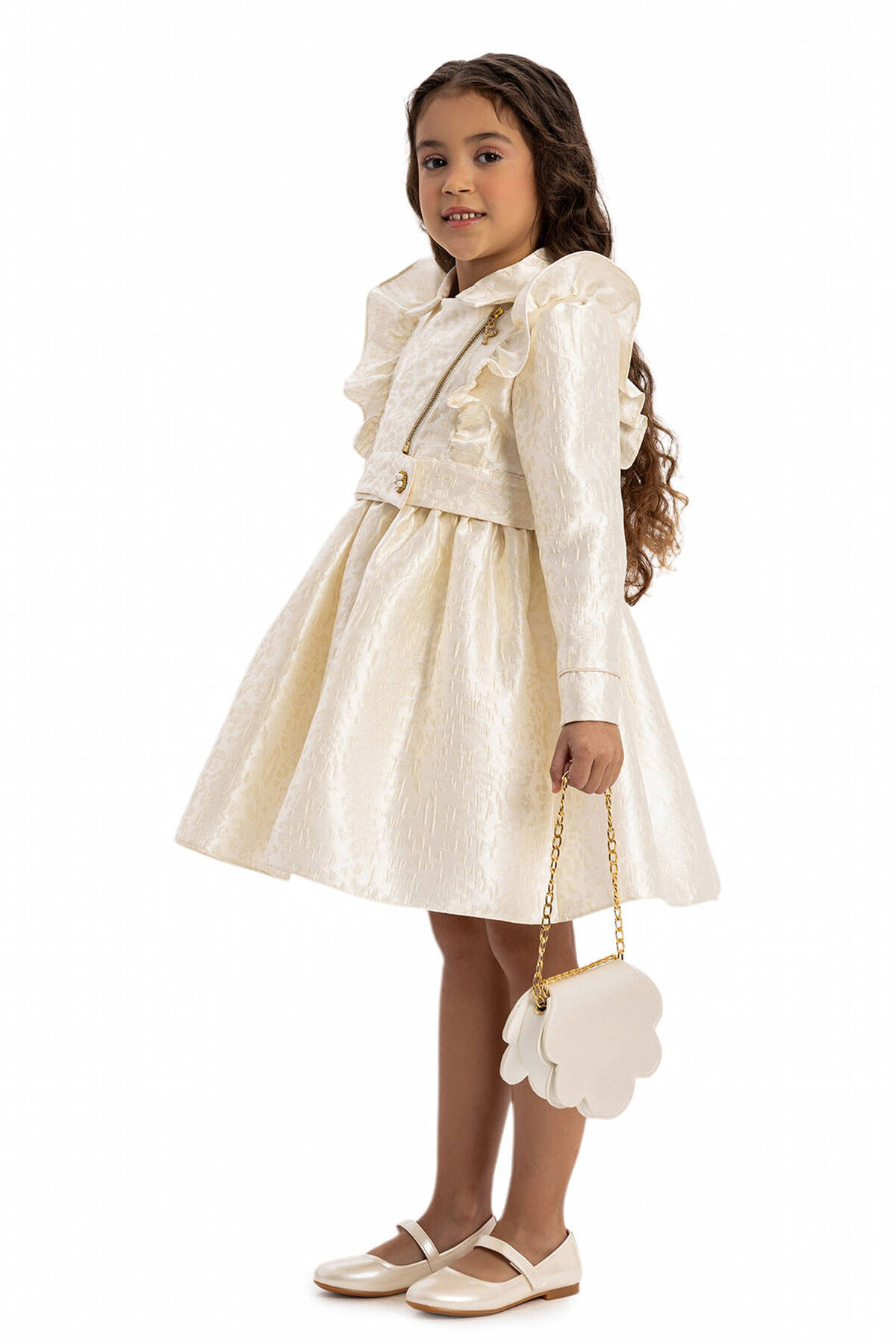 A perfect combination of sophistication and charm, this 3-piece set is designed to make every little girl shine. The set features a sleeveless dress, a chic long-sleeved jacket, and a matching flower-shaped handbag. Crafted from high-quality jacquard fabric, the dress and jacket boast a subtle floral pattern with a luxurious sheen. The jacket is adorned with frilled details, a pearl-accented button, and a stylish asymmetric zipper. The matching handbag, with its unique scalloped design and gold chain strap, adds a touch of elegance to complete the ensemble.