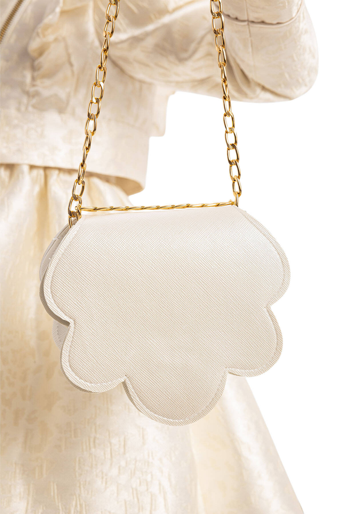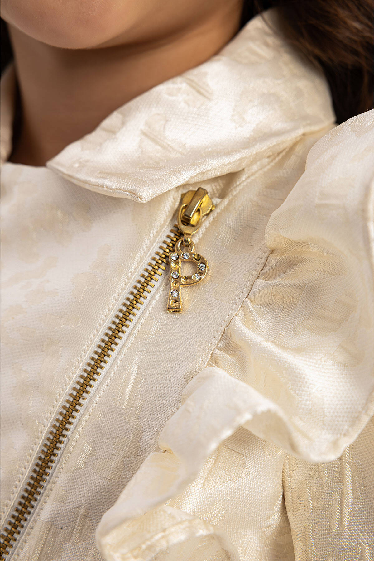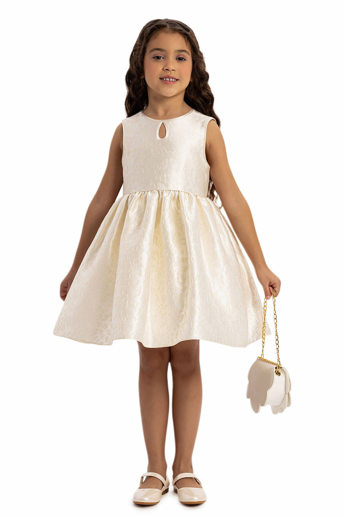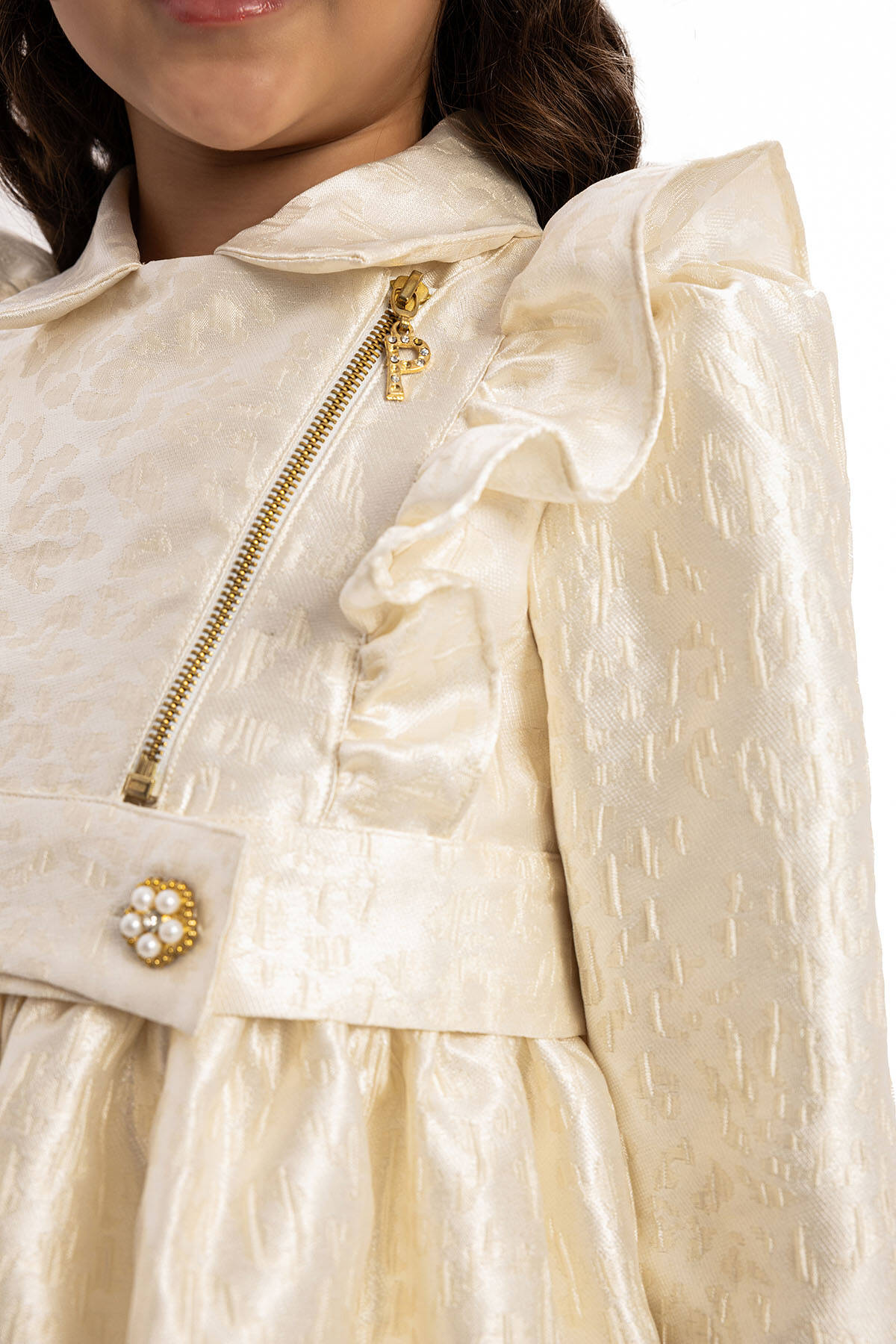 A perfect combination of sophistication and charm, this 3-piece set is designed to make every little girl shine. The set features a sleeveless dress, a chic long-sleeved jacket, and a matching flower-shaped handbag. Crafted from high-quality jacquard fabric, the dress and jacket boast a subtle floral pattern with a luxurious sheen. The jacket is adorned with frilled details, a pearl-accented button, and a stylish asymmetric zipper. The matching handbag, with its unique scalloped design and gold chain strap, adds a touch of elegance to complete the ensemble.