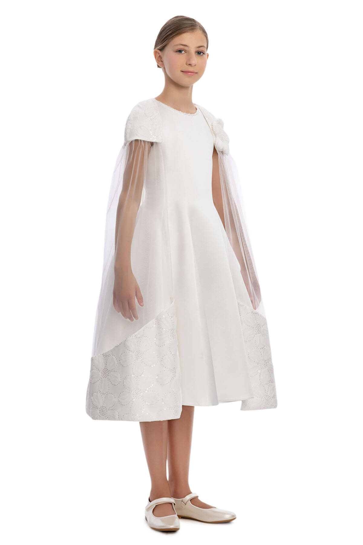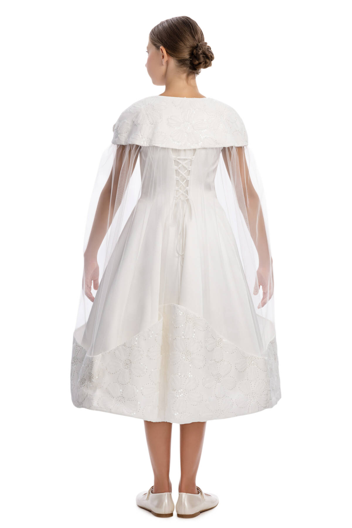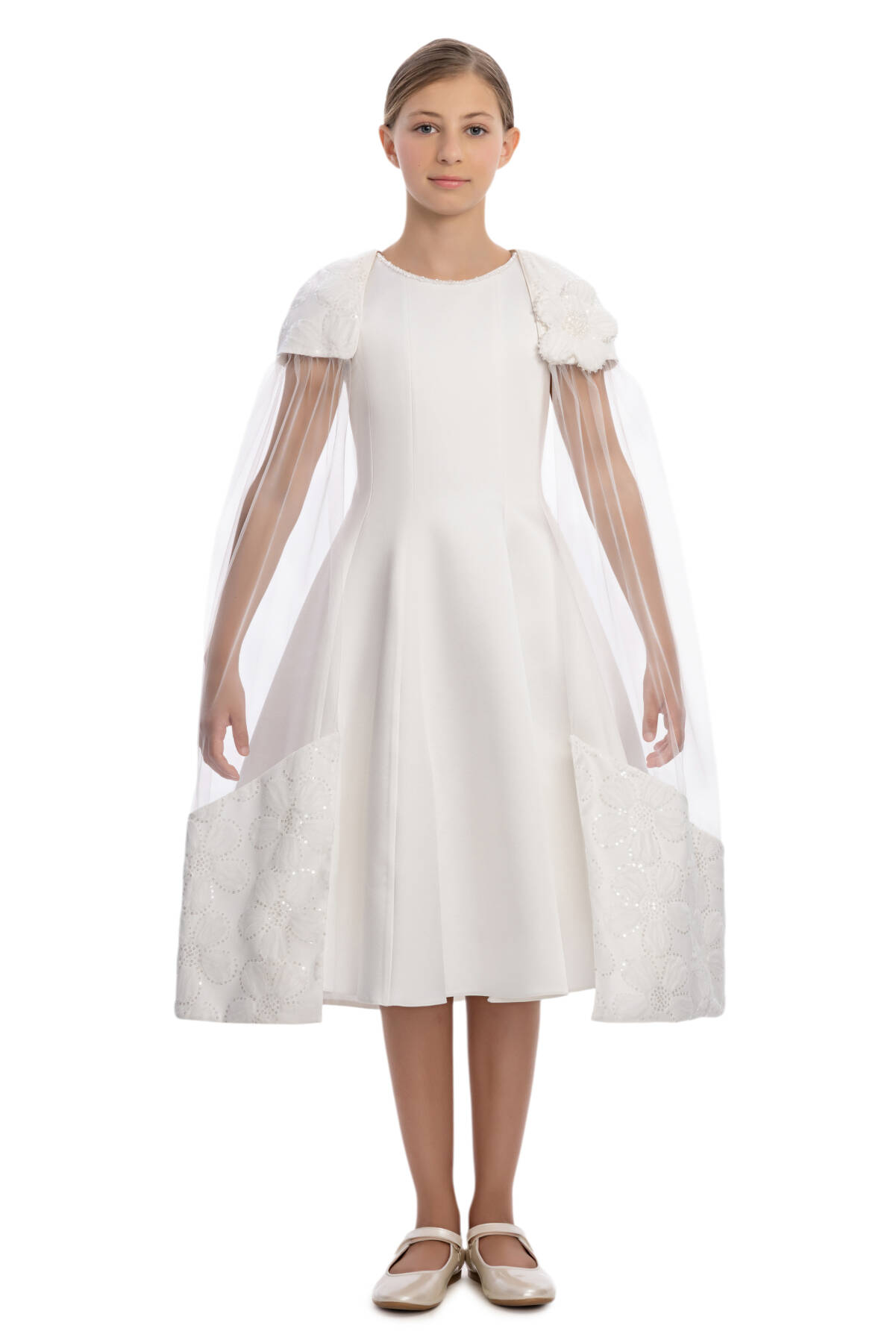 A sophisticated and elegant design crafted for her most special moments! This midi-length dress features a sleeveless, fitted bodice with a flattering flared skirt and a chic lace-up detail at the back for the perfect fit. The standout feature is the removable sheer cape, delicately attached at the shoulders with floral appliqués and soft sequin touches. The cape flows gracefully to the hem, creating a magical, fairy-tale effect. Worn with the cape, the dress radiates drama and elegance; without it, it transforms into a timeless classic. Designed with comfort in mind, this dress is ideal for weddings, birthdays, and any grand celebration where she deserves to shine.