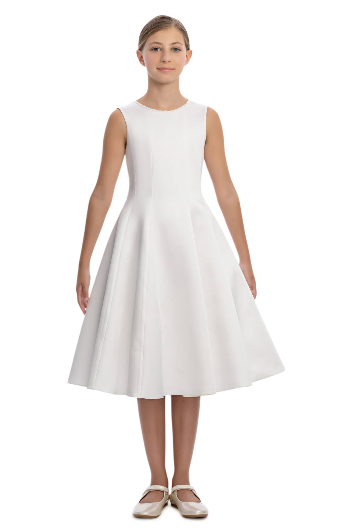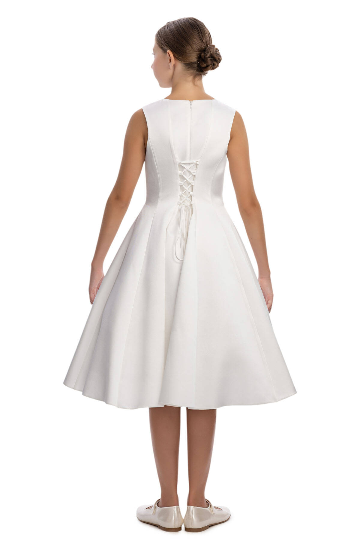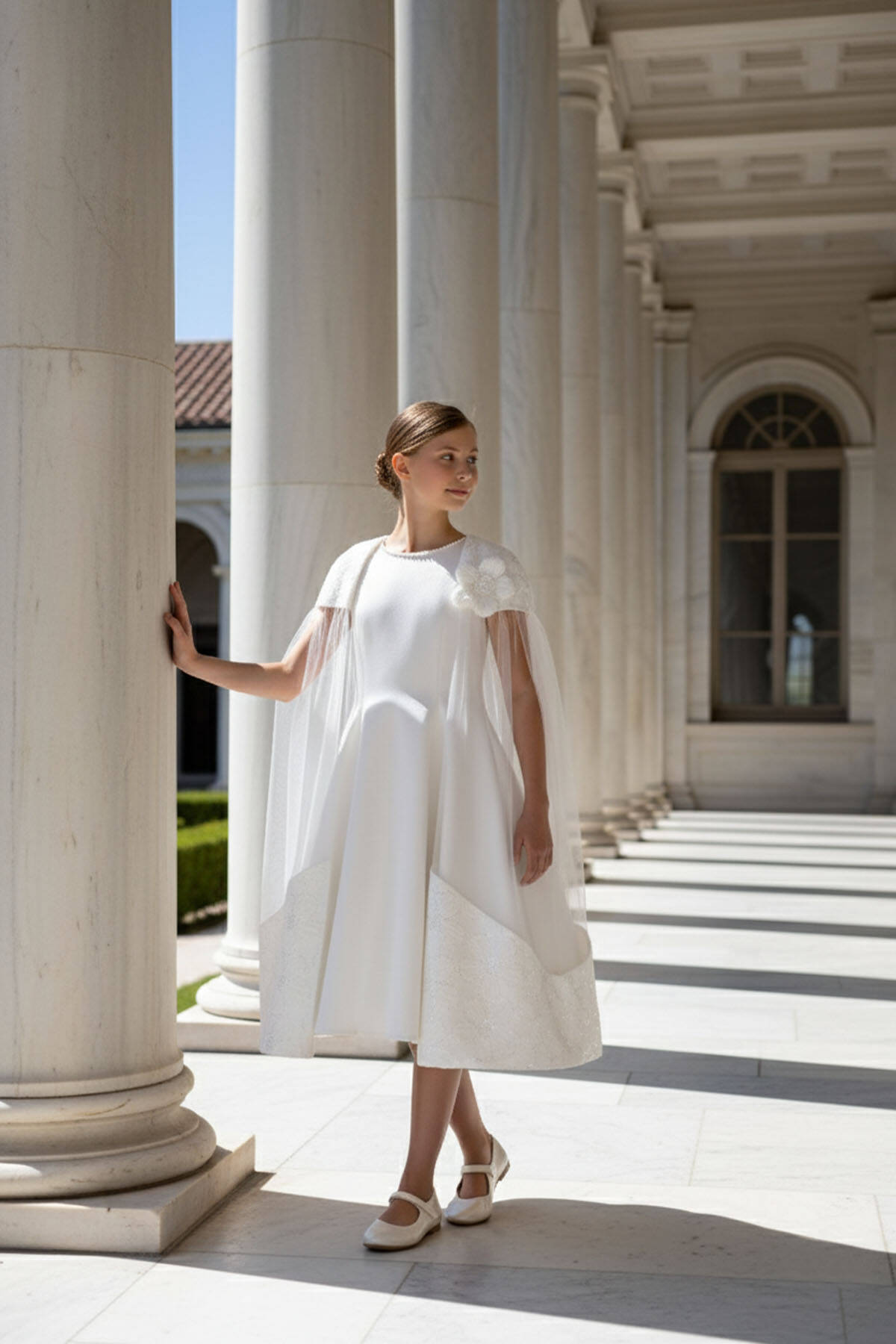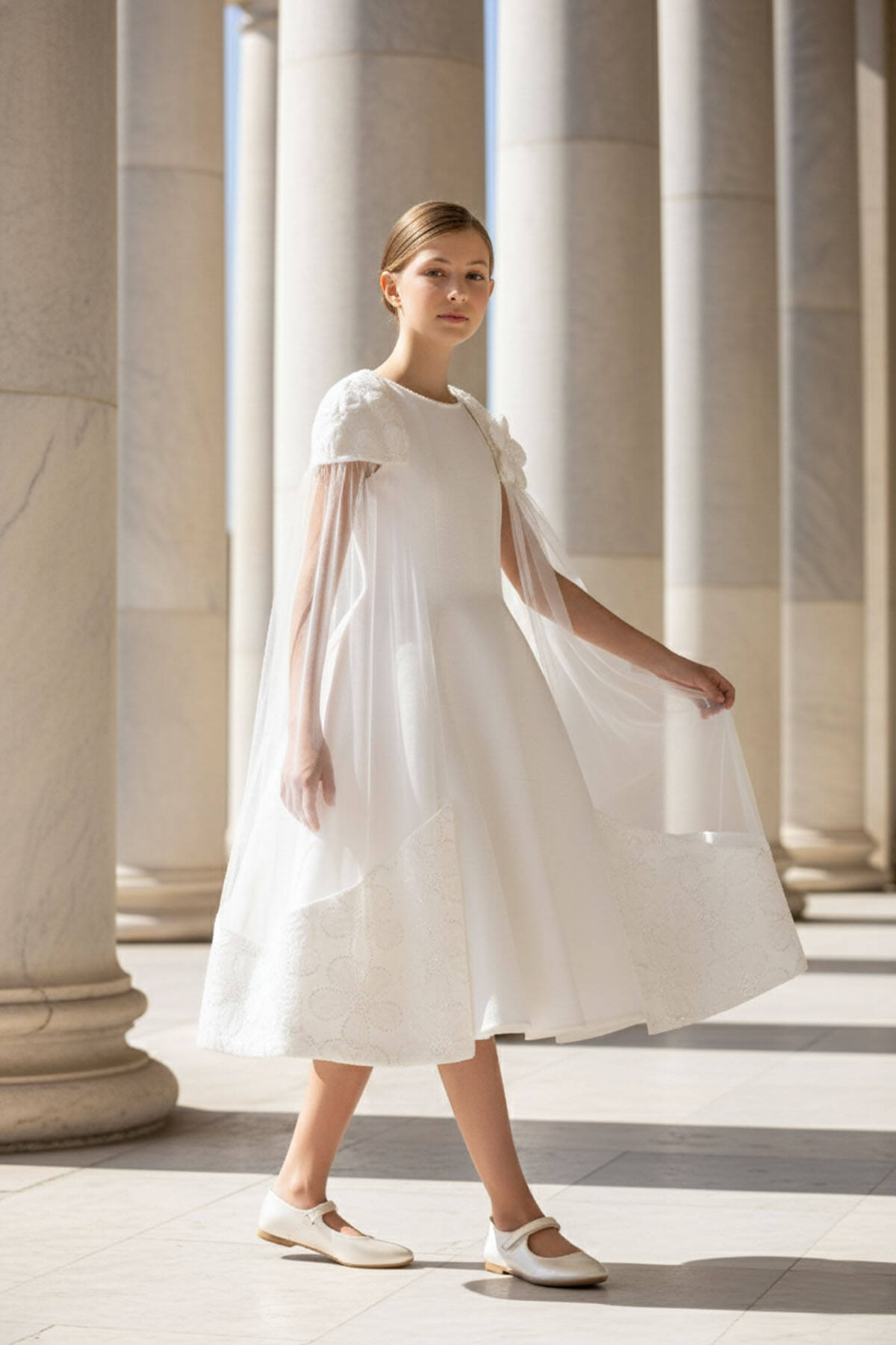 A sophisticated and elegant design crafted for her most special moments! This midi-length dress features a sleeveless, fitted bodice with a flattering flared skirt and a chic lace-up detail at the back for the perfect fit. The standout feature is the removable sheer cape, delicately attached at the shoulders with floral appliqués and soft sequin touches. The cape flows gracefully to the hem, creating a magical, fairy-tale effect. Worn with the cape, the dress radiates drama and elegance; without it, it transforms into a timeless classic. Designed with comfort in mind, this dress is ideal for weddings, birthdays, and any grand celebration where she deserves to shine.