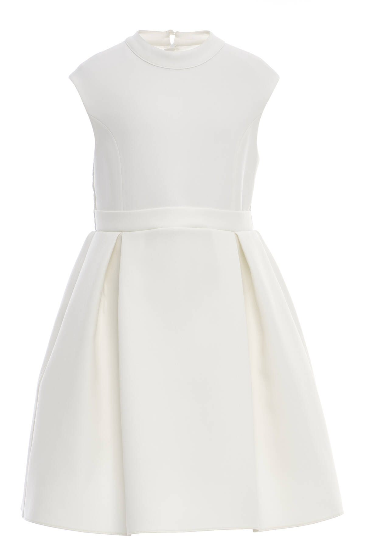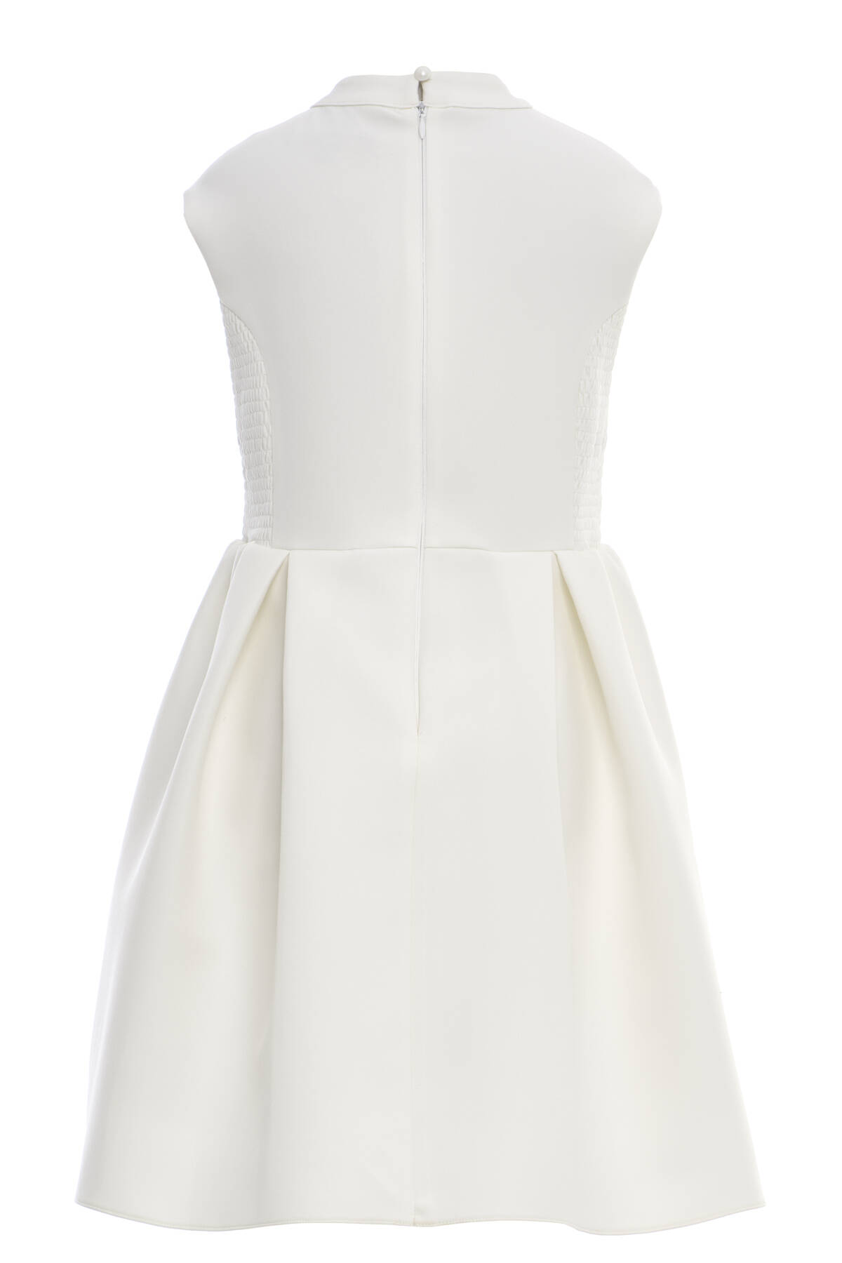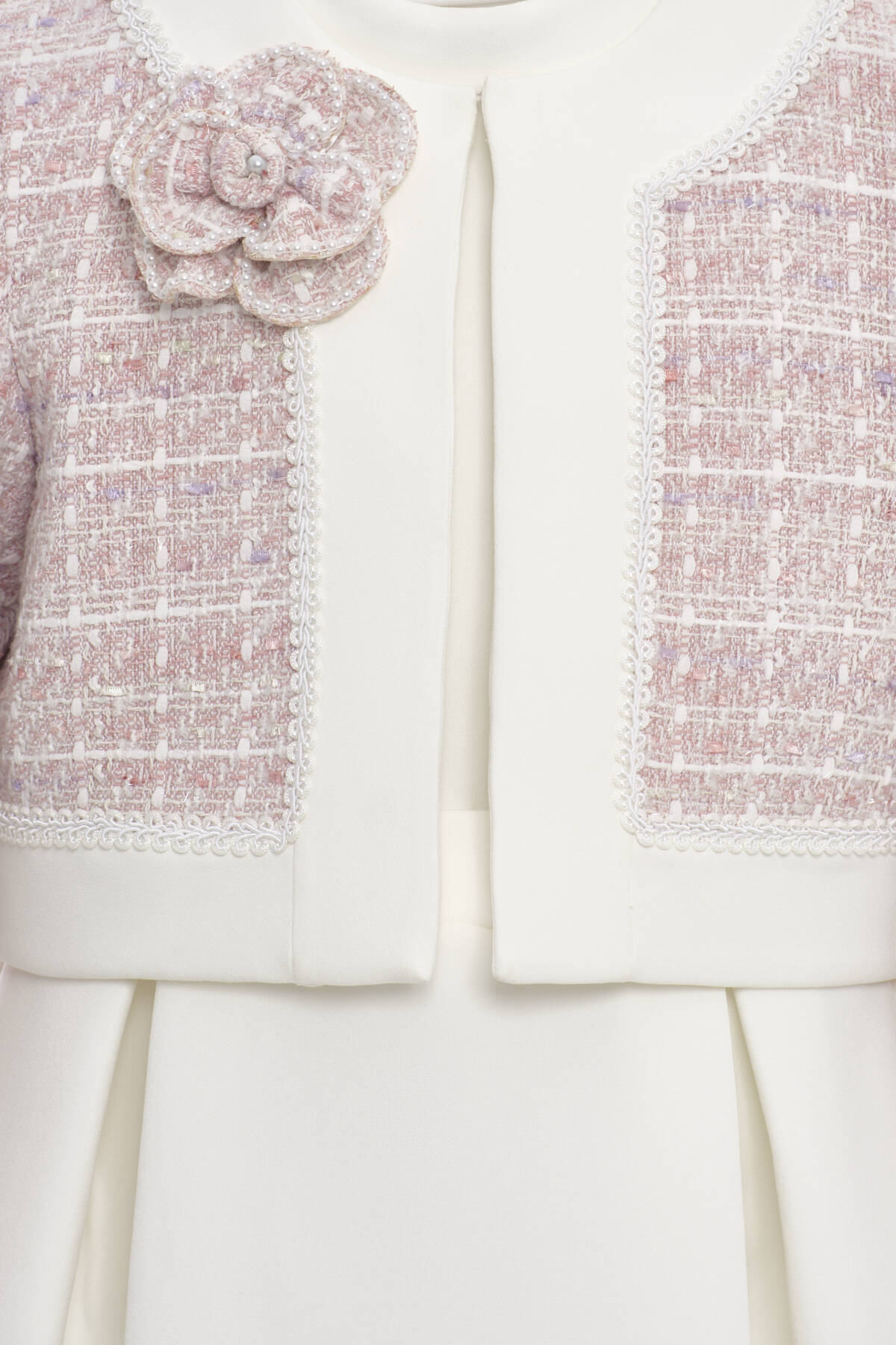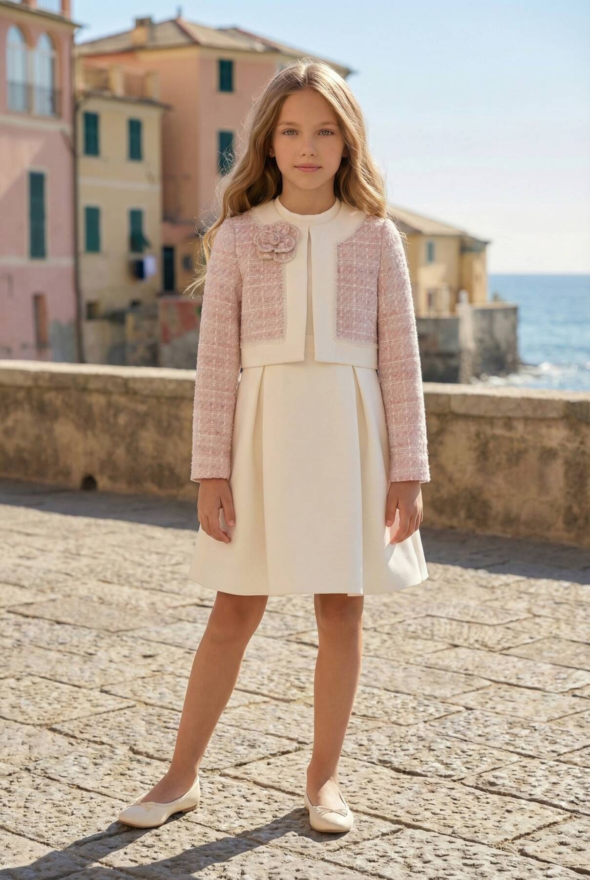 An elegant and fresh design for girls who adore timeless fashion. This two-piece set includes a sleeveless satin dress with a gently structured silhouette and box pleats that add fullness and grace. The side shirring ensures a comfortable fit while maintaining a sleek look.The matching cropped jacket is crafted in soft tweed with shimmering pastel tones and detailed with embroidered trims and a beautiful handcrafted tweed flower brooch. It’s the perfect ensemble for spring celebrations, weddings, or family gatherings—refined yet playful.