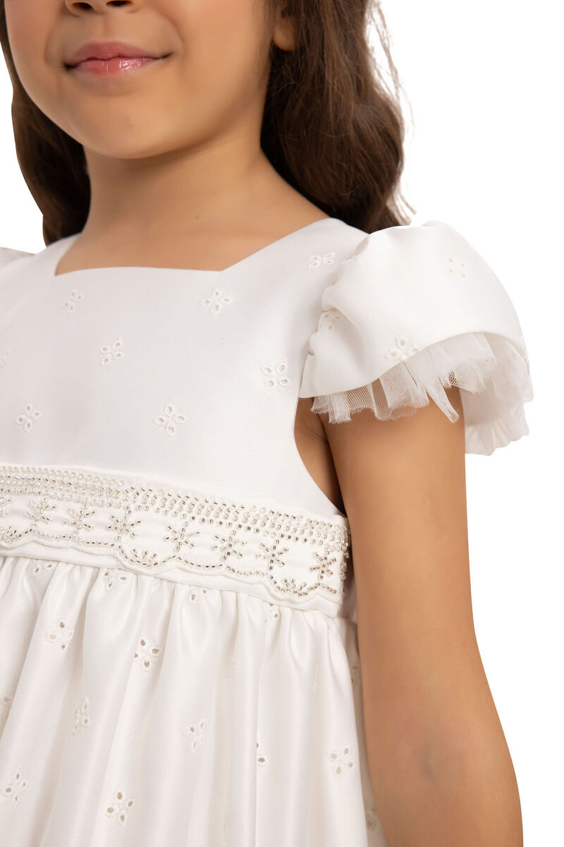 This adorable dress and bag set is the perfect combination of style and charm for your little princess. Features a round neckline with puffed short sleeves adorned with tulle accents. The back has a large, eye-catching bow, adding a touch of playfulness to the design. The bodice is embellished with a sparkling waistband for added elegance. The hemline is scalloped with embroidered cutouts, creating a graceful finish. Perfect for birthdays, weddings, holiday parties, and other formal celebrations.