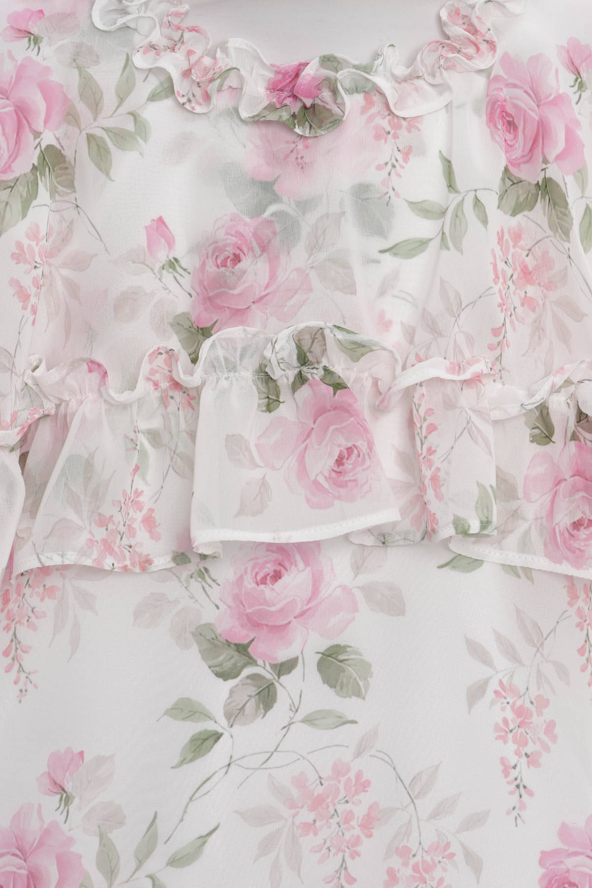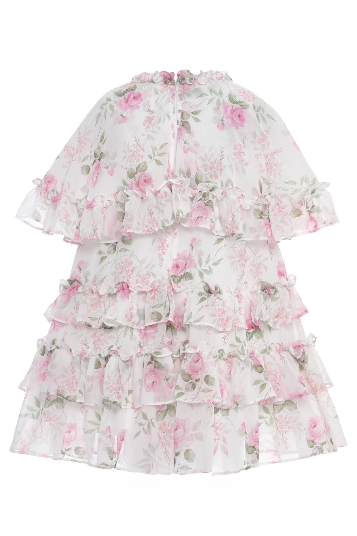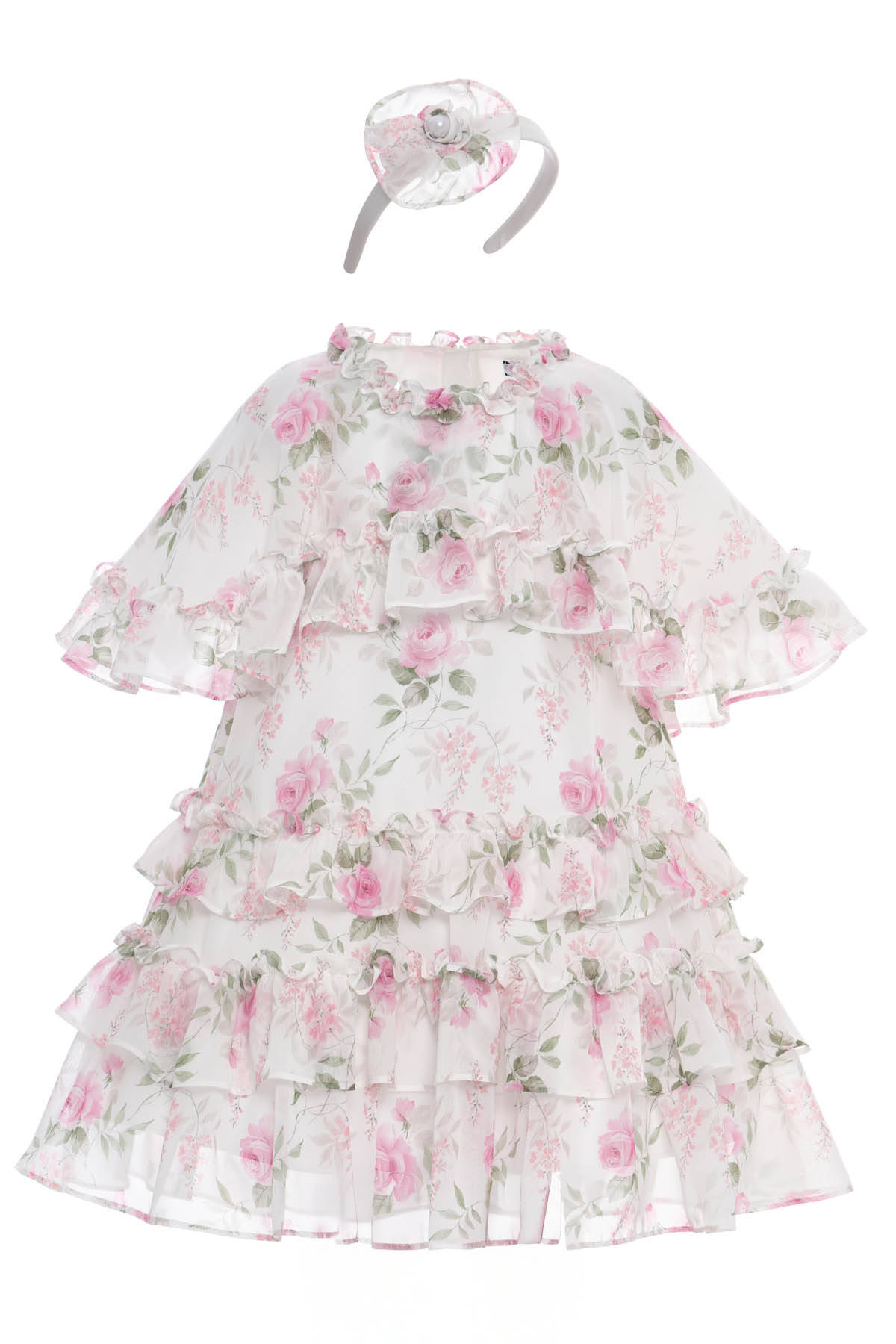 Light as air and blooming with charm, this floral chiffon dress is a whimsical dream for little girls. The soft A-line silhouette is brought to life with cascading tiered ruffles and a delicate rose print that evokes garden party elegance. The frill-trimmed neckline and short puffed sleeves complete the romantic look with a vintage-inspired feel. A matching floral headband with a pearl-centered chiffon rose adds the final touch. Perfect for birthdays, special outings, or sweet spring celebrations.