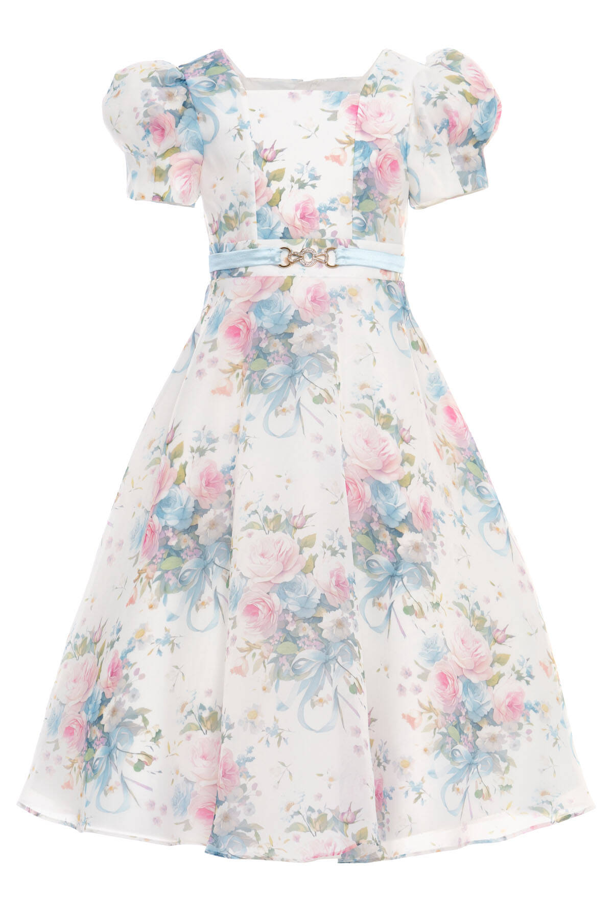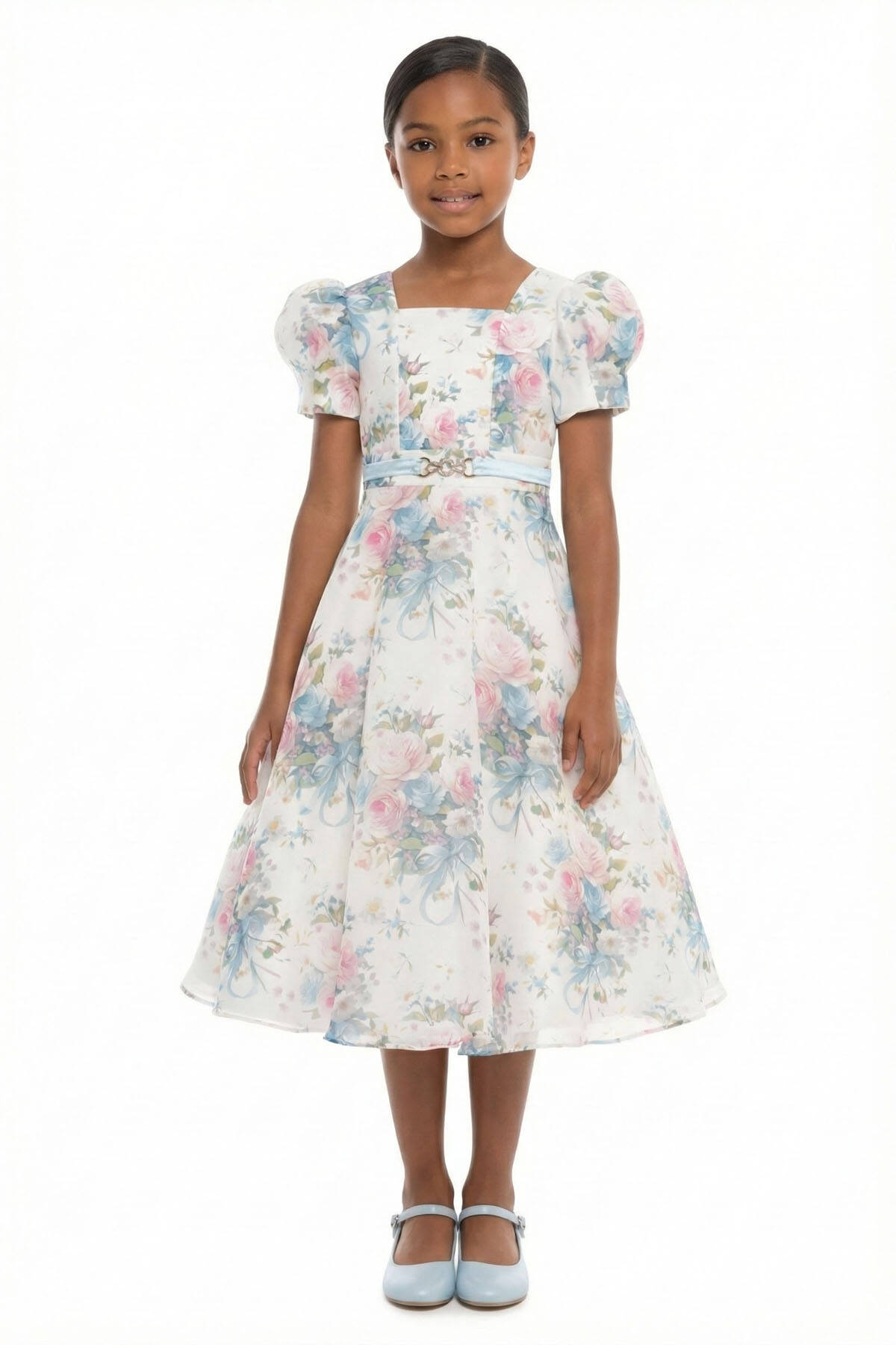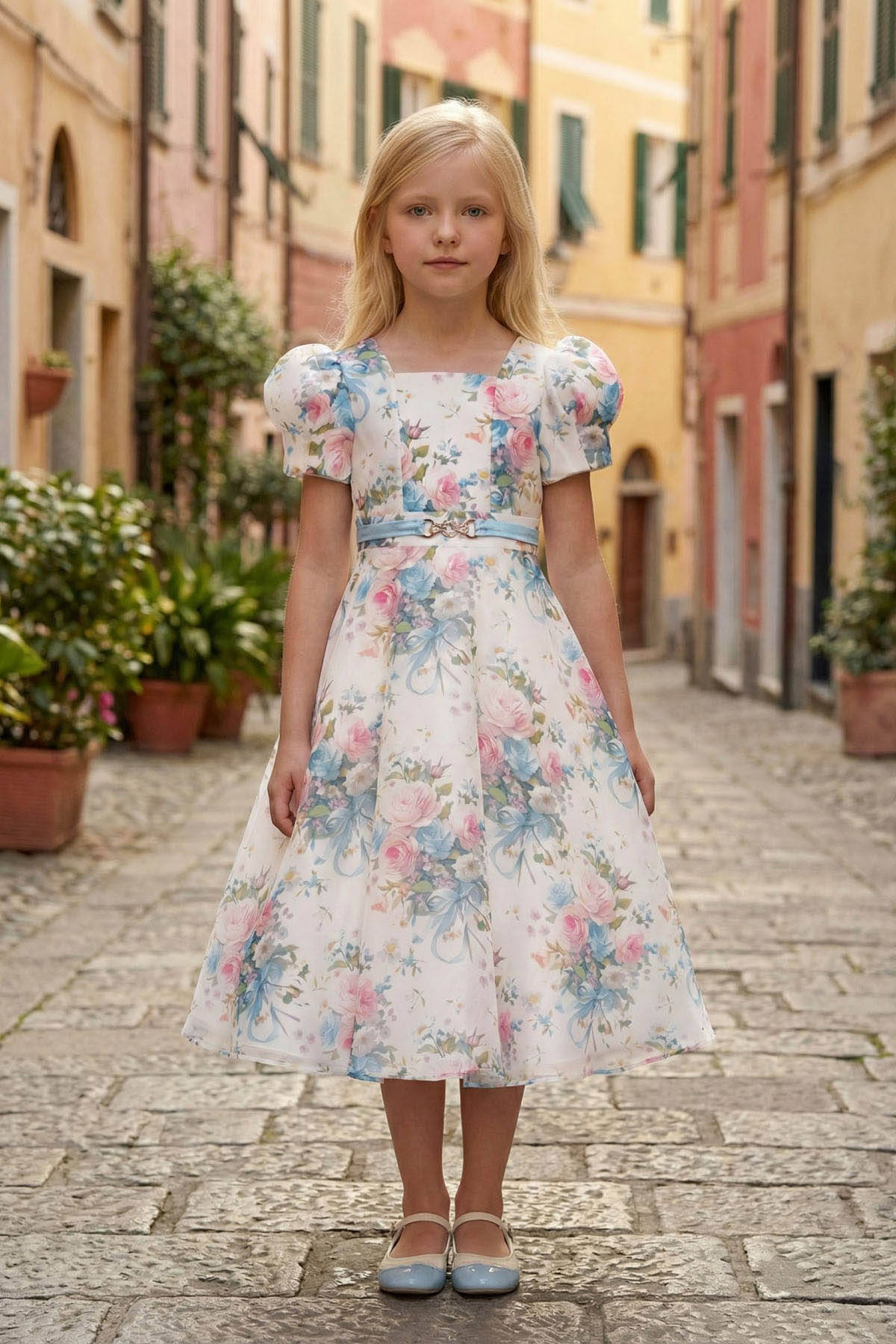Dreamy florals meet timeless charm in this elegant mid-length dress—perfect for girls who love to dress up in style. Crafted from lightweight organza, the dress features a soft floral print in romantic pastel tones, puffed short sleeves, and a square neckline that adds a graceful vintage touch. A satin belt with a rhinestone buckle cinches the waist, while the lace-up back ensures a flattering, adjustable fit. Ideal for weddings, birthdays, or any special celebration where beauty blooms.