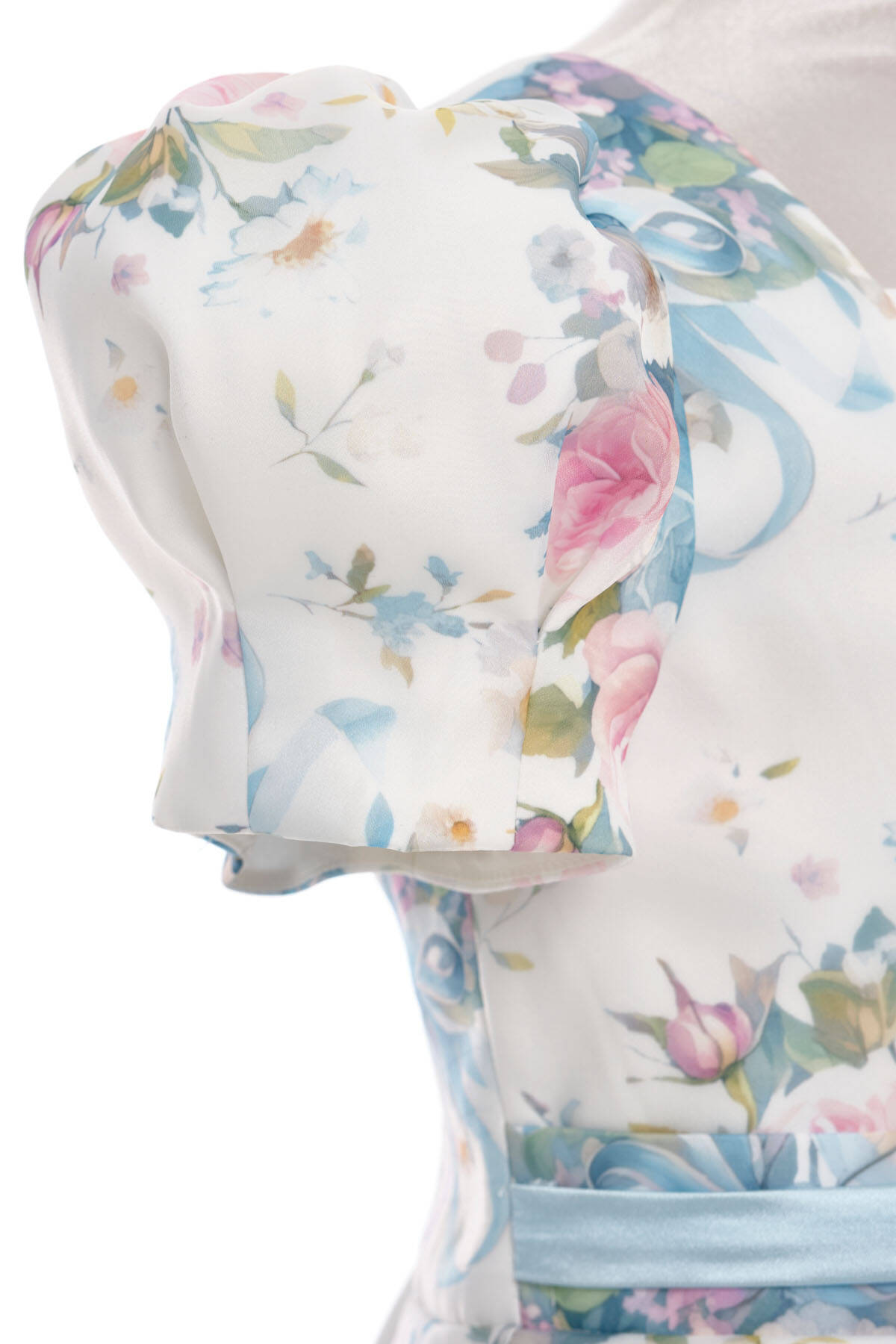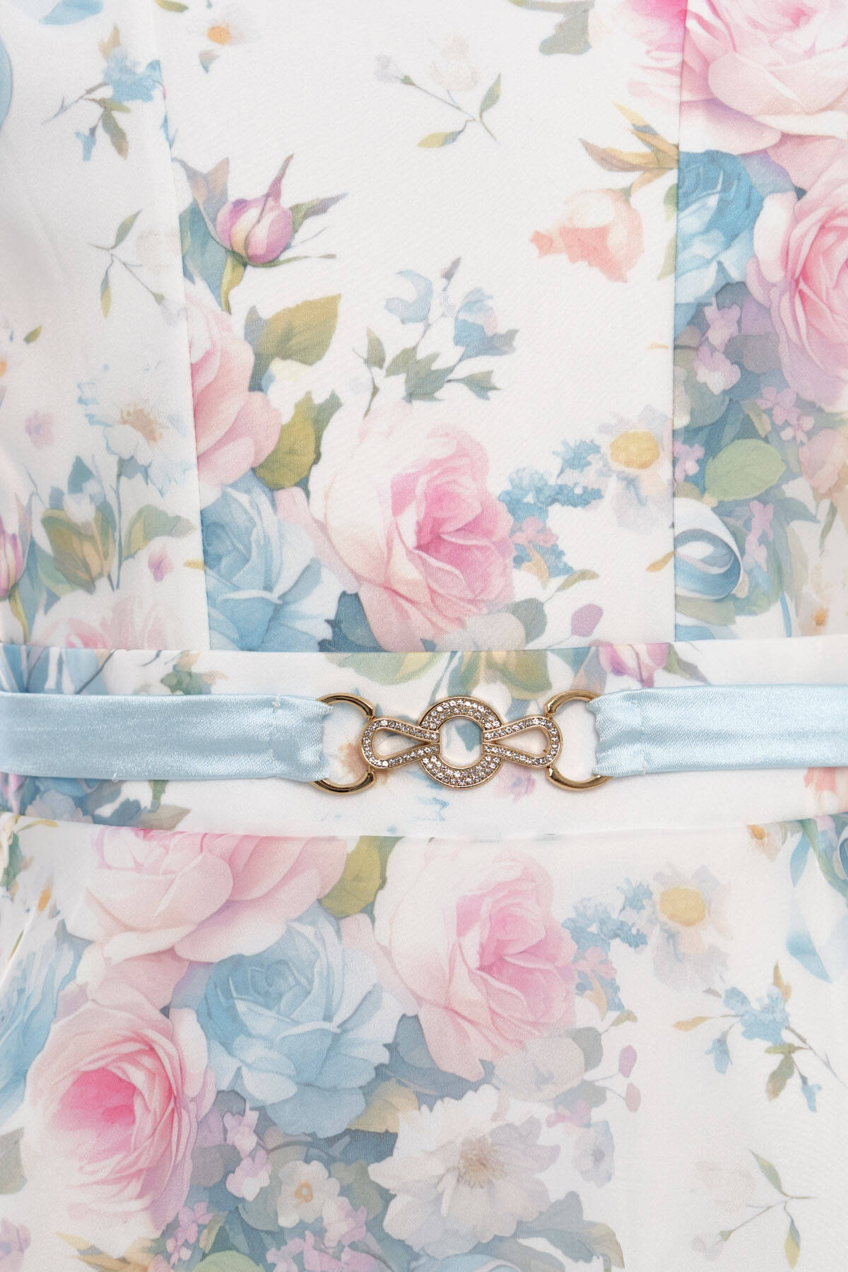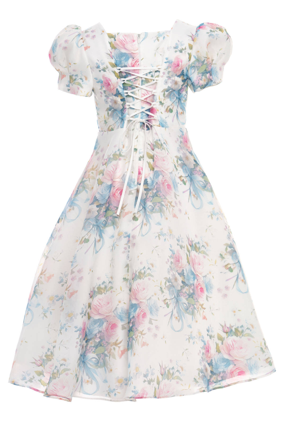 Dreamy florals meet timeless charm in this elegant mid-length dress—perfect for girls who love to dress up in style. Crafted from lightweight organza, the dress features a soft floral print in romantic pastel tones, puffed short sleeves, and a square neckline that adds a graceful vintage touch. A satin belt with a rhinestone buckle cinches the waist, while the lace-up back ensures a flattering, adjustable fit. Ideal for weddings, birthdays, or any special celebration where beauty blooms.