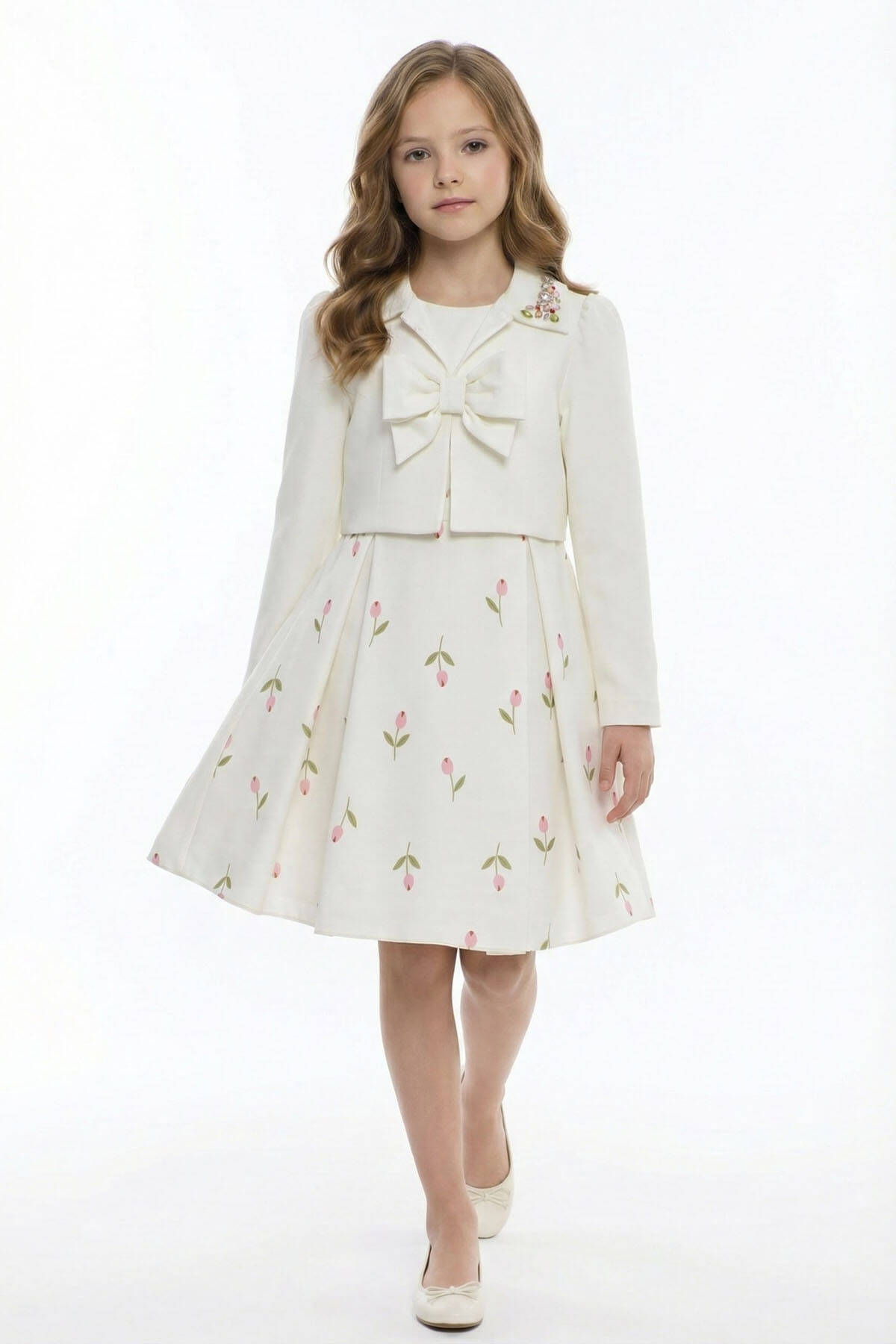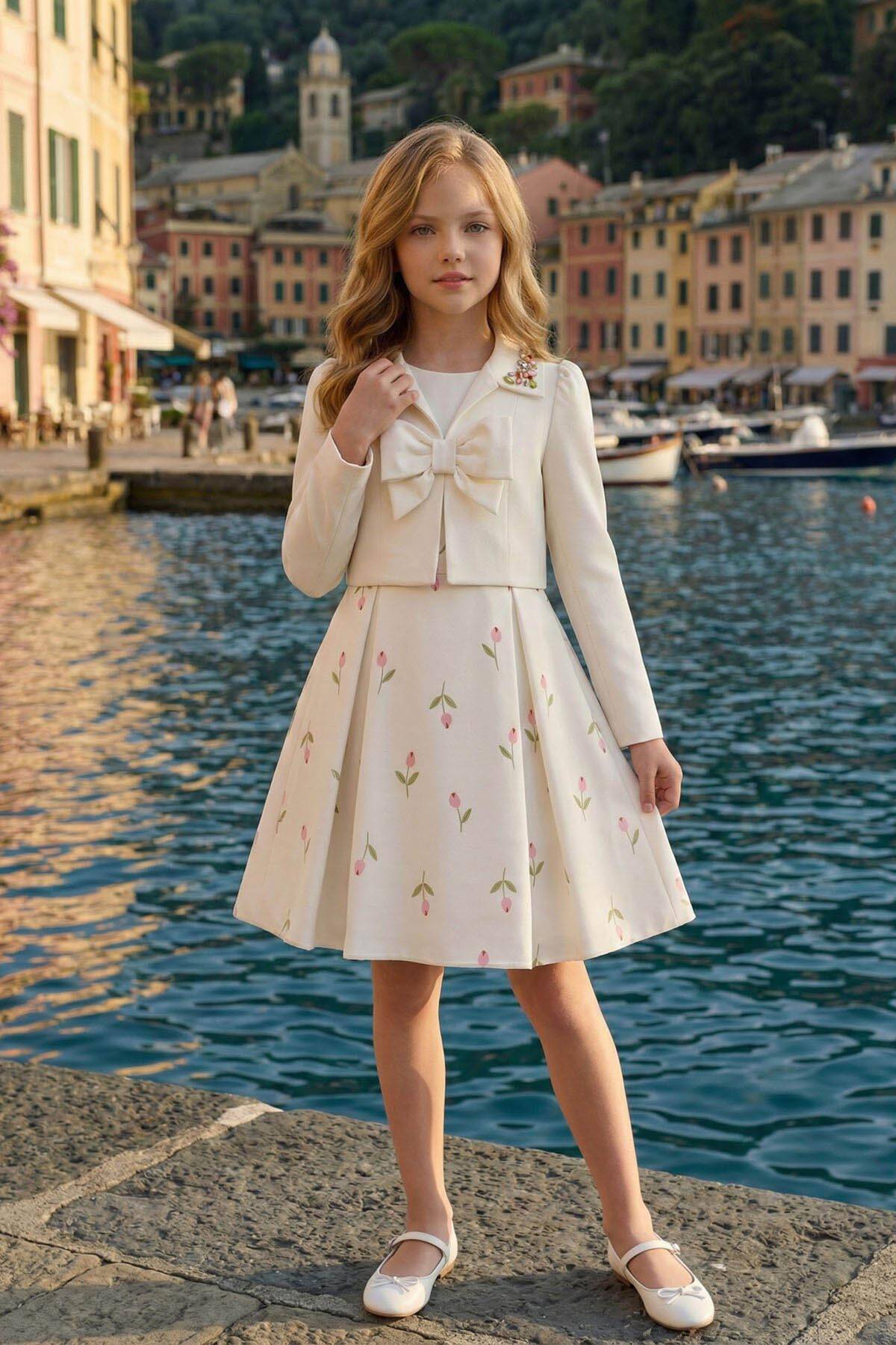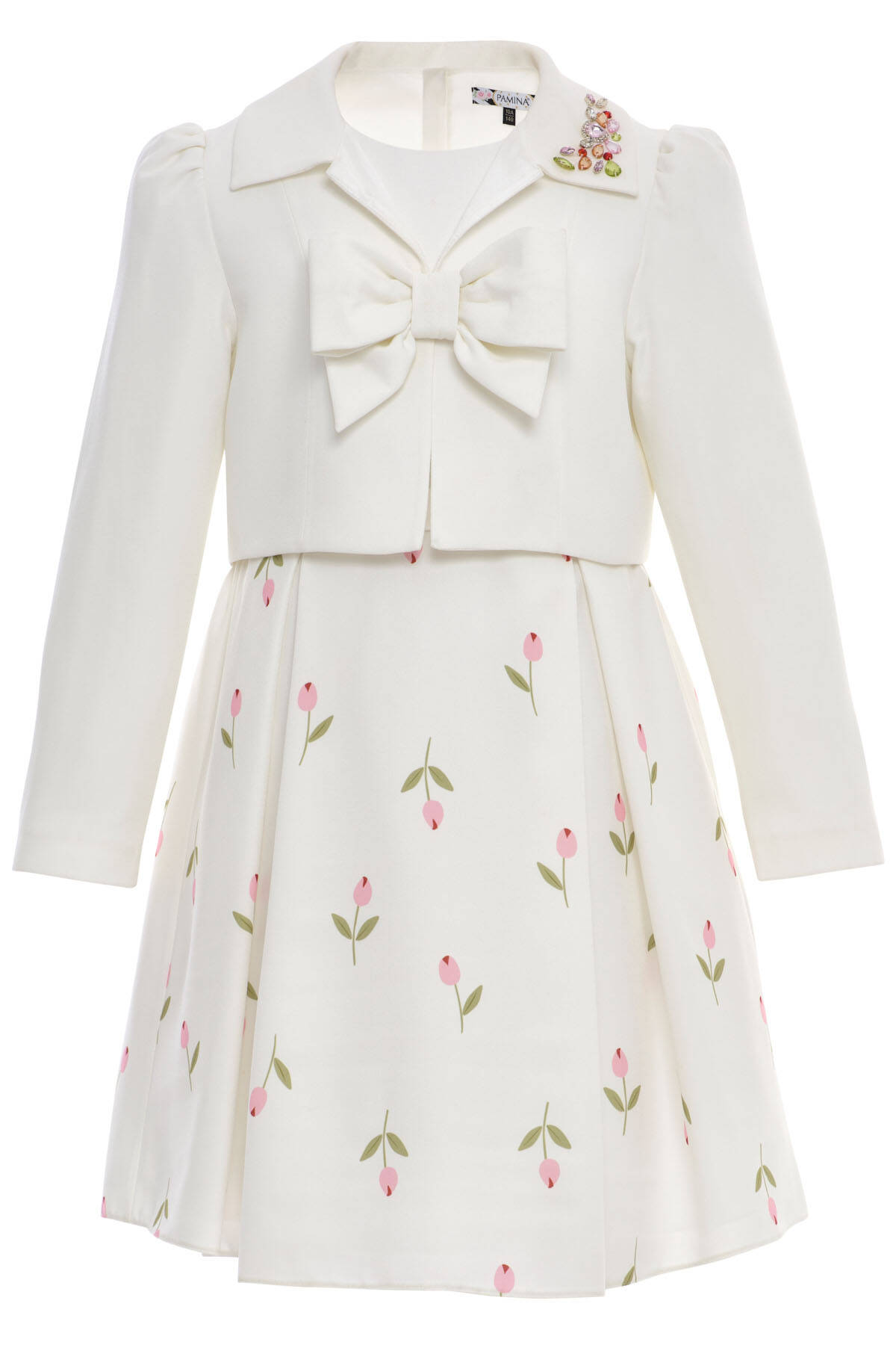 Delicate, dreamy, and delightfully elegant—this two-piece set is perfect for girls who love refined charm with a playful twist. The sleeveless A-line dress features a soft floral print with tulip motifs and a matching fabric belt for a gently fitted silhouette. The look is completed with a cropped long-sleeve jacket, finished with a statement front bow and sparkling gemstone appliqués on the collar.Ideal for spring events, birthdays, or family celebrations, this set brings together comfort and style with every thoughtful detail.