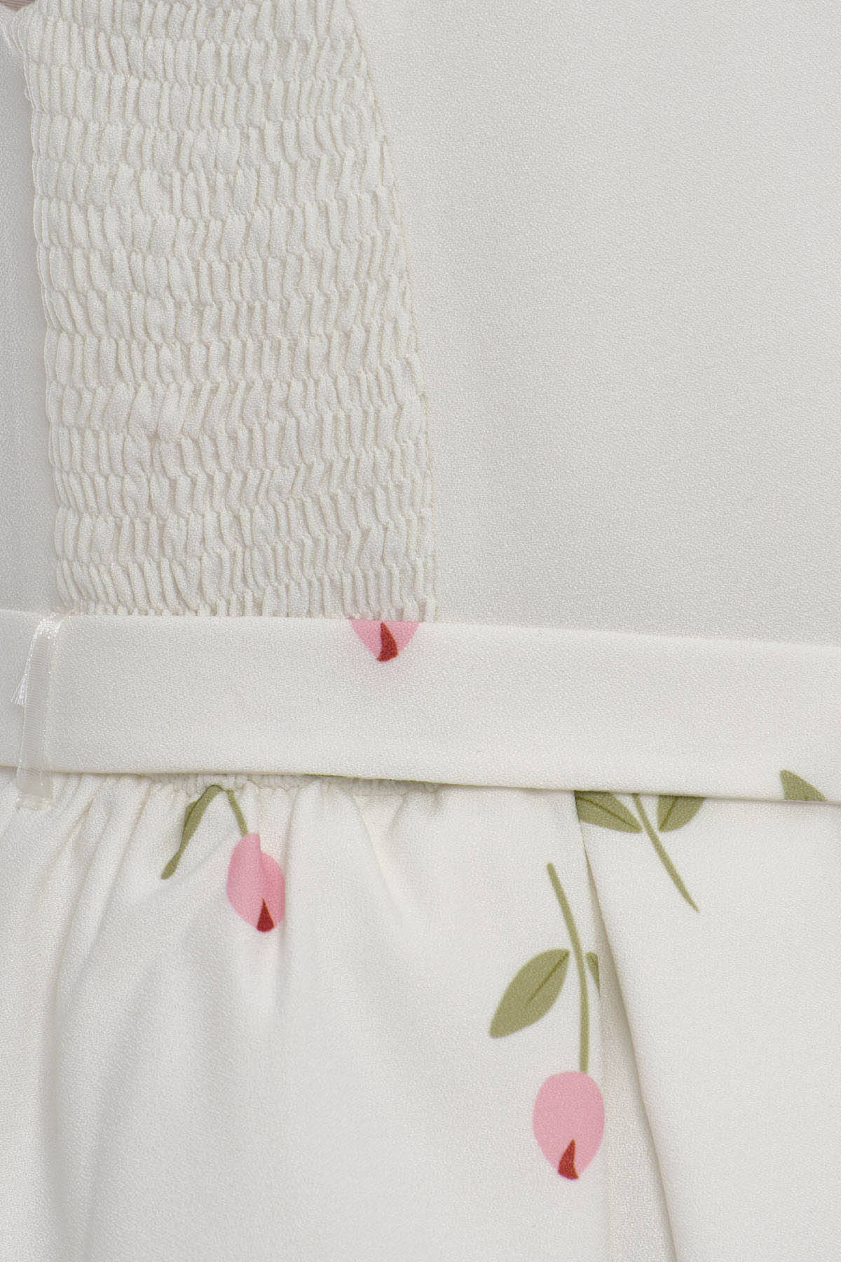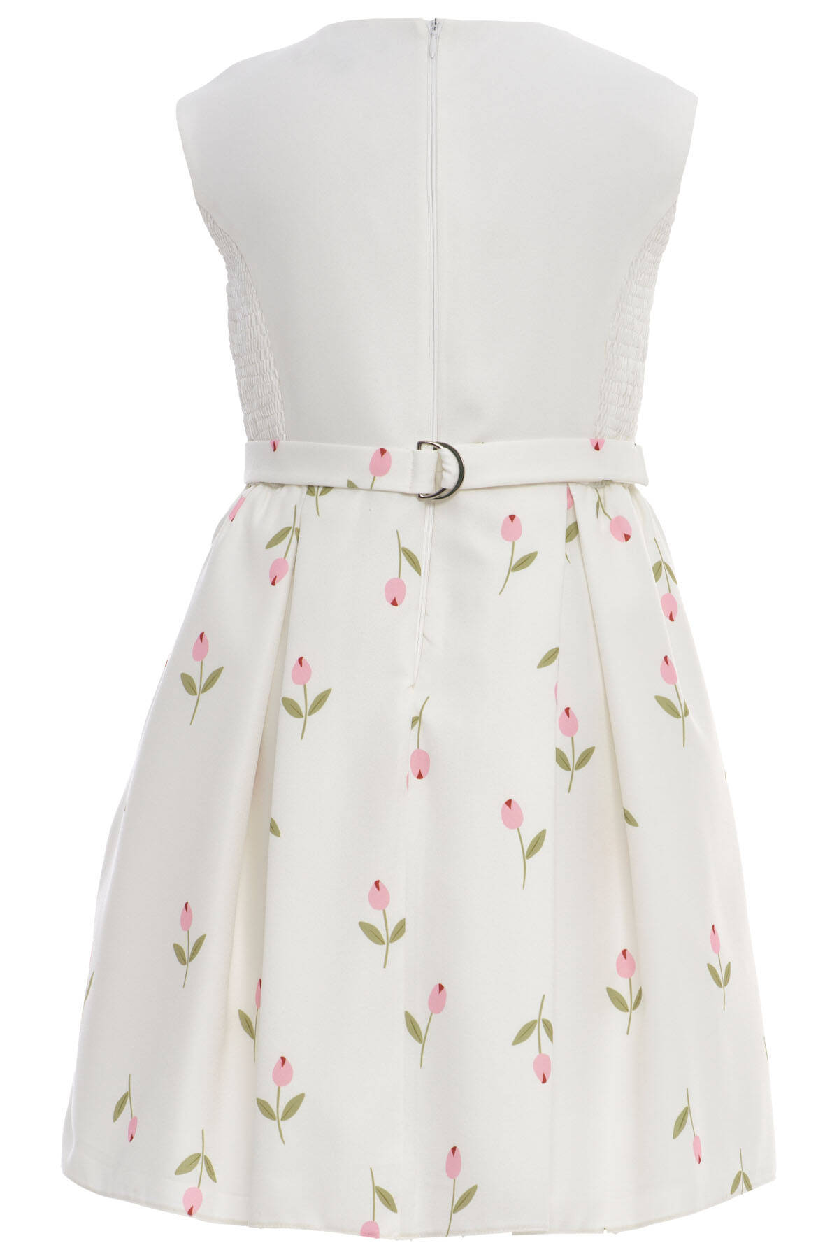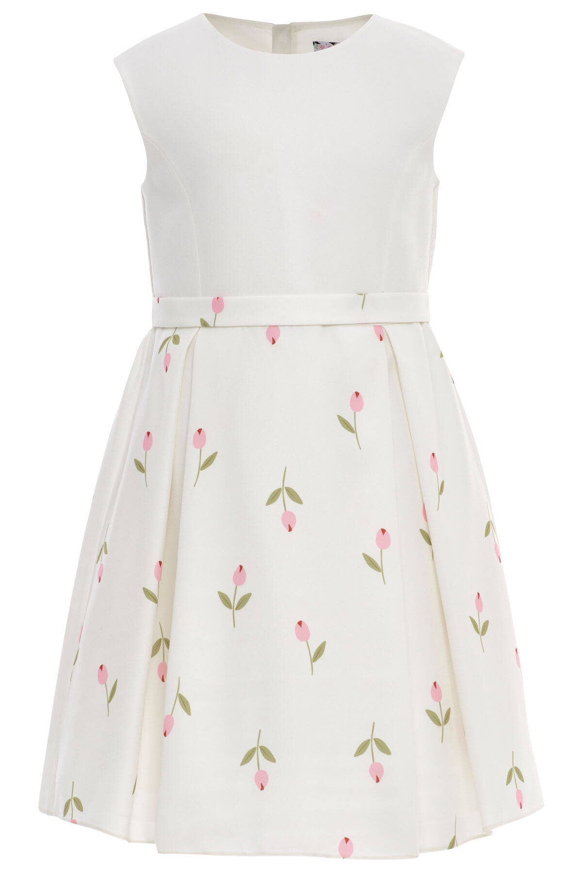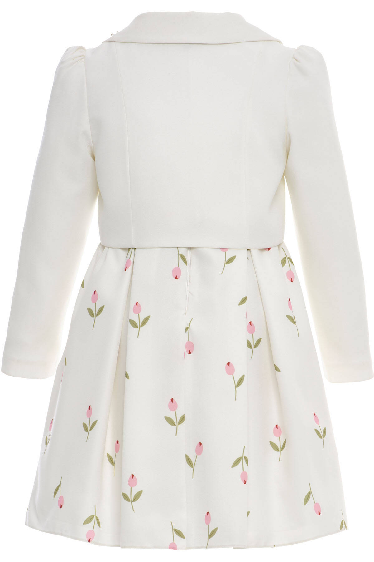 Delicate, dreamy, and delightfully elegant—this two-piece set is perfect for girls who love refined charm with a playful twist. The sleeveless A-line dress features a soft floral print with tulip motifs and a matching fabric belt for a gently fitted silhouette. The look is completed with a cropped long-sleeve jacket, finished with a statement front bow and sparkling gemstone appliqués on the collar.Ideal for spring events, birthdays, or family celebrations, this set brings together comfort and style with every thoughtful detail.