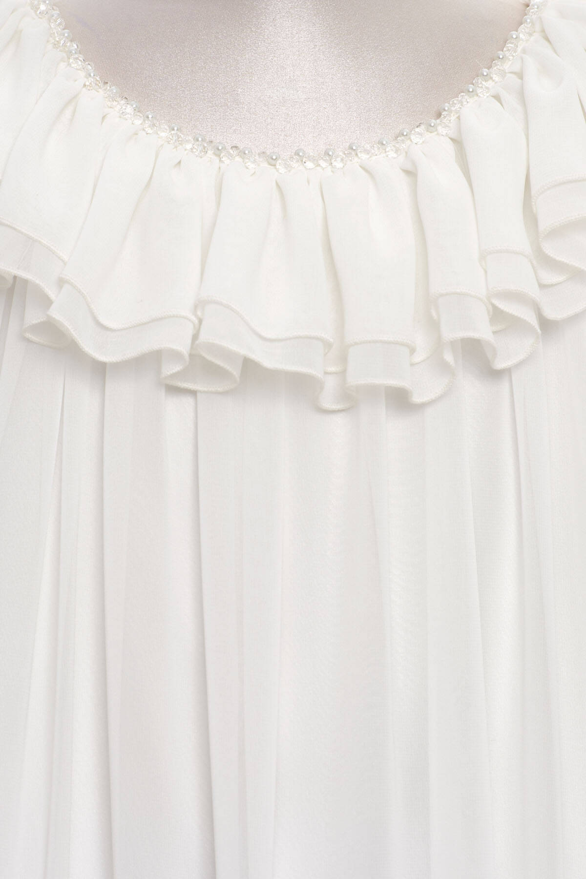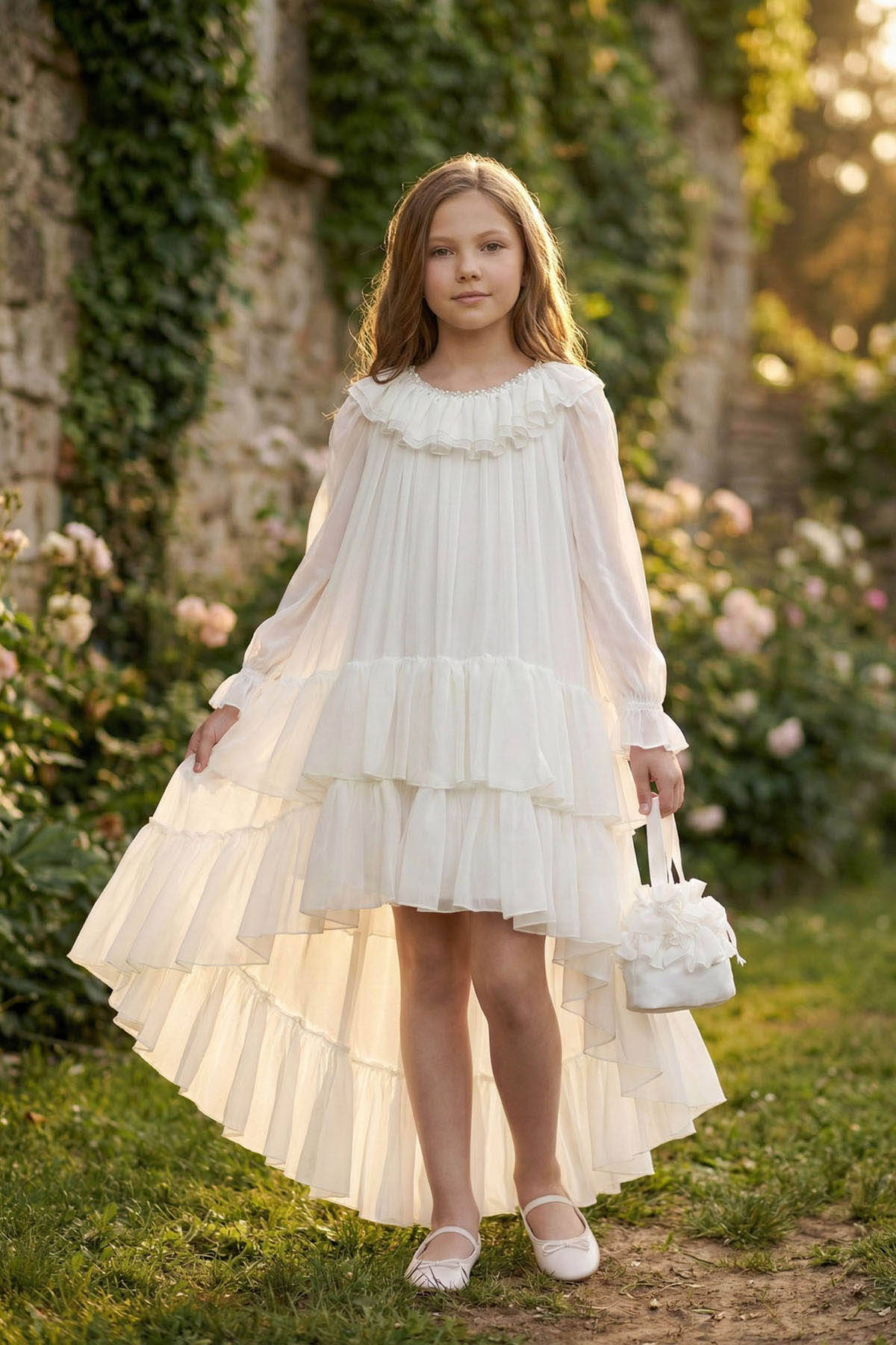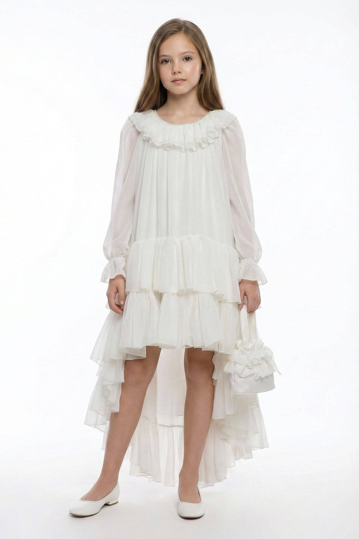 A fairytale-inspired ensemble that captures elegance in every flutter. This dreamy long-sleeve dress is made from soft chiffon and designed with cascading ruffle layers that create beautiful movement and volume. The off-shoulder neckline is gently ruffled and finished with delicate bead embellishments, adding a hint of sparkle to the romantic silhouette.To complete the look, the dress comes with a matching ruffled chiffon handbag. Perfect for little essentials and full of charm. A standout choice for birthdays, ceremonies, or any celebration that calls for a magical moment.