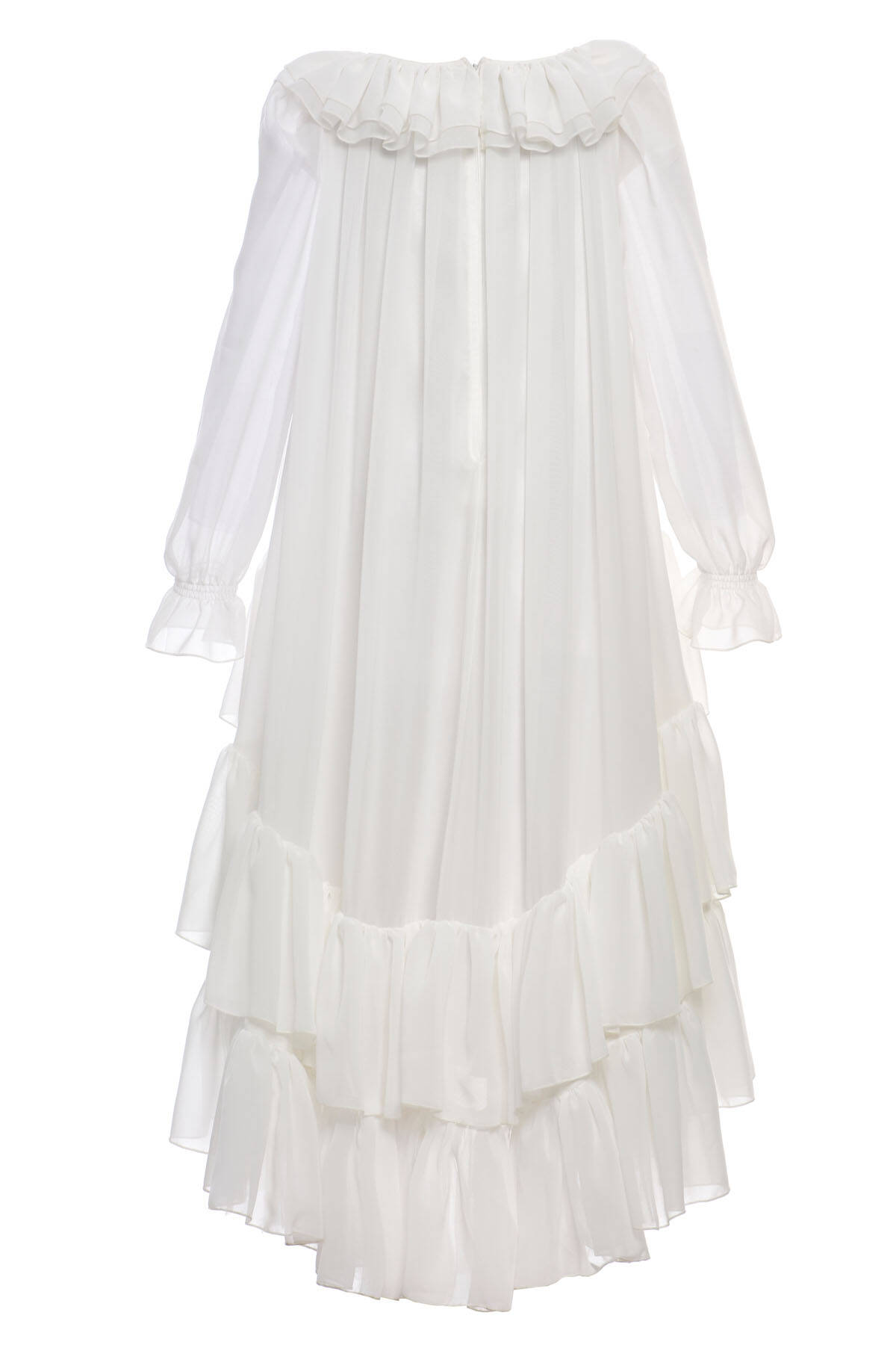 - Long-sleeve layered chiffon dress with high-low ruffle hem