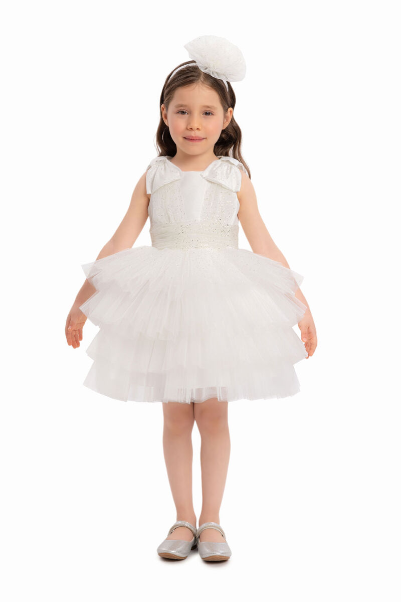 This dress, featuring elegant bow details on the shoulders, offers a distinctive style with ruched tulle at the waist and chest. The skirts come to life with layered ruffles and shimmering printed tulle. The hair accessory draws all attention with its large pom-pom tulle. Highlighting your child's style with its stunning design, it also provides utmost comfort with its 100% cotton lining. A stylish choice for a birthday dress, party dress, or any special occasion attire.