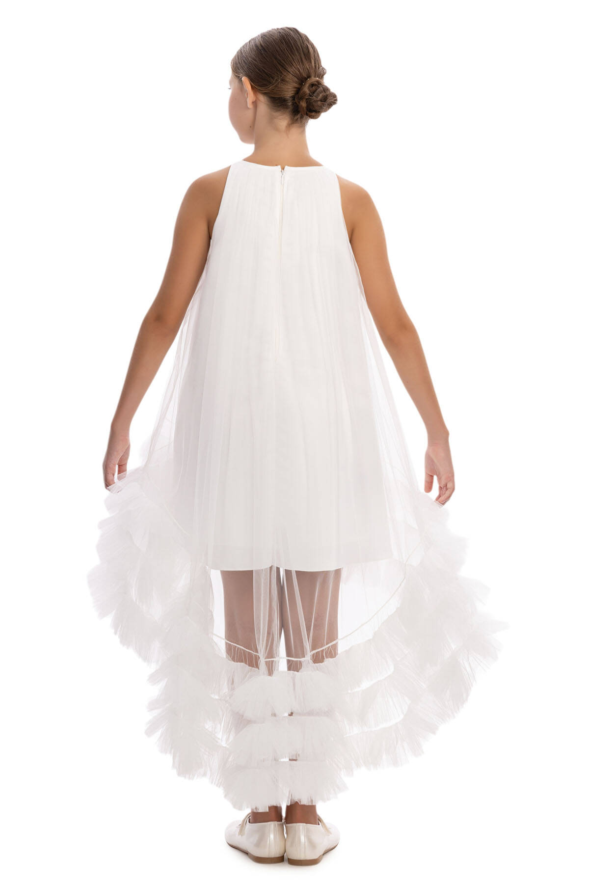 A dreamy statement piece designed for unforgettable occasions! This high-low dress features cascading layers of soft tulle ruffles that flow beautifully with every step. The sheer overlay creates a graceful cape-like effect, adding volume and elegance.The neckline is delicately adorned with pearls and floral bead details, giving the dress a refined sparkle. Perfect for galas, weddings, or special celebrations, this design is made to make her feel like the star of the event.