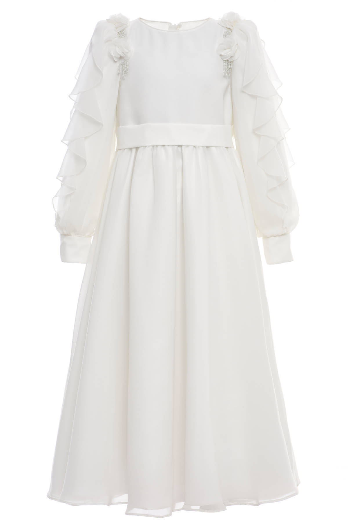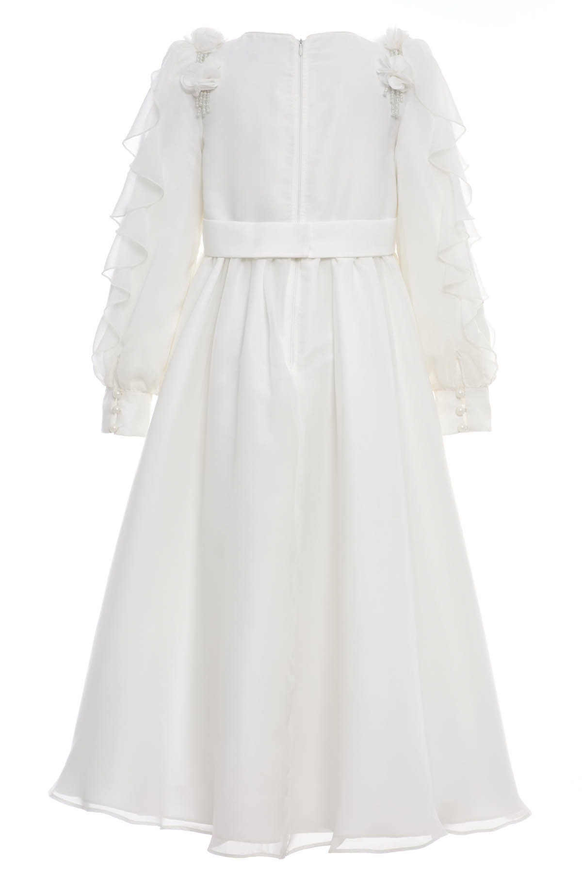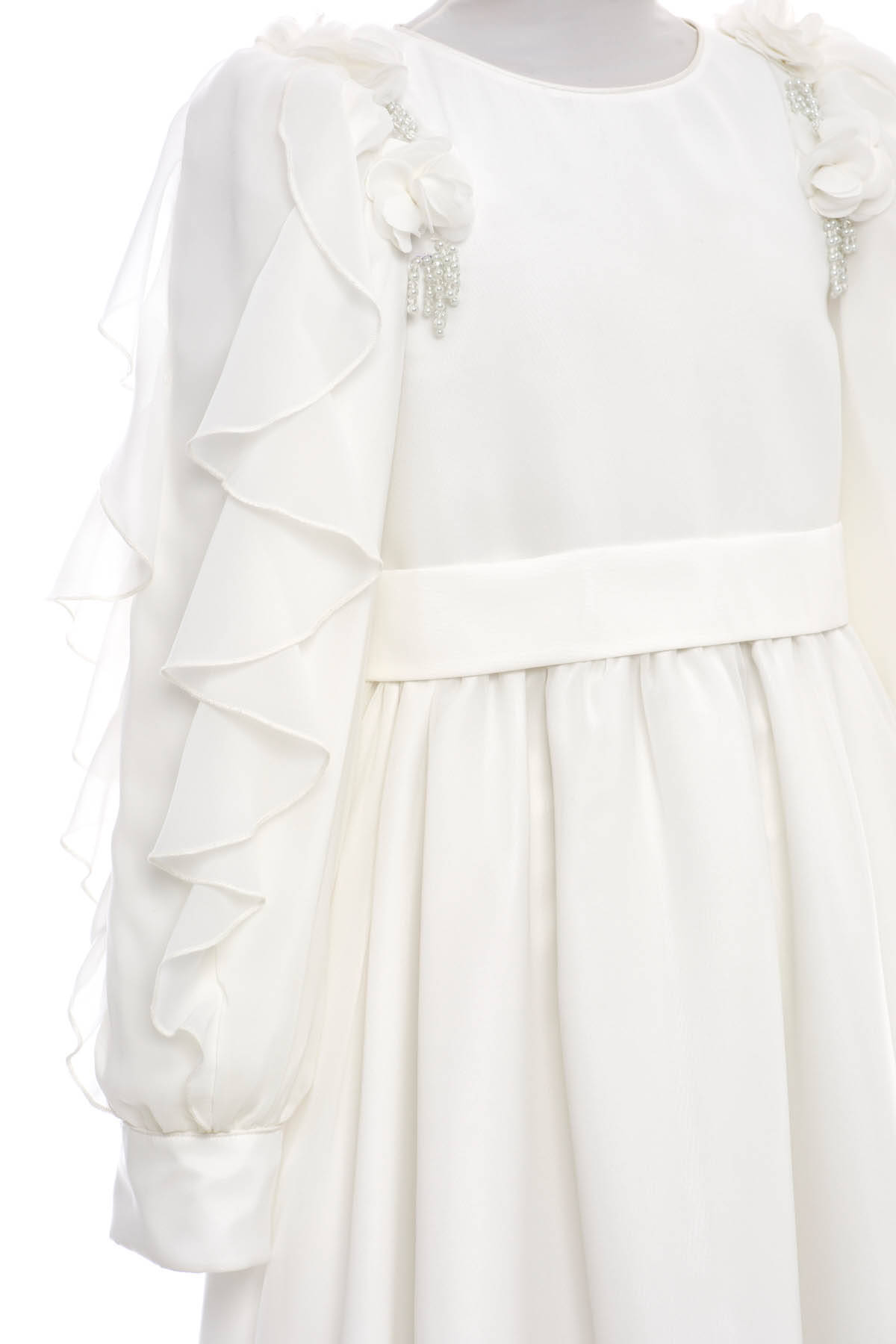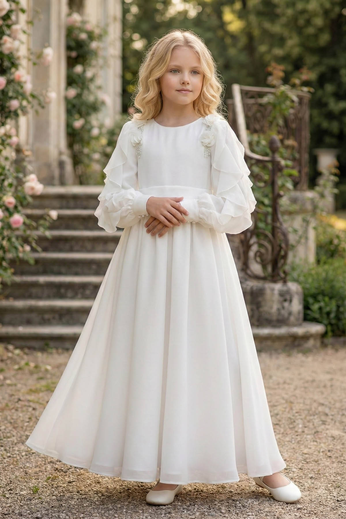 Soft, flowing, and beautifully detailed—this chiffon dress is designed to bring elegance and grace to any special occasion. The long A-line silhouette is elevated with layered ruffle sleeves and delicately gathered skirt panels, creating movement with every step. Charming 3D chiffon flowers sit gracefully on the shoulders, accented by cascading pearl bead strands for a refined, feminine finish. Perfect for weddings, ceremonies, or seasonal celebrations.