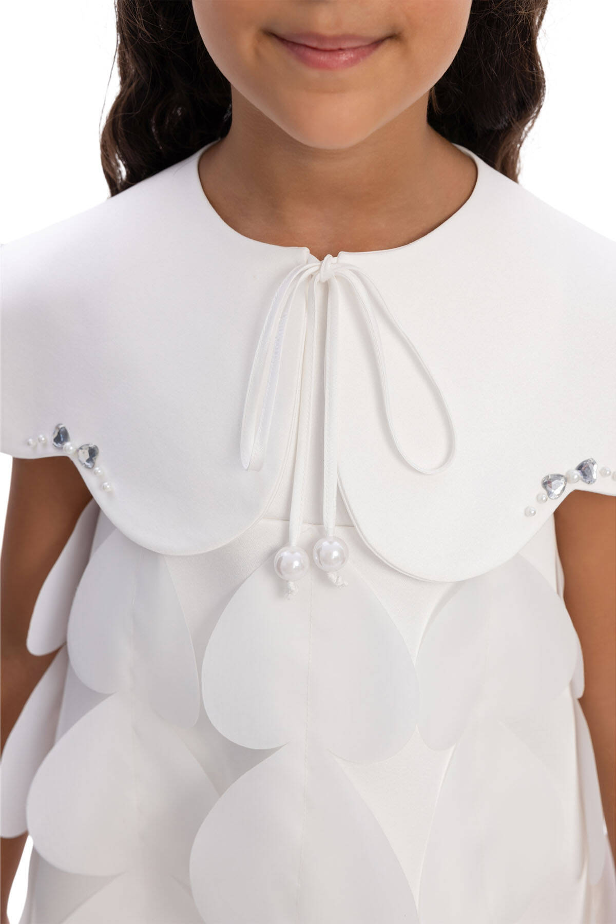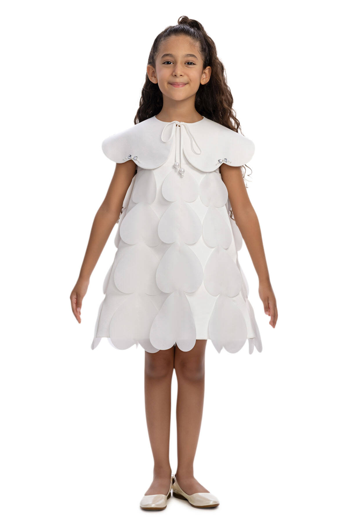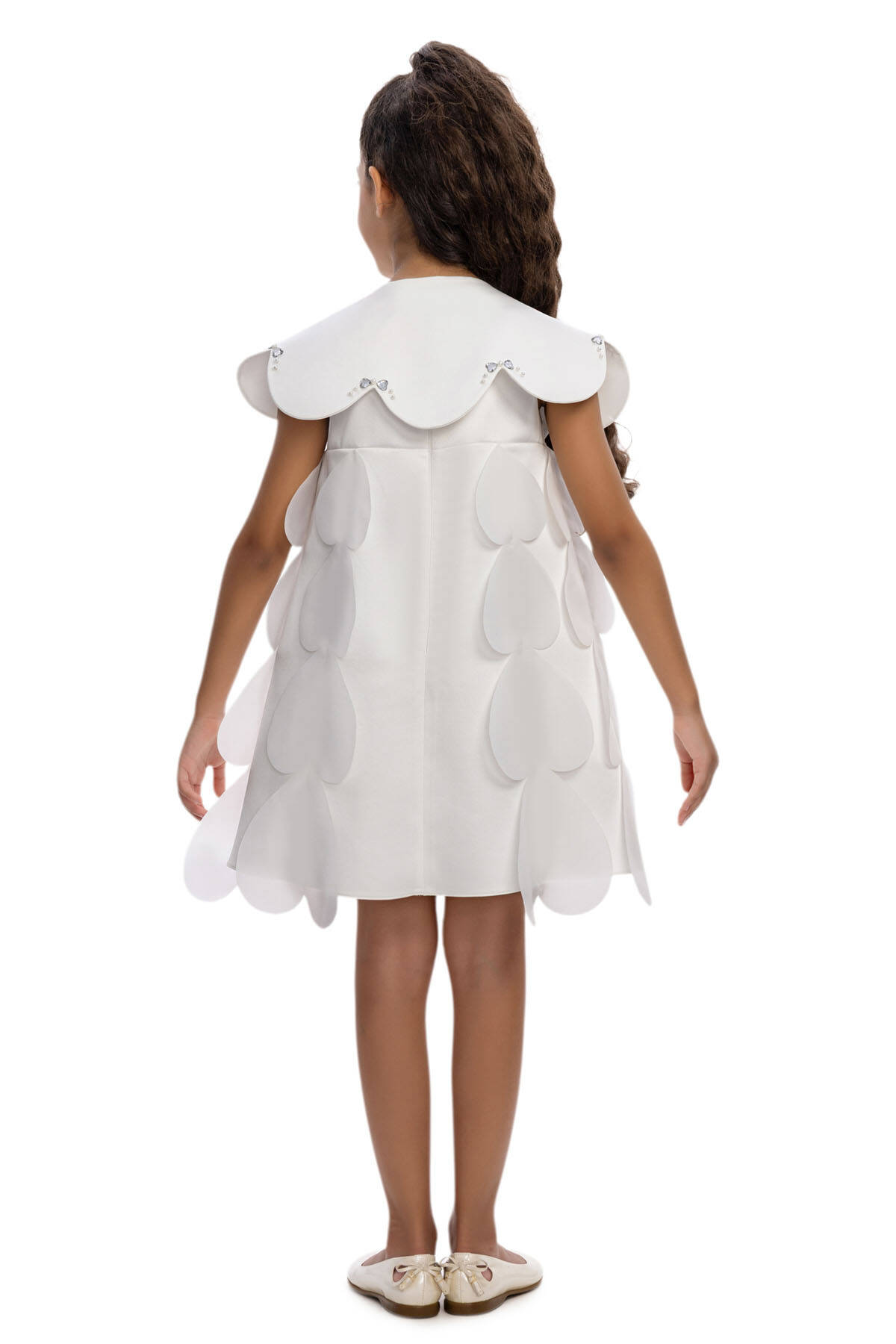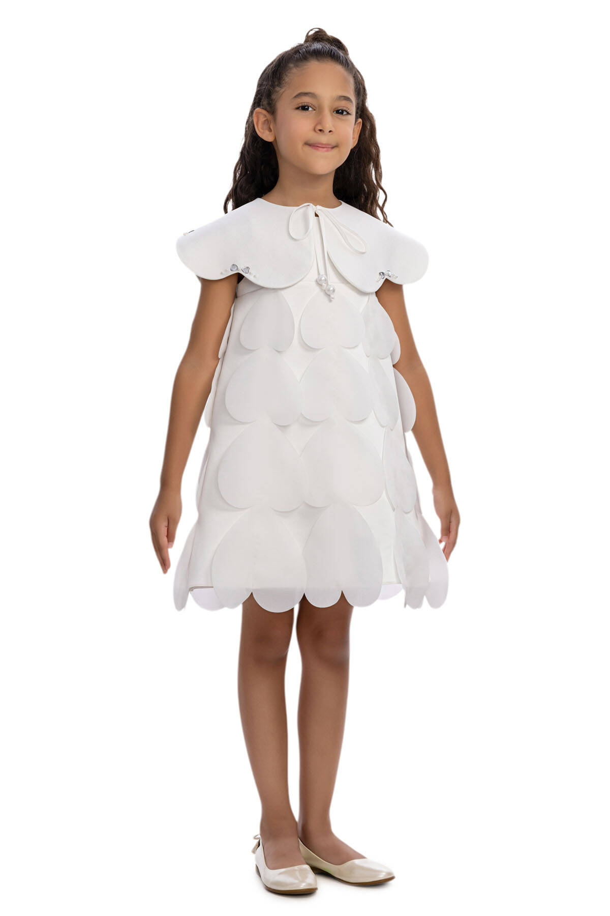 A modern and playful design that makes every little girl feel special! This dress is crafted with layered petal-shaped/ heart-shaped appliqués, creating a unique 3D texture and a stylish silhouette. The look is elevated with a removable oversized collar, detailed with pearls and rhinestones for a touch of sparkle. Worn with the collar, the dress has a chic and polished appearance; without it, it becomes a fun, minimal statement piece. Soft lining ensures comfort, making this dress perfect for birthdays, parties, and all special occasions where she deserves to shine.