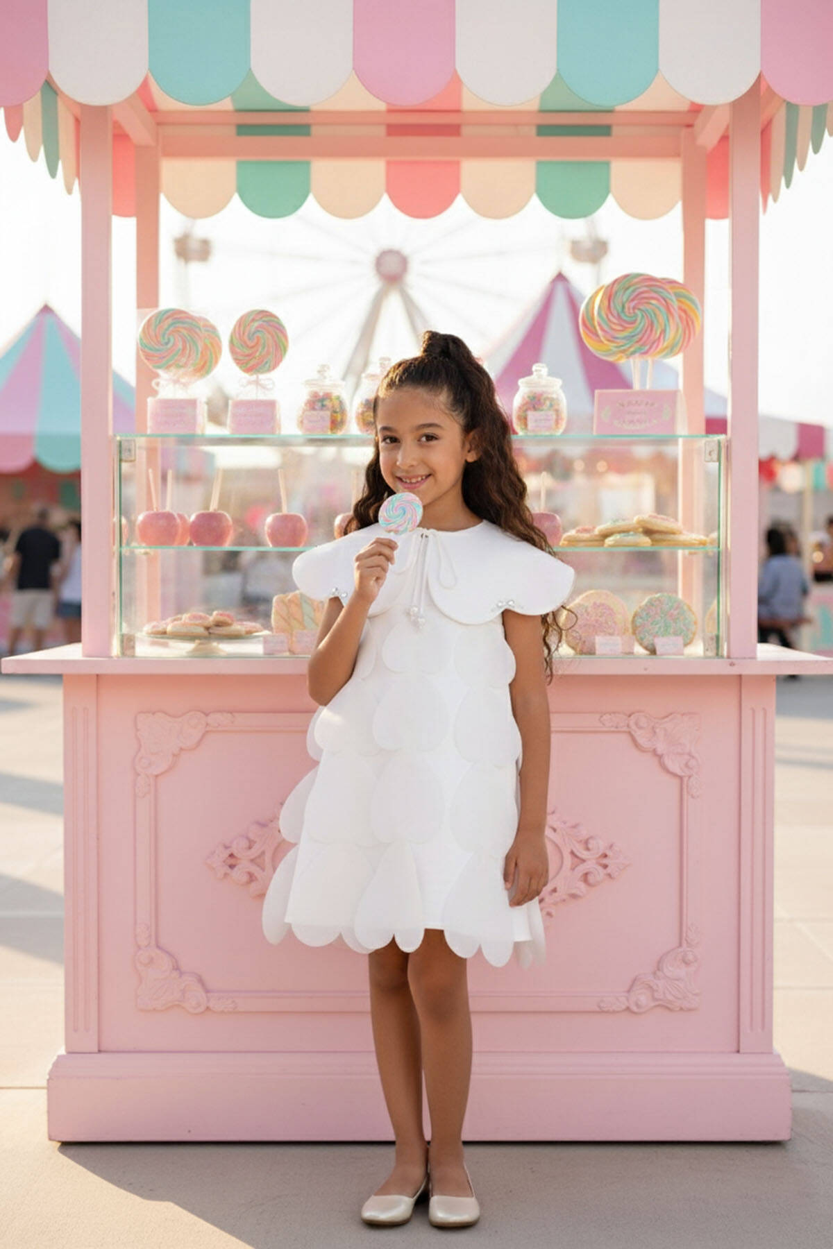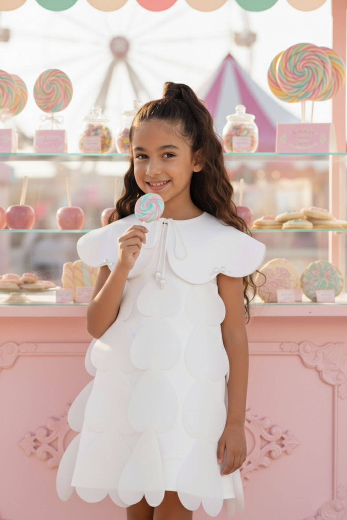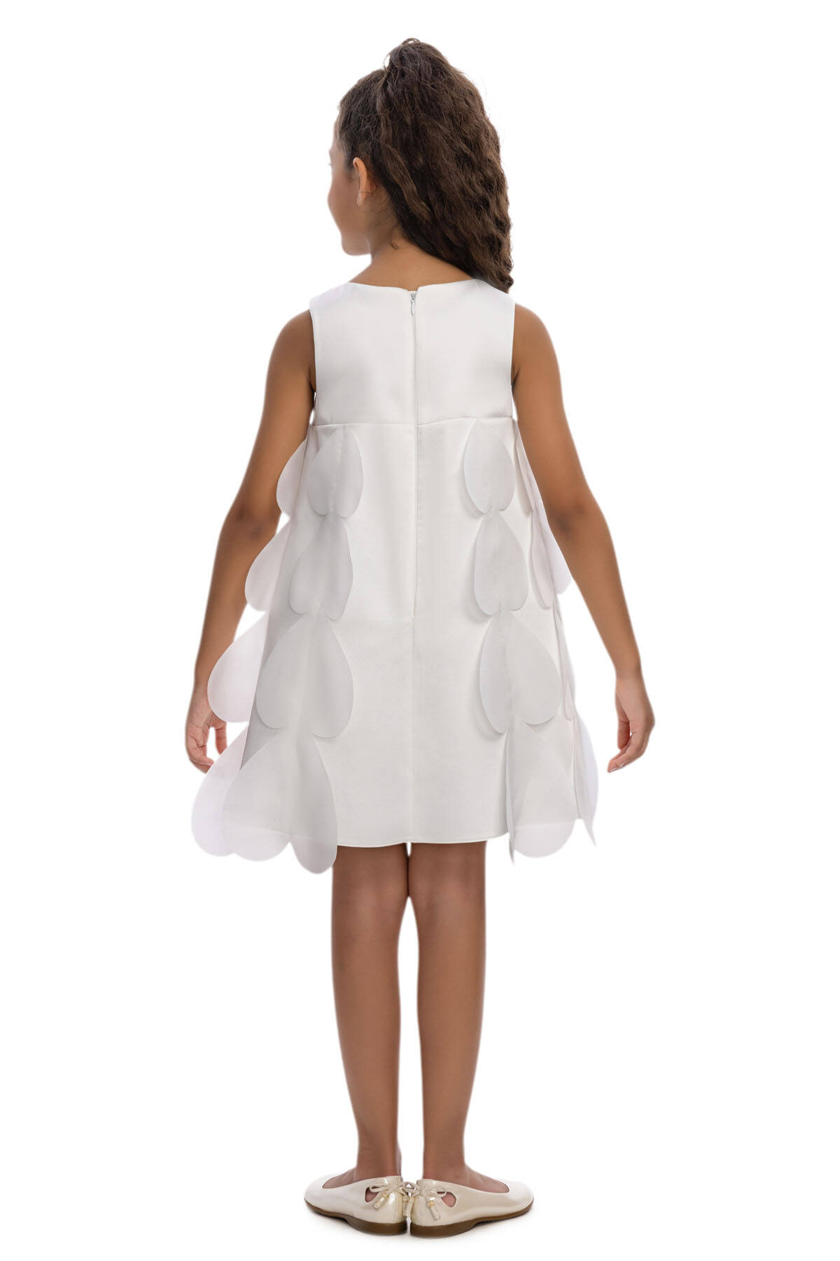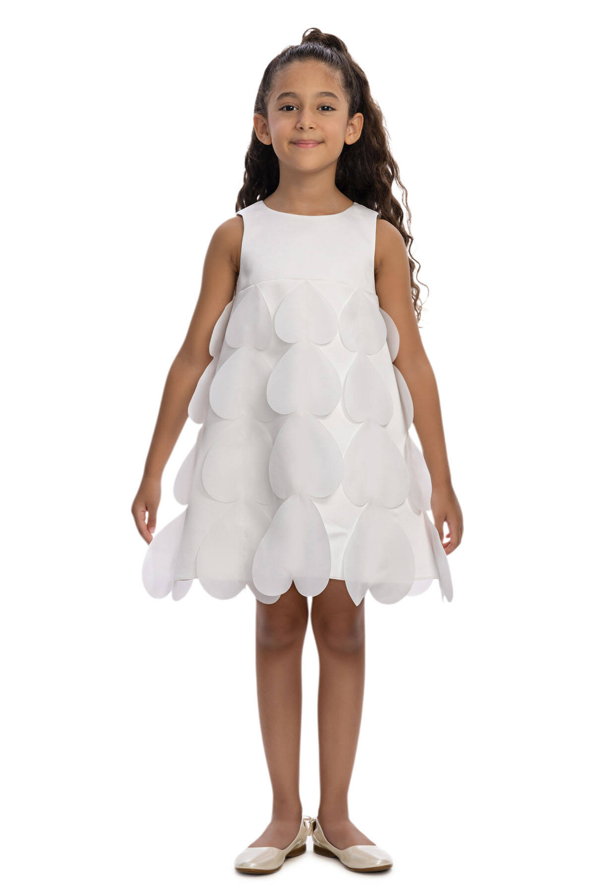 A modern and playful design that makes every little girl feel special! This dress is crafted with layered petal-shaped/ heart-shaped appliqués, creating a unique 3D texture and a stylish silhouette. The look is elevated with a removable oversized collar, detailed with pearls and rhinestones for a touch of sparkle. Worn with the collar, the dress has a chic and polished appearance; without it, it becomes a fun, minimal statement piece. Soft lining ensures comfort, making this dress perfect for birthdays, parties, and all special occasions where she deserves to shine.