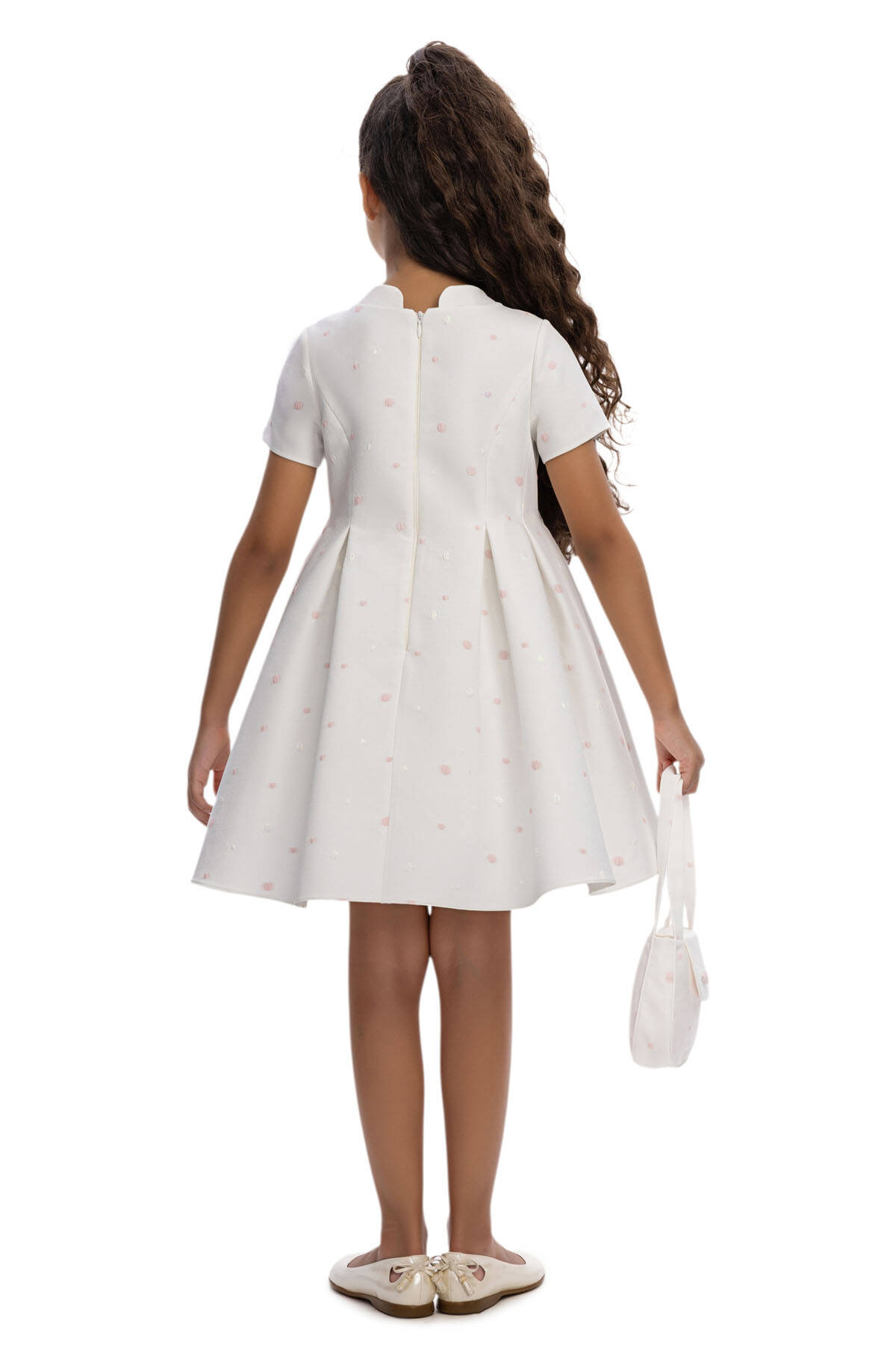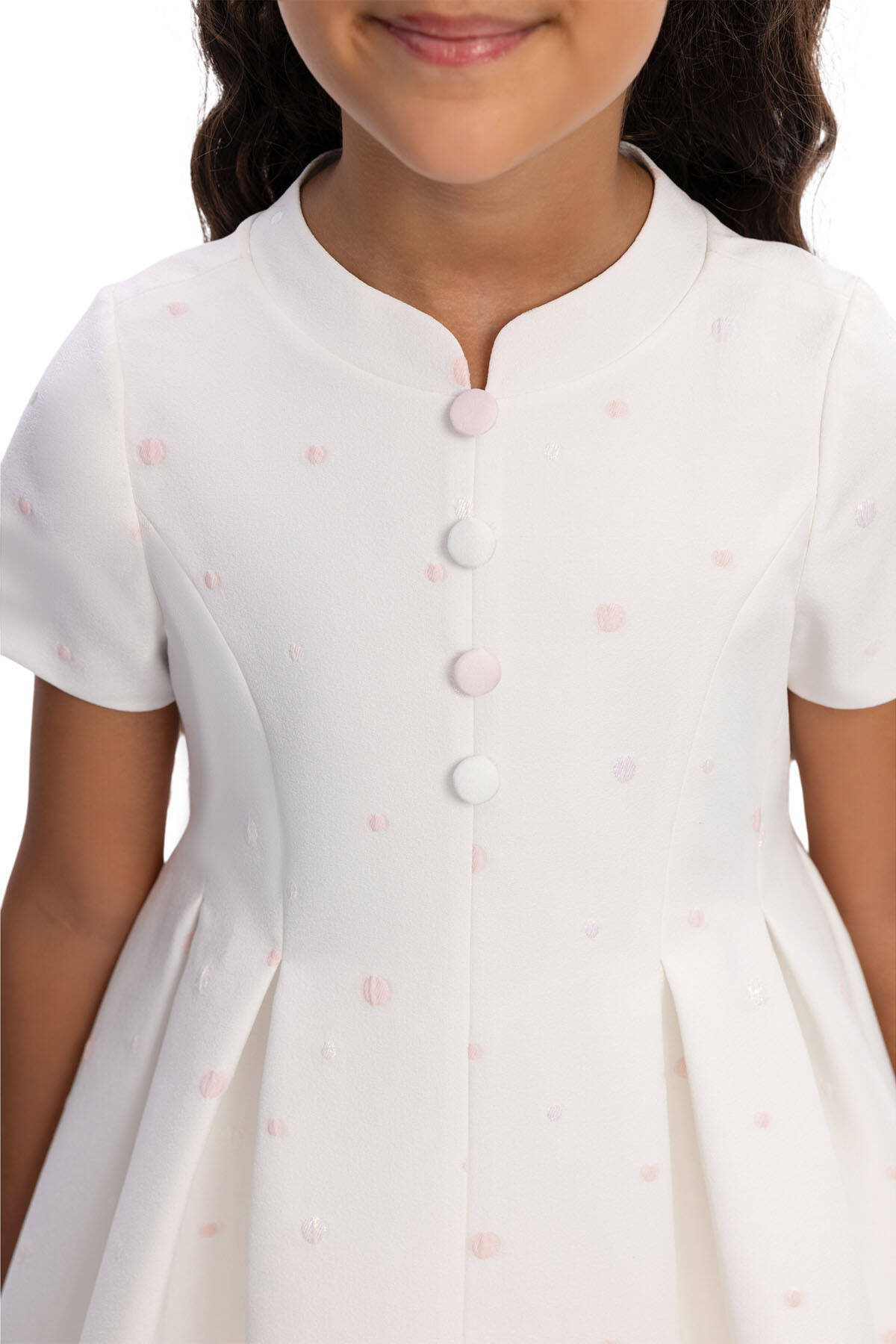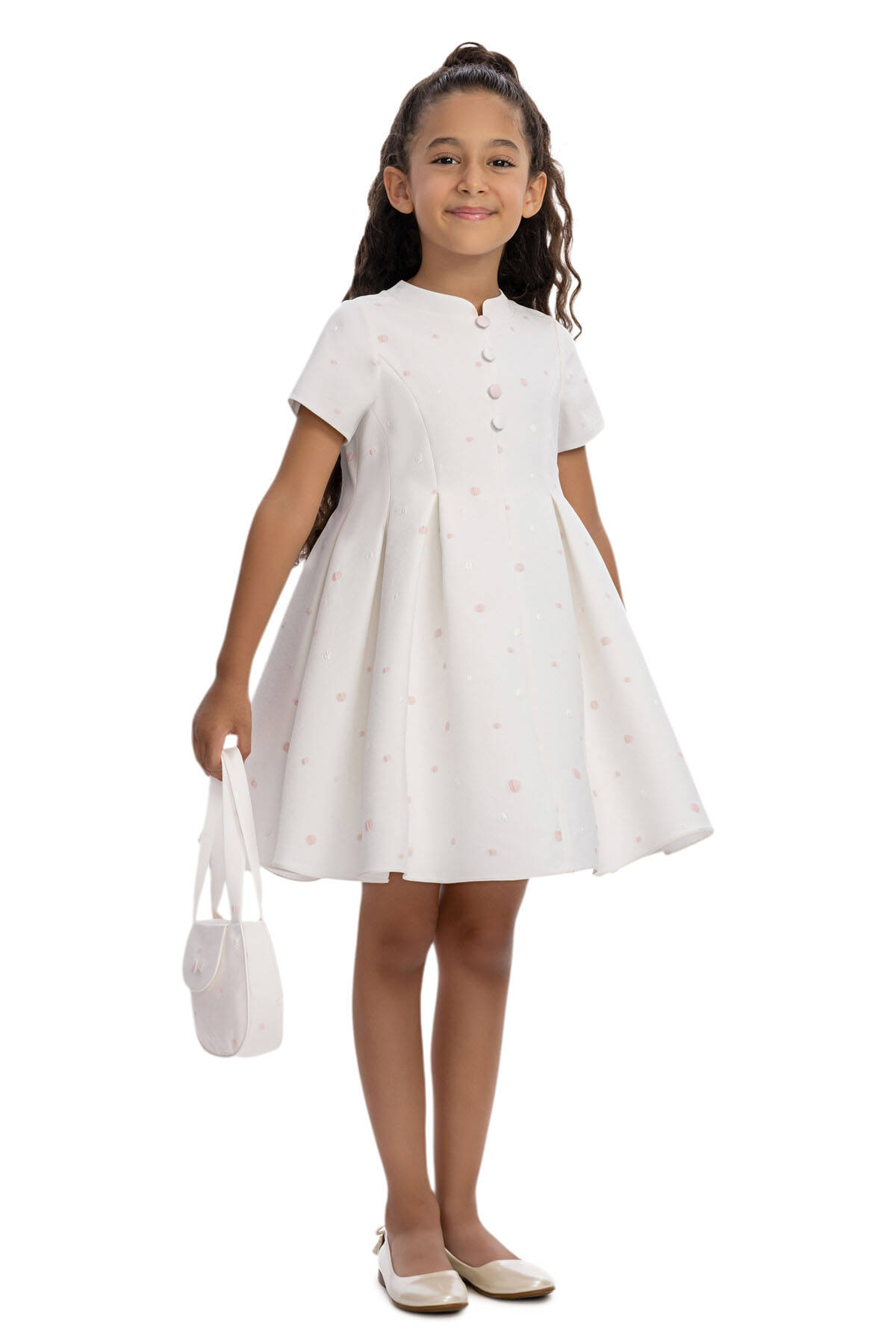 A sweet and timeless design, this dress is crafted in soft jacquard fabric with playful polka dots that shimmer subtly under the light. The fitted bodice with fabric-covered buttons at the front adds classic charm, while the pleated skirt creates volume for the perfect twirl. To complete the look, the set includes a matching polka dot bag, making it both stylish and practical for little girls to carry their tiny essentials. Lined with breathable cotton, this dress ensures all-day comfort while keeping her looking chic at birthdays, parties, or any special celebration.