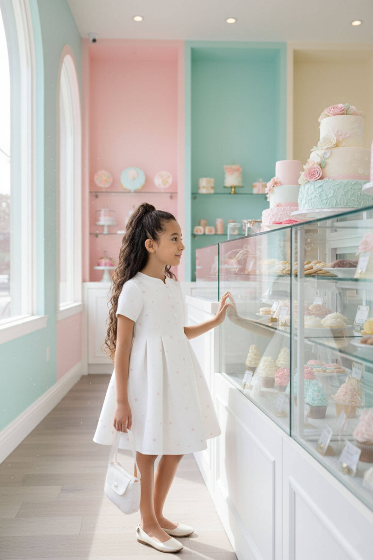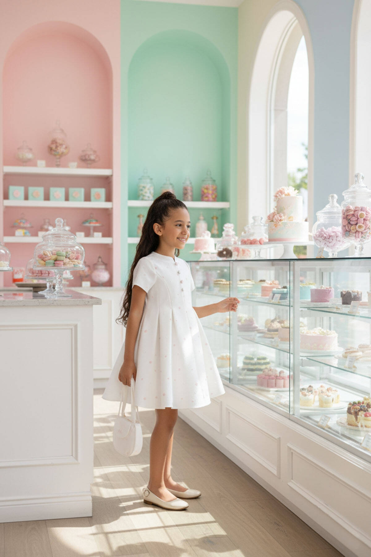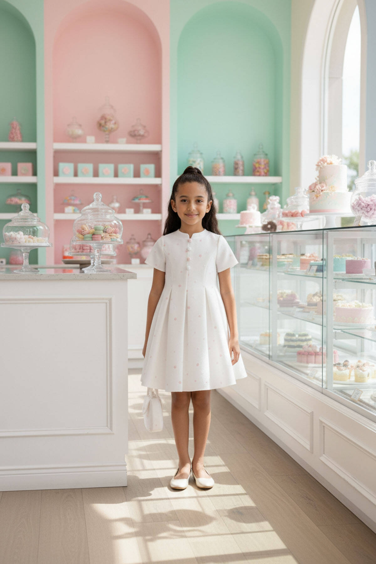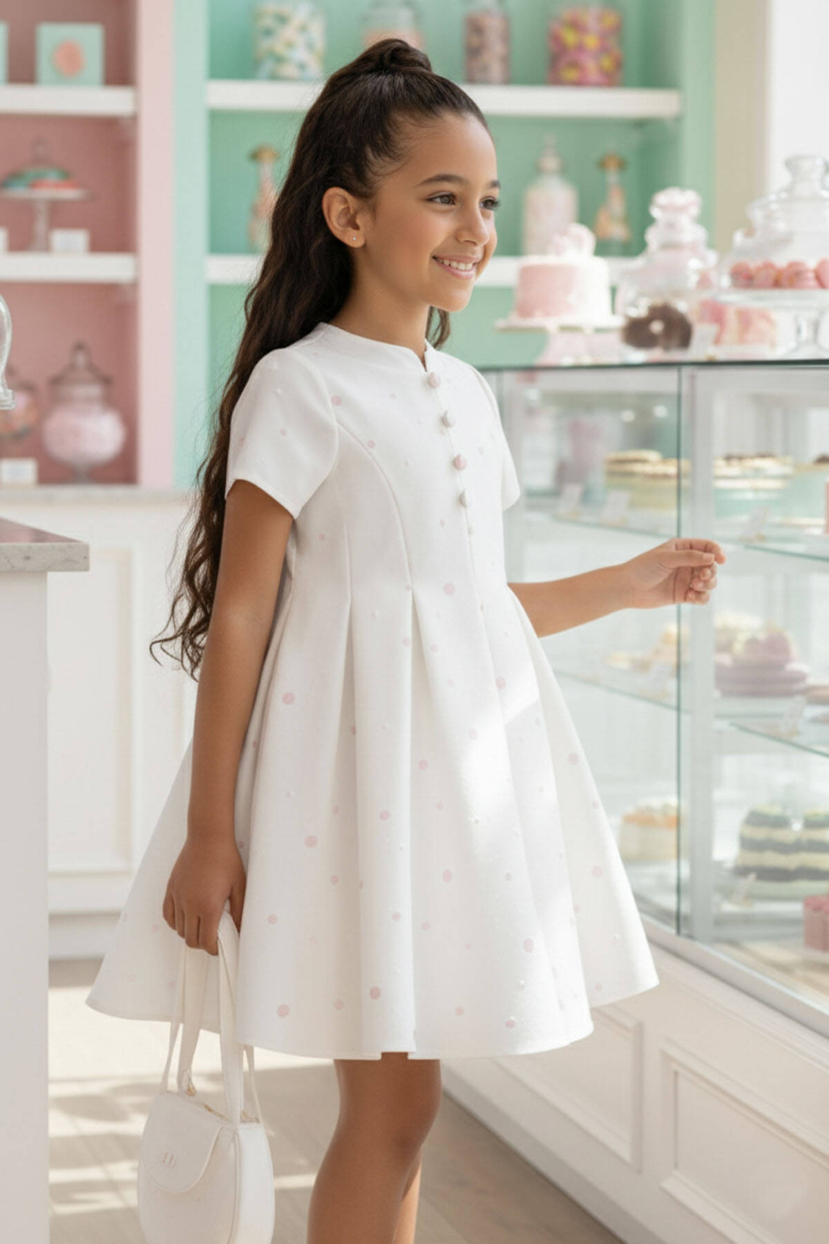 A sweet and timeless design, this dress is crafted in soft jacquard fabric with playful polka dots that shimmer subtly under the light. The fitted bodice with fabric-covered buttons at the front adds classic charm, while the pleated skirt creates volume for the perfect twirl. To complete the look, the set includes a matching polka dot bag, making it both stylish and practical for little girls to carry their tiny essentials. Lined with breathable cotton, this dress ensures all-day comfort while keeping her looking chic at birthdays, parties, or any special celebration.