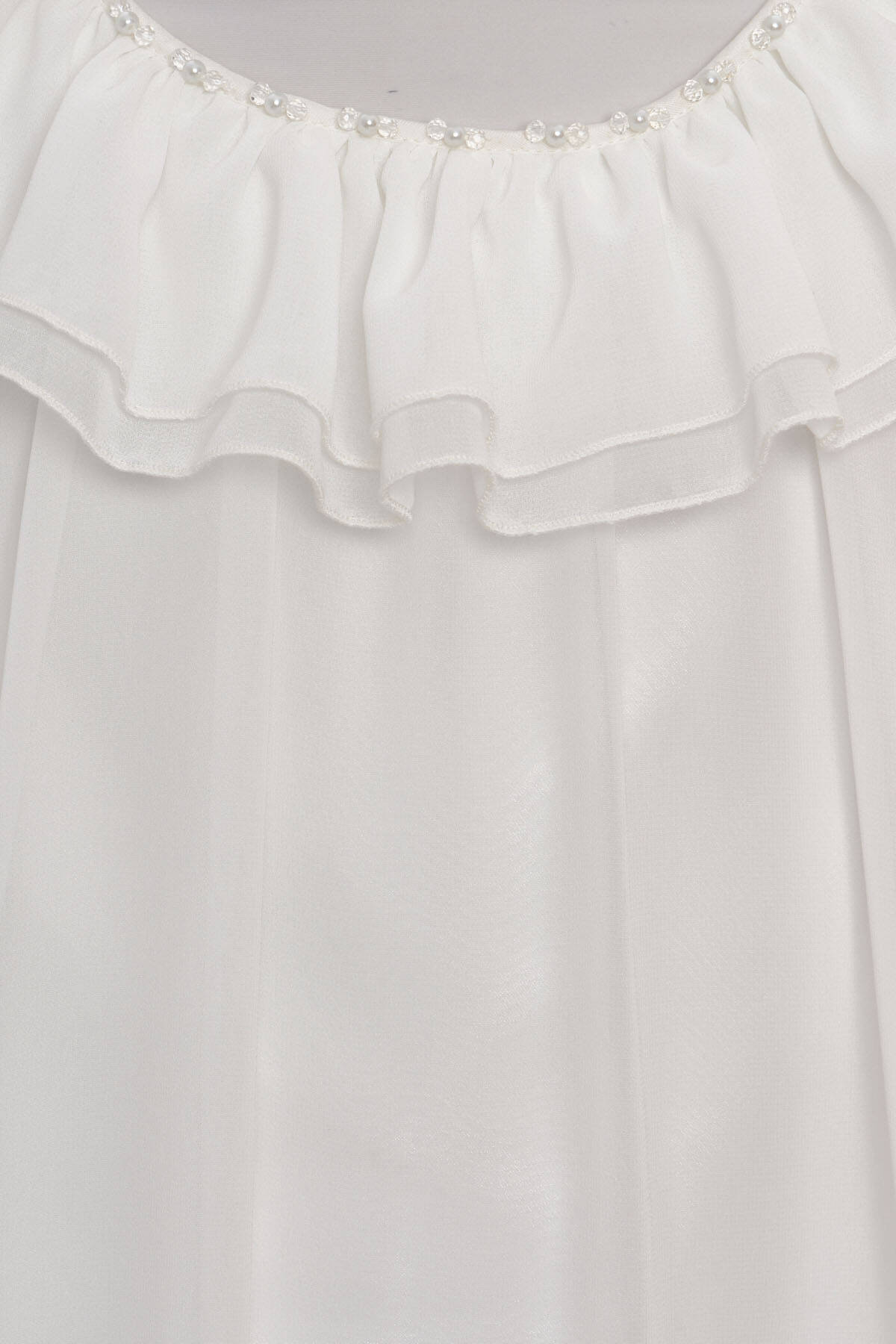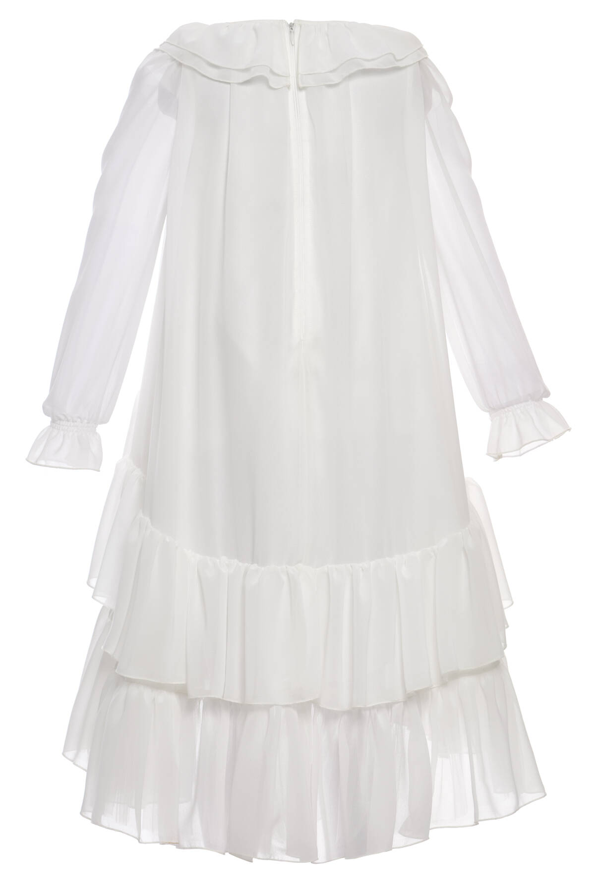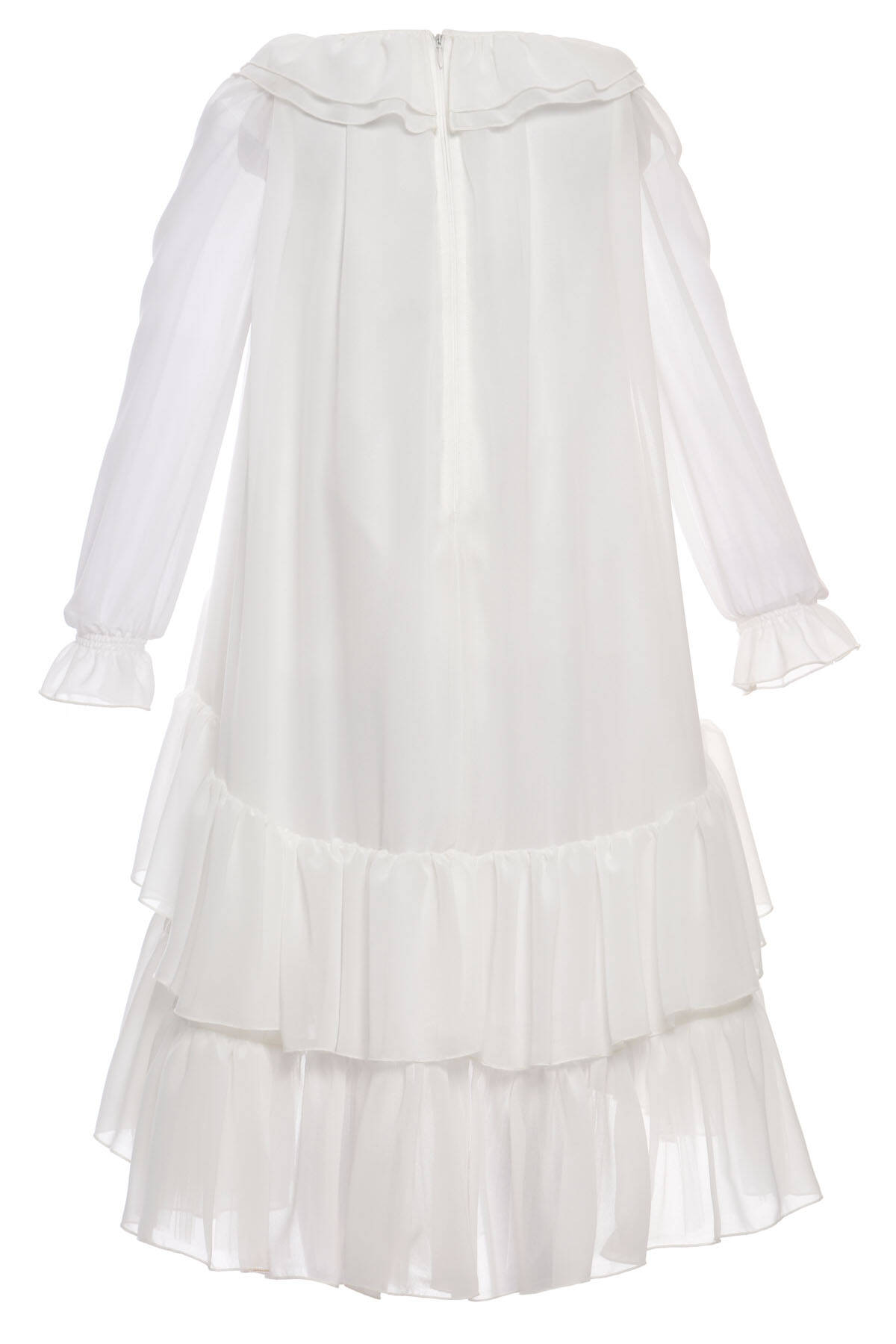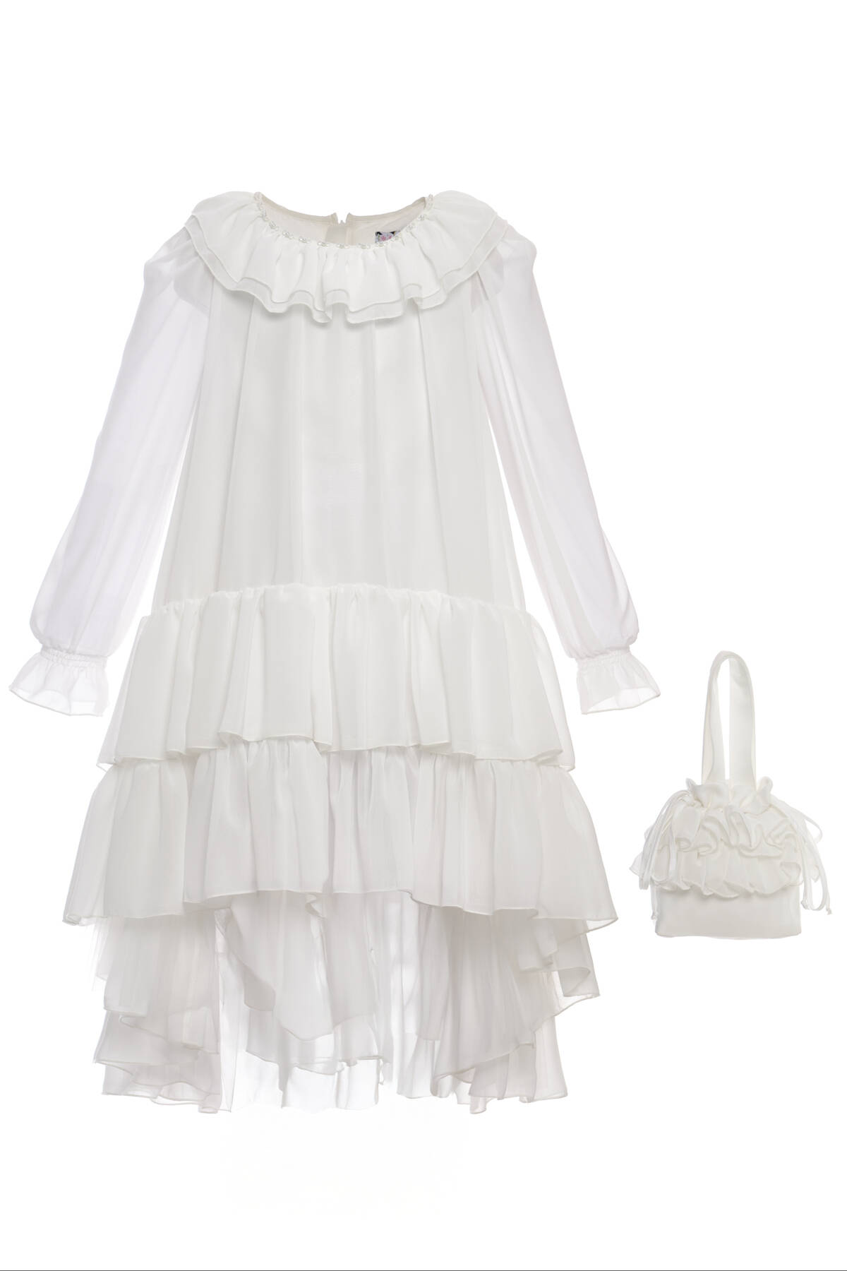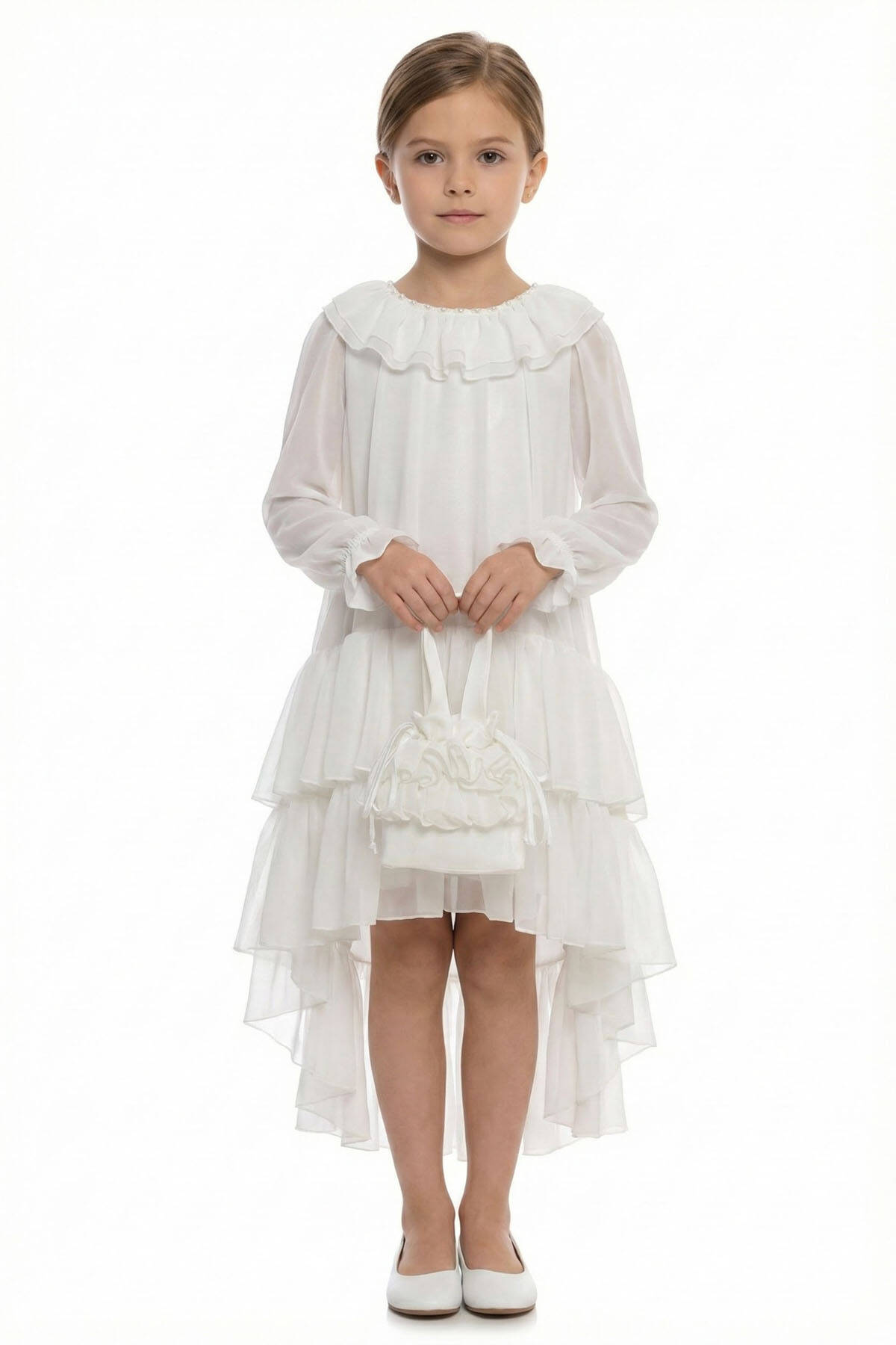 A dreamy silhouette for little girls who love to twirl! This elegant high-low dress is crafted from airy chiffon and features tiered ruffle layers that add volume and playful movement. The soft round neckline is finished with a matching ruffle trim, while the long sheer sleeves add a touch of grace. Perfect for birthdays, parties, and special celebrations, the dress comes complete with a charming matching bag adorned with ruffles. Light, comfortable, and oh-so-pretty!
